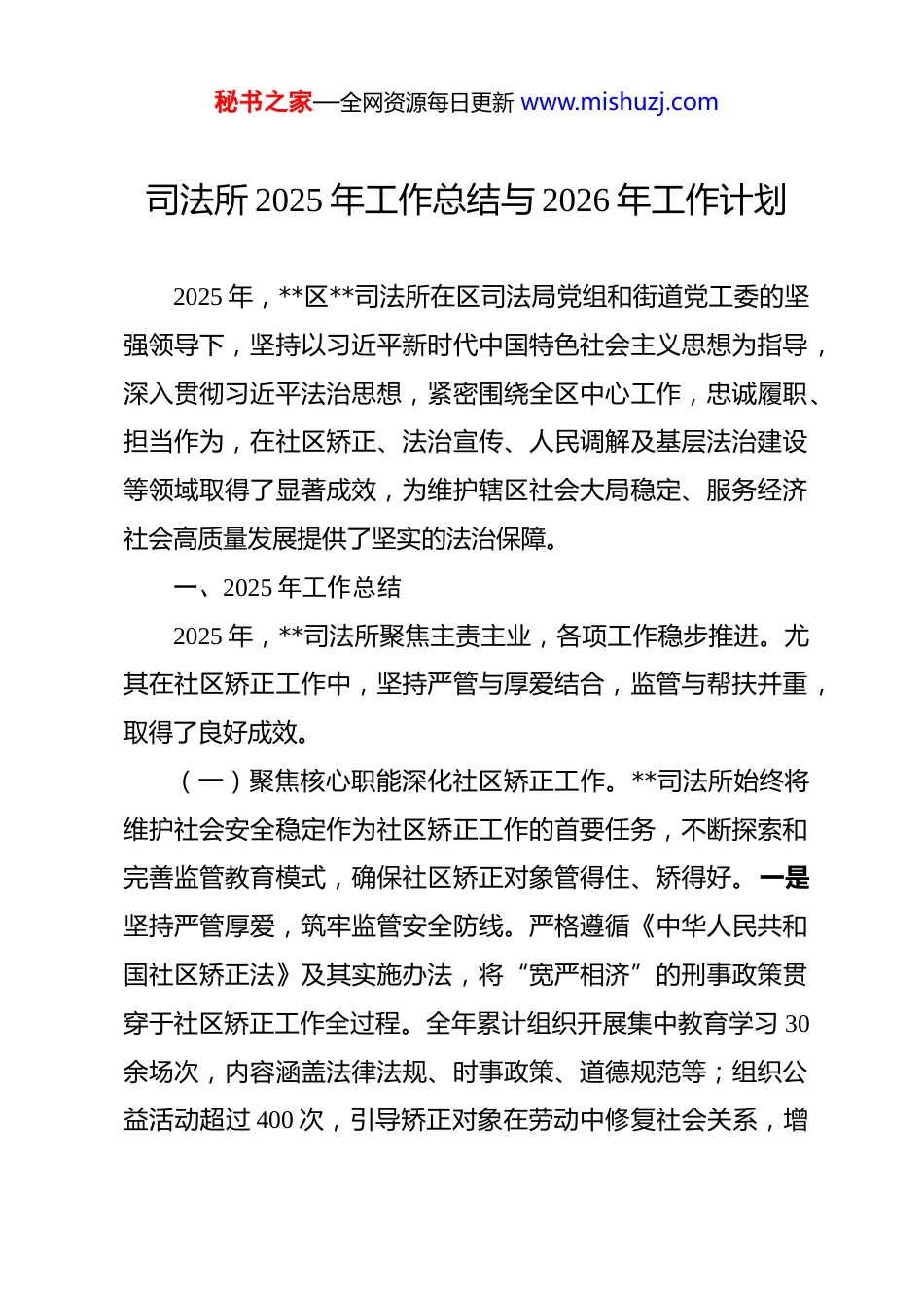 秘书之家—全网资源每日更新 www.mishuzj.com司法所 2025 年工作总结与 2026 年工作计划 2025 年,**区**司法所在区司法局党组和街道党工委的坚强领导下,坚持以习近平新时代中国特色社会主义思想为指导,深入贯彻习近平法治思想,紧密围绕全区中心工作,忠诚履职、担当作为,在社区矫正、法治宣传、人民调解及基层法治建设等领域取得了显著成效,为维护辖区社会大局稳定、服务经济社会高质量发展提供了坚实的法治保障。一、2025 年工作总结2025 年,**司法所聚焦主责主业,各项工作稳步推进。尤其在社区矫正工作中,坚持严管与厚爱结合,监管与帮扶并重,取得了良好成效。(一)聚焦核心职能深化社区矫正工作。**司法所始终将维护社会安全稳定作为社区矫正工作的首要任务,不断探索和完善监管教育模式,确保社区矫正对象管得住、矫得好。一是坚持严管厚爱,筑牢监管安全防线。严格遵循《中华人民共和国社区矫正法》及其实施办法,将“宽严相济”的刑事政策贯穿于社区矫正工作全过程。全年累计组织开展集中教育学习 30余场次,内容涵盖法律法规、时事政策、道德规范等;组织公益活动超过 400 次,引导矫正对象在劳动中修复社会关系,增秘书之家—全网资源每日更新 www.mishuzj.com强社会责任感。同时,强化日常监管,通过实地走访、信息化核查等方式,累计开展走访帮扶 231 人次,精准掌握矫正对象的思想动态和生活状况。通过融合智慧监管手段与人性化管理模式,实现了对社区矫正对象的精准、动态、有效管控,确保了监管安全与教育改造的双重成效。截至年底,全年未发生一起社区矫正对象脱管、漏管事件,未发生社区矫正对象重新犯罪案件,坚决守住了安全底线。二是突出教育帮扶,助力对象顺利回归。做好社区矫正对象的教育帮扶工作,是预防和减少犯罪、促进社会和谐的重要环节。**司法所不仅注重“管”,更着力于“扶”,积极协调社会资源,为特殊人群排忧解难。在安置帮教工作中,通过常态化动态走访,累计为 15 名生活困难的矫正对象及刑满释放人员送去生活慰问品;积极与相关部门沟通协调,成功为 1 名因病致困的对象申请到 3000 元临时救助,为 1 名因子女就学困难的对象申请到 6000 元临时救助,帮助他们解决了燃眉之急,重拾生活信心,为他们顺利融入社会创造了有利条件,有效预防了因生活无着而重新走上违法犯罪道路的风险。(二)统筹推进各项工作夯实基层法治基础。在抓好社区矫正工作的同时,**司法所统筹兼顾,全面履行基层司法行政各项职能,为法治街道建设贡献力量。一是法治宣传精准有效。秘书之家—全网资源每日更新 www.mishuzj.com坚持将法治宣传教育作为引导群众办事依法、遇事找法、解决问题用法、化解矛盾靠法的基础性工程。利用“宪法宣传周”“民法典宣传月”等重要节点,组织开展“法律明白人”讲座、院落普法课堂等活动 30 余场次,将法律条文转化为通俗易懂的“家常话”,受众达 600 余人次。针对基层治理骨干,举办专题培训 2 场,提升了“法律明白人”和网格员运用法治思维与法治方式解决实际问题的能力。全年提供“一站式”法律咨询服务 60 余次,引导群众依法理性维权。二是人民调解筑牢防线。坚持和发展新时代“枫桥经验”,依托辖区 20 个调解委员会和84 名专兼职人民调解员,健全“街道—社区—网格”三级调解网络,确保矛盾纠纷早发现、早介入、早化解。全年共排查各类矛盾纠纷 688 件,成功调处化解 216 件,调解成功率达100%,有效化解了一批物业、邻里、环境等领域的矛盾纠纷。依托“智慧调解平台”,实现矛盾纠纷排查、研判、调处全流程线上管理,提升了工作效能。三是依法行政履职尽责。积极参与街道法治建设,严格履行合法性审查职责,为街道重大决策、行政合同签订等提供法律意见,防范法律风险。同时,将信访工作纳入法治化轨道,全年核查预警信息 12 人次,依法办结平台案件 6 件、信访件 12 件,切实维护了群众合法权益和社会稳定。秘书之家—全网资源每日更新 www.mishuzj.com二、2026 年工作计划2026 年是全面推进法治中国建设的关键之年。**司法所将立足新起点,迎接新挑战,以...
