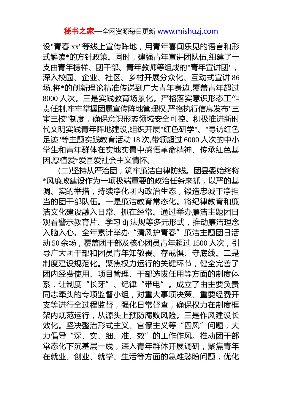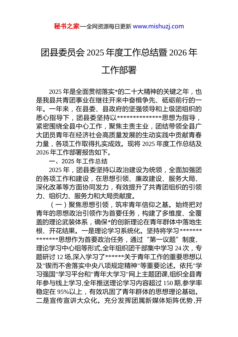 秘书之家—全网资源每日更新 www.mishuzj.com团县委员会 2025 年度工作总结暨 2026 年工作部署2025 年是全面贯彻落实*的二十大精神的关键之年,也是我县共青团事业在继往开来中奋楫争先、砥砺前行的一年。一年来,在县委、县政府的坚强领导和上级团组织的悉心指导下,团县委坚持以**************思想为指导,紧密围绕全县中心工作,聚焦主责主业,团结带领全县广大团员青年在经济社会高质量发展的生动实践中贡献青春力量,各项工作取得扎实成效。现将 2025 年度工作总结及2026 年工作部署报告如下。一、2025 年工作总结2025 年,团县委坚持以政治建设为统领,全面加强团的各项工作和建设,在思想引领、廉政建设、服务大局、深化改革等方面协同发力,有效提升了共青团组织的引领力、组织力、服务力和大局贡献度。(一)聚焦思想引领,筑牢青年信仰之基。始终把对青年的思想政治引领作为首要任务,构建了多维度、全覆盖的理论武装体系,确保*的创新理论在青年群体中落地生根、开花结果。一是理论学习系统化。坚持将学习**************思想作为首要政治任务,通过“第一议题”制度、理论学习中心组等形式,全年组织团干部集中学习 24 次,专题研讨 12 场,深入学习了******关于青年工作的重要思想以及"锲而不舍落实中央八项规定精神"等重要论述。依托"学习强国"学习平台和"青年大学习"网上主题团课,组织全县青年参与线上学习,全年推送理论学习内容超过 150 期,参学率稳定在 95%以上,有效巩固了青年群体的思想理论基础。二是宣传宣讲大众化。充分发挥团属新媒体矩阵优势,开秘书之家—全网资源每日更新 www.mishuzj.com设"青春 xx"等线上宣传阵地,用青年喜闻乐见的语言和形式解读*的方针政策。同时,建强青年宣讲团队伍,组建了一支由青年榜样、团干部、青年教师等组成的"青年宣讲团",深入校园、企业、社区、乡村开展分众化、互动式宣讲 86场,将*的创新理论精准传递到广大青年身边,覆盖青年超过8000 人次。三是实践教育场景化。严格落实意识形态工作责任制,牢牢掌握团属宣传阵地管理权,严格执行信息发布"三审三校"制度,确保意识形态领域安全可控。积极推进新时代文明实践青年阵地建设,组织开展"红色研学"、"寻访红色足迹"等主题实践教育活动 18 次,带领超过 6000 人次的中小学生和青年群体在实地实景中感悟革命精神、传承红色基因,厚植爱*爱国爱社会主义情怀。(二)坚持从严治团,筑牢廉洁自律防线。团县委始终将*风廉政建设作为一项极端重要的政治任务来抓,以严的基调、实的举措,持续净化团内政治生态,锻造忠诚干净担当的团干部队伍。一是廉洁教育常态化。将纪律教育和廉洁文化建设融入日常、抓在经常。通过举办廉洁主题团日观看警示教育片、学习 dj 法规等多元形式,推动廉洁理念入脑入心。全年累计举办“清风护青春”廉洁主题团日活动 50 余场,覆盖团干部及核心团员青年超过 1500 人次,引导广大团干部和团员青年知敬畏、存戒惧、守底线。二是制度建设规范化。聚焦权力运行的关键环节,健全完善了团内经费使用、项目管理、干部选拔任用等方面的制度体系,让制度“长牙”、纪律“带电”。成立了由主要负责同志牵头的专项监督小组,对重大事项决策、重要经费开支等进行全过程监督,强化日常督查,确保权力在制度框架内规范运行,从源头上预防腐败风险。三是作风建设长效化。坚决整治形式主义、官僚主义等“四风”问题,大力倡导“深、实、细、准、效”的工作作风。推动团干部常态化下沉基层一线,深入青年群体开展调研,聚焦青年在就业、创业、就学、生活等方面的急难愁盼问题,优化秘书之家—全网资源每日更新 www.mishuzj.com服务供给,切实提升青年群体的获得感、幸福感和满意度。(三)围绕中心大局,彰显青年担当作为。引导广大青年将个人奋斗融入全县发展大局,在经济建设、社会治理、乡村振兴等重点工作中挺膺担当,展现青春风采。一是服务经济发展有力度。实施“青年人才兴 xx”计划,举办青年创新创业大赛,成功扶持青年创业项目 15 个,提供政策咨询、导师辅导等服务超过 800 人次。组织超过 500 名返乡大学生参与“扬帆计划”...