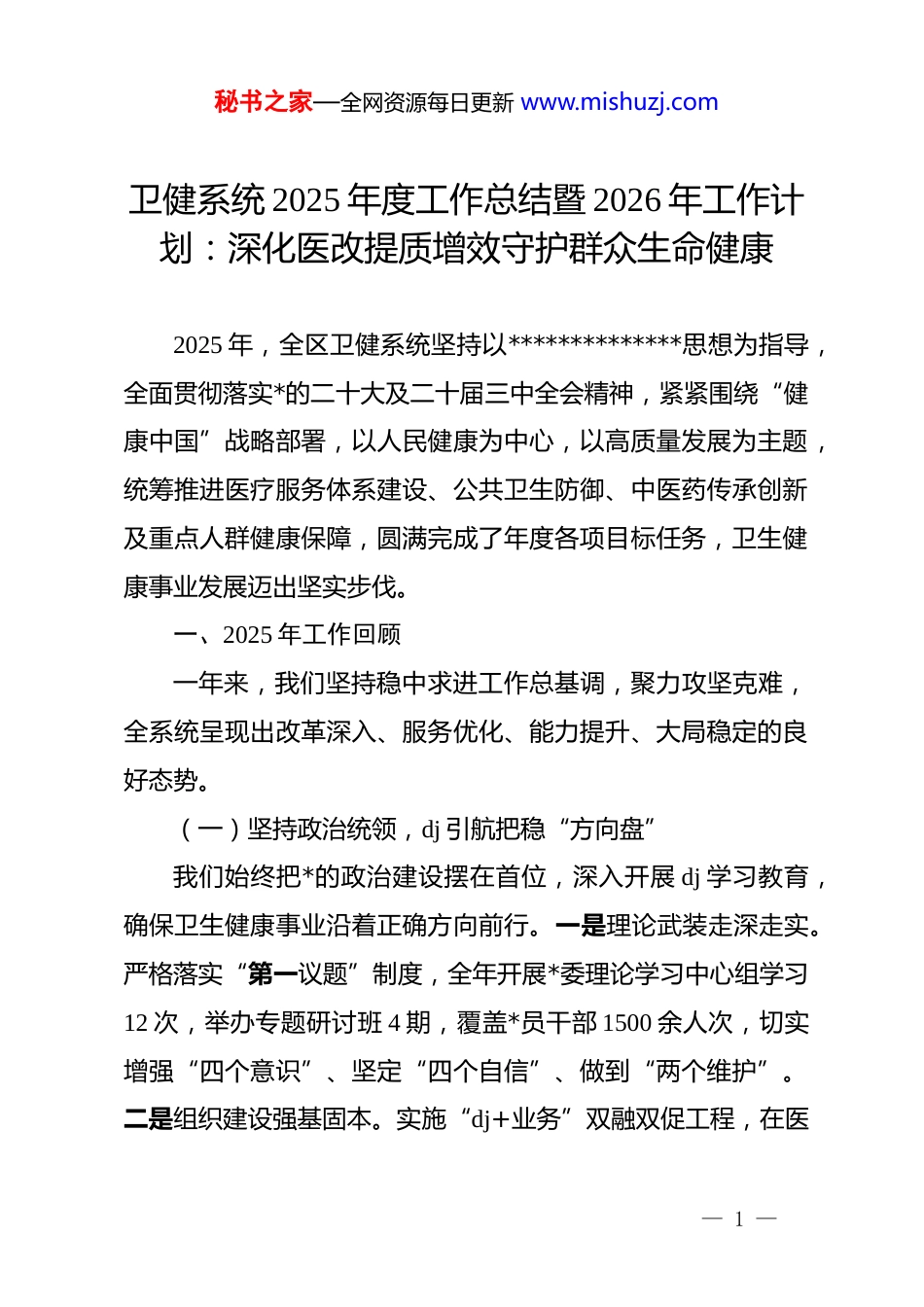 秘书之家—全网资源每日更新 www.mishuzj.com卫健系统 2025 年度工作总结暨 2026 年工作计划:深化医改提质增效守护群众生命健康2025 年,全区卫健系统坚持以**************思想为指导,全面贯彻落实*的二十大及二十届三中全会精神,紧紧围绕“健康中国”战略部署,以人民健康为中心,以高质量发展为主题,统筹推进医疗服务体系建设、公共卫生防御、中医药传承创新及重点人群健康保障,圆满完成了年度各项目标任务,卫生健康事业发展迈出坚实步伐。一、2025 年工作回顾一年来,我们坚持稳中求进工作总基调,聚力攻坚克难,全系统呈现出改革深入、服务优化、能力提升、大局稳定的良好态势。(一)坚持政治统领,dj 引航把稳“方向盘”我们始终把*的政治建设摆在首位,深入开展 dj 学习教育,确保卫生健康事业沿着正确方向前行。一是理论武装走深走实。严格落实“第一议题”制度,全年开展*委理论学习中心组学习12 次,举办专题研讨班 4 期,覆盖*员干部 1500 余人次,切实增强“四个意识”、坚定“四个自信”、做到“两个维护”。二是组织建设强基固本。实施“dj+业务”双融双促工程,在医— 1 —秘书之家—全网资源每日更新 www.mishuzj.com疗救治一线、对口支援前线设立*员先锋岗 85 个,新建公立医院*支部示范点 3 个,不仅实现了公立医院*组织全面覆盖,更将 dj 软实力转化为服务群众的硬支撑。三是行风整治动真碰硬。扎实开展医药领域腐败问题集中整治和群众身边不正之风专项整治,建立“医德医风电子档案”,实行科研诚信与医疗行为负面清单管理,全年开展廉政谈话 320 人次,退还患者红包及购物卡折合人民币约 15 万元,行业清风正气进一步充盈。(二)深化综合医改,内涵发展构筑“新高地”坚持向改革要动力,推动公立医院由规模扩张向提质增效转变。一是支付方式改革全覆盖。全面推行 drg/dip 支付方式改革,辖区内二级以上公立医院覆盖率达到 100%,病案首页质控合格率提升至 98.5%,医疗服务行为更加规范,次均住院费用同比下降 4.2%,有效减轻了群众就医负担。二是医共体建设紧密化。紧密型县域医共体建设取得实质性突破,建成影像、检验、心电、病理、消毒供应“五大共享中心”,实现基层检查、上级诊断、结果互认。全年下沉专家资源 2300 余人次,县域内就诊率提升至 92.8%,初步实现“大病不出县”目标。三是临床专科能力提升。实施临床重点专科“腾飞计划”,新增市级重点专科 2 个,建成胸痛、卒中、创伤三大中心各 1 个,急危重症救治成功率提高 3.5 个百分点,区域医疗技术水平显— 2 —秘书之家—全网资源每日更新 www.mishuzj.com著增强。(三)聚焦公卫安全,医防融合织密“防护网”坚持预防为主方针,不断完善重大疫情防控体制机制。一是监测预警灵敏高效。升级多点触发传染病监测预警系统,将监测哨点延伸至学校、药店及养老机构,全年有效处置聚集性疫情苗头 12 起,甲乙类传染病发病率控制在国家标准线以下。二是慢病管理精准规范。深化“三高共管”模式,建立高血压、糖尿病、高血脂患者全周期健康管理档案,全区慢病规范管理率达到 88.6%,家庭医生签约服务覆盖率达到 65%,重点人群签约率突破 90%,履约服务质量显著提升。三是爱国卫生运动深入开展。扎实推进卫生城镇创建与健康细胞建设,新增健康社区(村)8 个、健康企业 5 家,无烟*政机关建成率达到100%,居民健康素养水平提升至 31.5%,群众自我保健意识明显增强。(四)夯实基层基础,分级诊疗激活“神经末”把工作重点放在农村和社区,着力解决医疗资源分布不均问题。一是基础设施全面提档。投入专项资金 3500 万元,完成4 家乡镇卫生院标准化改造和 12 个村卫生室公有化建设,新增ct、dr 等大型设备 6 台,基层医疗机构硬件条件焕然一新。二是人才队伍双向流动。实施“县聘乡用”和“乡聘村用”机制,— 3 —秘书之家—全网资源每日更新 www.mishuzj.com选派 30 名业务骨干下沉基层开展驻点帮扶,同时组织 50 名基层医务人员上挂进修。全年开展全科医生转岗培训、乡村医生适宜技术培训 1200 人次,基层医疗服务“软...