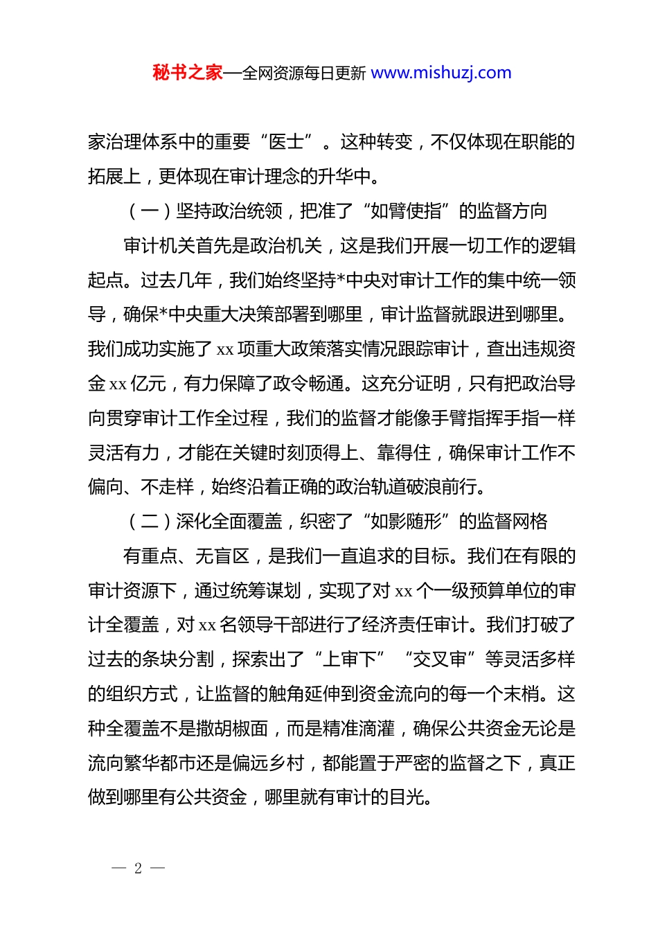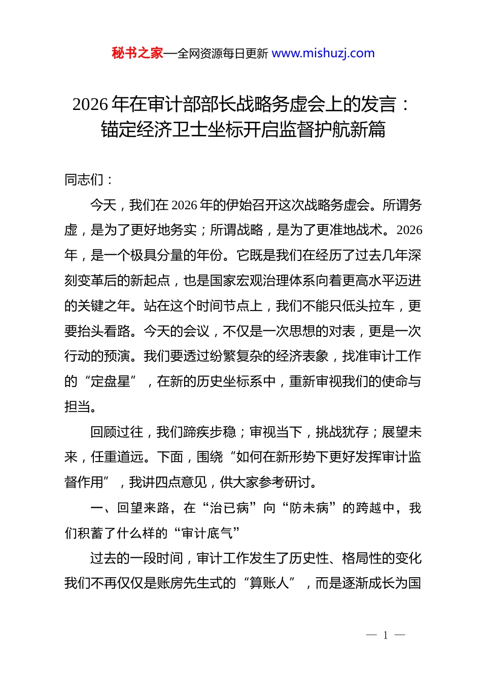 秘书之家—全网资源每日更新 www.mishuzj.com2026 年在审计部部长战略务虚会上的发言:锚定经济卫士坐标开启监督护航新篇同志们:今天,我们在 2026 年的伊始召开这次战略务虚会。所谓务虚,是为了更好地务实;所谓战略,是为了更准地战术。2026年,是一个极具分量的年份。它既是我们在经历了过去几年深刻变革后的新起点,也是国家宏观治理体系向着更高水平迈进的关键之年。站在这个时间节点上,我们不能只低头拉车,更要抬头看路。今天的会议,不仅是一次思想的对表,更是一次行动的预演。我们要透过纷繁复杂的经济表象,找准审计工作的“定盘星”,在新的历史坐标系中,重新审视我们的使命与担当。回顾过往,我们蹄疾步稳;审视当下,挑战犹存;展望未来,任重道远。下面,围绕“如何在新形势下更好发挥审计监督作用”,我讲四点意见,供大家参考研讨。一、回望来路,在“治已病”向“防未病”的跨越中,我们积蓄了什么样的“审计底气”过去的一段时间,审计工作发生了历史性、格局性的变化我们不再仅仅是账房先生式的“算账人”,而是逐渐成长为国— 1 —秘书之家—全网资源每日更新 www.mishuzj.com家治理体系中的重要“医士”。这种转变,不仅体现在职能的拓展上,更体现在审计理念的升华中。(一)坚持政治统领,把准了“如臂使指”的监督方向审计机关首先是政治机关,这是我们开展一切工作的逻辑起点。过去几年,我们始终坚持*中央对审计工作的集中统一领导,确保*中央重大决策部署到哪里,审计监督就跟进到哪里。我们成功实施了 xx 项重大政策落实情况跟踪审计,查出违规资金 xx 亿元,有力保障了政令畅通。这充分证明,只有把政治导向贯穿审计工作全过程,我们的监督才能像手臂指挥手指一样灵活有力,才能在关键时刻顶得上、靠得住,确保审计工作不偏向、不走样,始终沿着正确的政治轨道破浪前行。(二)深化全面覆盖,织密了“如影随形”的监督网格有重点、无盲区,是我们一直追求的目标。我们在有限的审计资源下,通过统筹谋划,实现了对 xx 个一级预算单位的审计全覆盖,对 xx 名领导干部进行了经济责任审计。我们打破了过去的条块分割,探索出了“上审下”“交叉审”等灵活多样的组织方式,让监督的触角延伸到资金流向的每一个末梢。这种全覆盖不是撒胡椒面,而是精准滴灌,确保公共资金无论是流向繁华都市还是偏远乡村,都能置于严密的监督之下,真正做到哪里有公共资金,哪里就有审计的目光。— 2 —秘书之家—全网资源每日更新 www.mishuzj.com(三)强化权威高效,磨砺了“如雷贯耳”的监督利剑审计的威力在于揭示问题,更在于整改落实。我们坚决破除“屡审屡犯”的顽疾,建立健全了审计整改长效机制,推动建立整改台账 xx 份,促进增收节支 xx 亿元。我们敢于向积存已久的顽瘴痼疾亮剑,查处了一批有影响力的重大违纪违法问题线索,并移送司法机关处理。如今,审计监督的威慑力显著增强,各级各部门对审计指出的问题不再是敷衍塞责,而是闻过则喜、立行立改。这种权威性,是我们用一个个详实的数据、一份份扎实的报告拼出来的,也是我们开展下一步工作最宝贵的资产。二、审视当下,在“深水区”与“攻坚期”的叠加下,我们面临着什么样的“审计考题”2026 年,宏观环境依然错综复杂,改革进入深水区,利益固化藩篱亟待打破。审计工作面临的外部环境、对象特征、技术手段都在发生深刻变化,这对我们的履职能力提出了全新的挑战。(一)面对风险隐患的“变异性”,如何练就穿透迷雾的火眼金睛当前的经济金融风险呈现出跨区域、跨行业、跨市场的特点,隐蔽性极强。违规手段正在从简单的做假账向复杂的资本— 3 —秘书之家—全网资源每日更新 www.mishuzj.com运作、关联交易、隐性债务等方向演变,披上了合法合规的“隐身衣”。比如,在一些重大项目中,资金挪用手段更加数字化、链条化,稍不留神就会从我们眼皮底下溜走。我们现在的手段,是否跟得上这些“变异”的速度?我们的审计人员,是否具备穿透层层迷雾、直击问题本质的敏锐度?这是摆在我们面前的第一道必答题。如果看不清风险,我们就无法履行好经济卫士的职责。(二)面对数据...