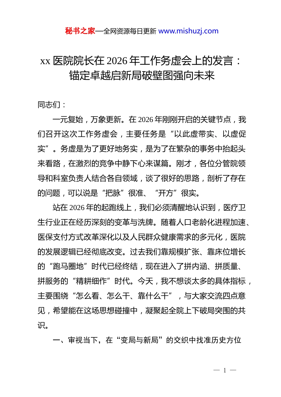 秘书之家—全网资源每日更新 www.mishuzj.comxx 医院院长在 2026 年工作务虚会上的发言:锚定卓越启新局破壁图强向未来同志们:一元复始,万象更新。在 2026 年刚刚开启的关键节点,我们召开这次工作务虚会,主要任务是“以此虚带实、以虚促实”。务虚是为了更好地务实,是为了在繁杂的事务中抬起头来看路,在激烈的竞争中静下心来谋篇。刚才,各位分管院领导和科室负责人结合各自领域,谈了很好的思路,剖析了存在的问题,可以说是“把脉”很准、“开方”很实。站在 2026 年的起跑线上,我们必须清醒地认识到,医疗卫生行业正在经历深刻的变革与洗牌。随着人口老龄化进程加速、医保支付方式改革深化以及人民群众健康需求的多元化,医院的发展逻辑已经彻底改变。过去我们靠规模扩张、靠床位增长的“跑马圈地”时代已经终结,现在进入了拼内涵、拼质量、拼服务的“精耕细作”时代。今天,我不想谈太多的具体指标,主要围绕“怎么看、怎么干、靠什么干”,与大家交流四点意见,希望能在这场思想碰撞中,凝聚起全院上下破局突围的共识。一、审视当下,在“变局与新局”的交织中找准历史方位— 1 —秘书之家—全网资源每日更新 www.mishuzj.com2026 年是新的开局之年,也是医院转型发展的攻坚之年。我们不能只低头拉车,必须抬头看天,准确把握当前面临的时与势,在不确定性中寻找确定的发展路径。(一)要把准“提质增效”的时代脉搏当前,公立医院高质量发展考核(国考)这根指挥棒挥舞得越来越有力,drg/dip 支付改革倒逼我们必须勒紧裤腰带过日子,同时还要把日子过好。这看似是一对矛盾,实则是对医院管理能力的极限挑战。我们必须清醒地看到,过去那种“大处方、大检查”的粗放增长模式不仅行不通,更是死路一条。我们要彻底摒弃“规模情结”,转向“价值医疗”,要把目光从单纯的收入增长转移到 cmi 值、四级手术占比、微创手术率等核心指标上来。2026 年,我们要将“含金量”作为衡量一切工作的首要标准,确保每一份病历都经得起检查,每一次诊疗都体现出技术价值,真正实现由量的积累向质的飞跃转变。(二)要直面“前甩后追”的竞争态势环顾四周,我们面临的竞争环境可谓是“强邻环伺”。省内头部医院正在加速虹吸优质资源,周边的县市级医院也在通过差异化发展迅速崛起,民营医疗机构更是凭借灵活的机制在专科领域分切蛋糕。我们在部分优势学科上虽然有一定积累,但“护城河”还不够深,“杀手锏”还不够多。有的科室躺在— 2 —秘书之家—全网资源每日更新 www.mishuzj.com过去的功劳簿上吃老本,技术更新缓慢;有的学科带头人缺乏危机感,在这场不进则退的赛跑中已经显露疲态。我们必须时刻保持一种“如临深渊、如履薄冰”的紧迫感,如果不加速奔跑,今天的第一梯队,明天就可能掉队,甚至被边缘化。(三)要抢抓“数智融合”的转型窗口科技革命正在重塑医疗行业,人工智能、大数据、物联网等新技术不再是遥远的概念,而是已经嵌入诊疗全流程的实战工具。智慧医院建设不是装几个系统、买几台设备那么简单,而是一场流程再造和管理革命。我们要敏锐地捕捉这一机遇,利用数字化手段打通医疗服务的堵点和难点。比如,如何通过ai 辅助诊断提高效率?如何利用大数据进行精准的运营分析?2026 年,我们要把“数智化”作为驱动发展的核心引擎,让数据多跑路,让患者少跑腿,让医生从繁琐的事务性工作中解放出来,回归医疗本位。二、聚焦内涵,在“高原与高峰”的统筹中构筑学科高地学科是医院的命脉,技术是医院的脊梁。没有强大的学科群,医院就是一副空架子;没有顶尖的技术,我们就没有话语权。2026 年,我们必须坚持“学科立院”,集中优势兵力打歼灭战。(一)要全力打造“顶天立地”的学科集群— 3 —秘书之家—全网资源每日更新 www.mishuzj.com我们不能搞平均主义的“撒胡椒面”,必须实施非均衡发展战略。一方面,要集中全院的人、财、物资源,遴选 xx 个具备冲击国家级、省级重点专科潜力的优势学科,实施“登峰计划”。对这些学科,要给政策、给特权、给空间,支持他们挑战高难度手术,攻克疑难杂症,打造一批在区域内叫得响、立得住的“...