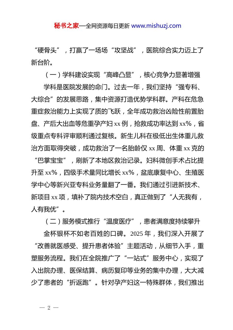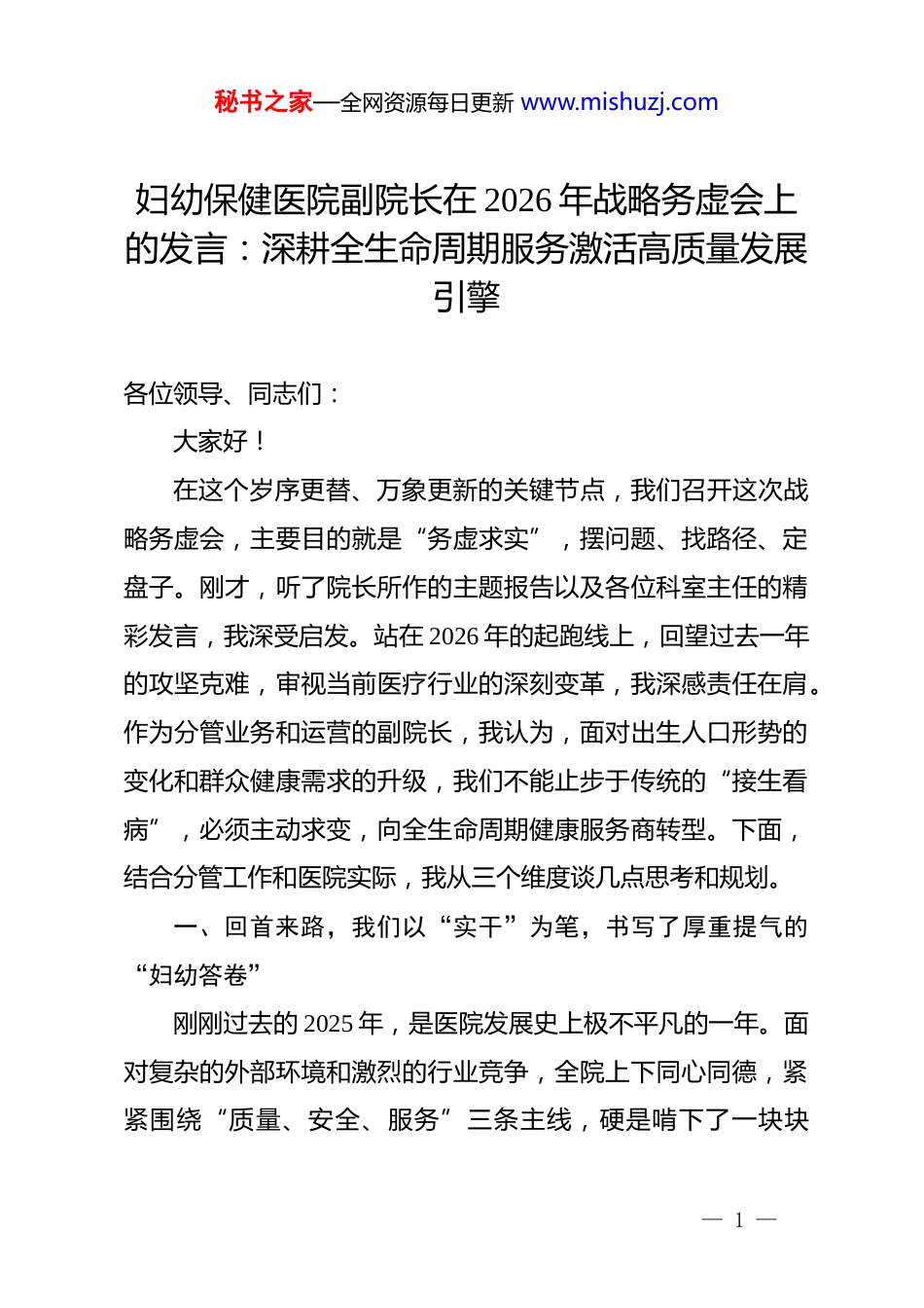 秘书之家—全网资源每日更新 www.mishuzj.com妇幼保健医院副院长在 2026 年战略务虚会上的发言:深耕全生命周期服务激活高质量发展引擎各位领导、同志们:大家好!在这个岁序更替、万象更新的关键节点,我们召开这次战略务虚会,主要目的就是“务虚求实”,摆问题、找路径、定盘子。刚才,听了院长所作的主题报告以及各位科室主任的精彩发言,我深受启发。站在 2026 年的起跑线上,回望过去一年的攻坚克难,审视当前医疗行业的深刻变革,我深感责任在肩。作为分管业务和运营的副院长,我认为,面对出生人口形势的变化和群众健康需求的升级,我们不能止步于传统的“接生看病”,必须主动求变,向全生命周期健康服务商转型。下面,结合分管工作和医院实际,我从三个维度谈几点思考和规划。一、回首来路,我们以“实干”为笔,书写了厚重提气的“妇幼答卷”刚刚过去的 2025 年,是医院发展史上极不平凡的一年。面对复杂的外部环境和激烈的行业竞争,全院上下同心同德,紧紧围绕“质量、安全、服务”三条主线,硬是啃下了一块块— 1 —秘书之家—全网资源每日更新 www.mishuzj.com“硬骨头”,打赢了一场场“攻坚战”,医院综合实力迈上了新台阶。(一)学科建设实现“高峰凸显”,核心竞争力显著增强学科是医院发展的命门。过去一年,我们坚持“强专科、大综合”的发展思路,集中资源打造优势学科群。产科在危急重症救治能力上实现了质的飞跃,全年成功救治凶险性前置胎盘、产后大出血等危重孕产妇 xx 例,抢救成功率达到 xx%,省级重点专科评审顺利通过复核。新生儿科在极低出生体重儿救治方面取得突破,成功救治了一名胎龄仅 xx 周、体重 xx 克的“巴掌宝宝”,刷新了本地区救治记录。妇科微创手术占比提升至 xx%,四级手术量同比增长 xx%,盆底康复中心、生殖医学中心等新兴亚专科业务量翻了一番。我们通过引进新技术、新项目 xx 项,填补了院内技术空白,真正做到了“人无我有,人有我优”。(二)服务模式推行“温度医疗”,患者满意度持续攀升金杯银杯不如老百姓的口碑。2025 年,我们深入开展了“改善就医感受、提升患者体验”主题活动,从细节入手,重塑服务流程。我们在全院推广了“一站式”服务中心,实现了入出院办理、医保结算、病历复印等业务的集中办理,大大减少了患者的“折返跑”。针对孕产妇这一特殊群体,我们推出— 2 —秘书之家—全网资源每日更新 www.mishuzj.com了“袋鼠式”护理、产房家属陪伴分娩、产后康复上门服务等特色举措,让医疗服务更有温度。特别是在儿科门诊高峰期,我们通过弹性排班、增设夜间门诊、优化输液流程等措施,有效缓解了“排队长、看病难”问题。全年门诊患者满意度达到xx%,住院患者满意度达到 xx%,收到锦旗和感谢信 xx 件,医院品牌形象得到了社会各界的广泛认可。(三)运营管理深化“精益管理”,内涵式发展初见成效在医保支付方式改革的大背景下,精细化运营成为生存之道。过去一年,我们成立了运营管理部,建立了科室运营助理制度,将管理触角延伸到临床一线。通过全面推行 drg(按疾病诊断相关分组)付费管理,我们对病案首页质量、临床路径入径率、次均费用等关键指标进行了全过程监控和干预。全年药占比同比下降 xx 个百分点,耗材占比下降 xx 个百分点,平均住院日缩短了 xx 天,医疗服务收入占比提升至 xx%。通过节能降耗专项行动,万元收入能耗支出同比下降 xx%,在保证医疗质量的前提下,有效控制了运行成本,实现了从“规模扩张”向“提质增效”的转变。二、审视当下,我们以“清醒”为镜,照见了转型发展的“痛点难点”成绩属于过去,未来任重道远。在看到成绩的同时,我们— 3 —秘书之家—全网资源每日更新 www.mishuzj.com必须保持清醒的头脑,深刻认识到当前医院发展面临的严峻挑战和深层次矛盾。如果对这些问题视而不见,我们的发展之路就会越走越窄。(一)人口红利消退引发“存量博弈”,业务增长面临天花板随着出生人口数量的持续下降,产科分娩量不可避免地出现萎缩,这是全国妇幼保健机构共同面临的“寒冬”。2025 年,虽然我们通过提升服务抢占了一部分市场份额...