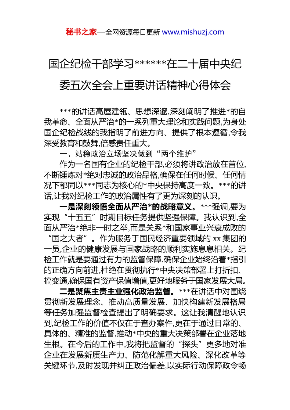 秘书之家—全网资源每日更新 www.mishuzj.com国企纪检干部学习******在二十届中央纪委五次全会上重要讲话精神心得体会***的讲话高屋建瓴、思想深邃,深刻阐明了推进*的自我革命、全面从严治*的一系列重大理论和实践问题,为身处国企纪检战线的我指明了前进方向、提供了根本遵循,令我深受教育和鼓舞,倍感责任重大。一、站稳政治立场坚决做到“两个维护”作为一名国有企业的纪检干部,必须将讲政治放在首位,不断锤炼对*绝对忠诚的政治品格,确保在任何时候、任何情况下都同以***同志为核心的*中央保持高度一致。***的讲话,让我对纪检工作的政治属性有了更为深刻的认识。一是深刻领悟全面从严治*的战略意义。***强调,要为实现“十五五”时期目标任务提供坚强保障。我认识到,全面从严治*绝非一时之举,而是关系*和国家事业兴衰成败的“国之大者”。作为服务于国民经济重要领域的 xx 集团的一员,企业的健康发展与国家战略的顺利实施息息相关。纪检工作就是要通过有力的监督保障,确保企业始终沿着*指引的正确方向前进,杜绝在贯彻执行*中央决策部署上打折扣、搞变通,确保国有资产保值增值,更好地服务于国家发展大局。二是聚焦主责主业强化政治监督。***在讲话中对围绕贯彻新发展理念、推动高质量发展、加快构建新发展格局等任务加强监督检查提出了明确要求。这让我清醒地认识到,纪检工作的价值不仅在于查办案件,更在于通过日常的、具体的、精准的监督,推动*中央的重大决策部署在企业落地生根。在今后的工作中,我将把监督的“探头”更多地对准企业在发展新质生产力、防范化解重大风险、深化改革等关键环节,及时发现并纠正政治偏差,以实际行动保障政令畅秘书之家—全网资源每日更新 www.mishuzj.com通,服务企业高质量发展。三是在自我革命中淬炼*性修养。***指出,*的自我革命重在治权。这不仅是对*组织的宏观要求,更是对每一名*员干部的微观告诫。作为纪检干部,我更应当时刻以*的自我革命精神检视自身,不断加强*性锻炼和思想改造。这意味着要主动投身到严肃的*内政治生活中去,常用批评和自我批评的武器打扫思想上的灰尘,始终保持共产*人的政治本色,做到心有所畏、言有所戒、行有所止。二、勇于担当作为提升监督执纪效能面对新时代新征程对纪检工作提出的更高要求,必须直面挑战,不断增强斗争精神和斗争本领,以过硬的能力素质履行好*和人民赋予的神圣职责。***的讲话,为提升履职能力提供了清晰的“路线图”和“方法论”。一是清醒认识反腐败斗争的严峻复杂形势。***强调,当前反腐败斗争形势仍然严峻复杂。结合近年来的通报案例和工作实际,我深切感到,腐败问题的隐蔽性、复杂性、危害性正在增加,一些新型腐败和隐性腐败交织,诸如“影子公司”“期权腐败”等新动向新特点给监督执纪工作带来了前所未有的挑战。这要求我必须时刻保持清醒和坚定,彻底摒弃“歇歇脚、松口气”的错误思想,以“永远在路上”的执着,将反腐败斗争进行到底。二是坚持把权力关进制度的笼子里。***将“把权力关进制度笼子”作为新时代全面从严治*的重要任务,让我对监督工作的根本目的有了更深的理解。纪检工作的目标,不仅仅是惩治已经发生的腐败行为,更重要的是通过监督推动制度完善,实现源头治理。在 xx 单位,工程建设、物资采购、投资并购等是权力集中、风险易发的领域。我必须把更多精力投入到事前、事中的监督上,推动完善内控制度,强化对关键岗位、关键人员的监督,让权力在阳光下运行,从根本上铲除腐败滋生的土壤。三是贯通运用“四种形态”做到抓早抓小。***关于反秘书之家—全网资源每日更新 www.mishuzj.com腐败斗争要一体推进“不敢腐、不能腐、不想腐”的重要论述,让我对监督执纪的方式方法有了新的思考。惩前毖后、治病救人是*的一贯方针。在日常监督中,我将更加注重运用“第一种形态”,对苗头性、倾向性问题及时提醒、批评教育,让“红脸出汗”成为常态。这既是对干部的严管,更是厚爱。通过精准运用“四种形态”,努力实现政治效果、纪法效果和社会效果的有机统一,维护好企业风清气正的政治生态。三、永葆清廉本色做到自身正自身硬纪检监察机关不是“保险箱”,纪检监察干部没有天然的“免疫力”。***对纪检监察队...