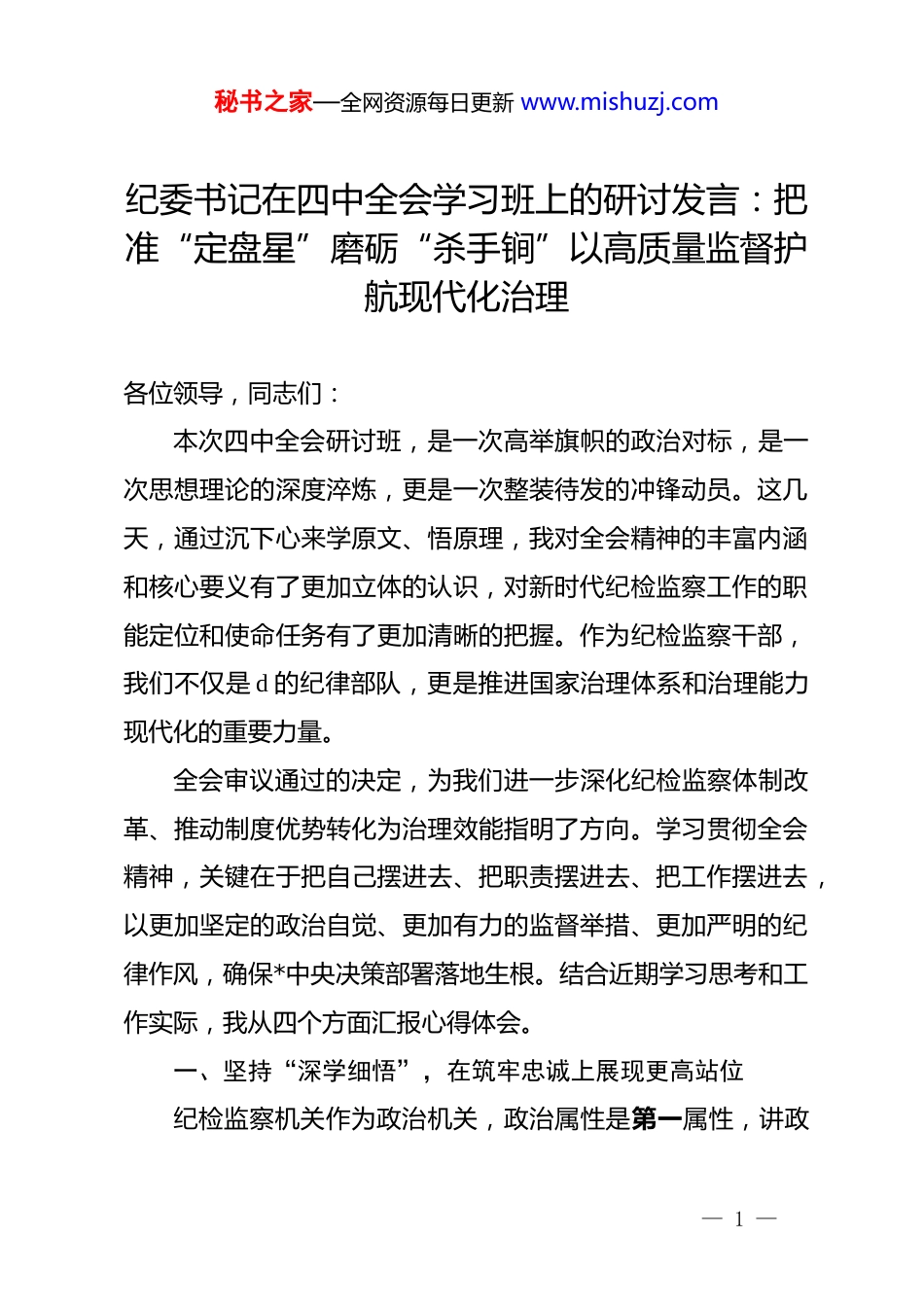 秘书之家—全网资源每日更新 www.mishuzj.com纪委书记在四中全会学习班上的研讨发言:把准“定盘星”磨砺“杀手锏”以高质量监督护航现代化治理各位领导,同志们:本次四中全会研讨班,是一次高举旗帜的政治对标,是一次思想理论的深度淬炼,更是一次整装待发的冲锋动员。这几天,通过沉下心来学原文、悟原理,我对全会精神的丰富内涵和核心要义有了更加立体的认识,对新时代纪检监察工作的职能定位和使命任务有了更加清晰的把握。作为纪检监察干部,我们不仅是 d 的纪律部队,更是推进国家治理体系和治理能力现代化的重要力量。全会审议通过的决定,为我们进一步深化纪检监察体制改革、推动制度优势转化为治理效能指明了方向。学习贯彻全会精神,关键在于把自己摆进去、把职责摆进去、把工作摆进去,以更加坚定的政治自觉、更加有力的监督举措、更加严明的纪律作风,确保*中央决策部署落地生根。结合近期学习思考和工作实际,我从四个方面汇报心得体会。一、坚持“深学细悟”,在筑牢忠诚上展现更高站位纪检监察机关作为政治机关,政治属性是第一属性,讲政— 1 —秘书之家—全网资源每日更新 www.mishuzj.com治是第一位的要求。贯彻落实四中全会精神,首要任务就是要在学懂弄通做实上下功夫,不断提高政治判断力、政治领悟力、政治执行力,确保纪检监察工作始终沿着正确的政治方向前进。(一)铸牢思想之魂,把稳政治“方向盘”理论上的清醒是政治上坚定的前提。我们要把学习贯彻全会精神作为当前和今后一个时期的重大政治任务,坚持原原本本学、全面系统学、联系实际学。要深刻领会全会提出的新思想、新论断、新要求,特别是关于全面从严治*、完善*和国家监督体系的重要论述,切实增强“四个意识”、坚定“四个自信”、做到“两个维护”。这种学习不能停留在口头上、纸面上,而要内化于心、外化于行,将其转化为坚定理想信念、锤炼*性修养的强大动力,转化为指导实践、推动工作的具体举措,确保在任何时候、任何情况下都做到政治信仰不变、政治立场不移、政治方向不偏。(二)强化对标对表,校准行动“刻度尺”学习的目的全在于运用。我们要自觉同*中央要求对标对表,时刻关注*中央在关心什么、强调什么,深刻领会什么是*和国家最重要的利益、什么是最需要坚定维护的立场。要紧密结合纪检监察工作实际,把全会精神落实到监督执纪问责的全过程、各方面。要通过学习,进一步厘清工作思路,找准履职尽责的— 2 —秘书之家—全网资源每日更新 www.mishuzj.com切入点和着力点,及时校正工作偏差,确保我们的每一项决策、每一个案件、每一次监督都符合*中央精神,符合法治原则,符合人民群众期待,真正做到*中央提倡的坚决响应、*中央决定的坚决执行、*中央禁止的坚决不做。(三)严守政治纪律,筑牢信仰“压舱石”政治纪律是*最根本、最重要的纪律。纪检监察干部身处反腐败斗争一线,必须在遵守政治纪律和政治规矩上标准更高、要求更严。我们要带头维护*章*规 dj 的严肃性,坚决同一切违背全会精神、破坏*的集中统一领导的言行作斗争。要时刻保持清醒头脑,增强政治敏锐性和政治鉴别力,善于从政治上观察和分析问题,在重大原则问题上旗帜鲜明、立场坚定。要严格执行重大事项请示报告制度,任何工作都要自觉置于*的绝对领导之下,做政治上的明白人、老实人,以实际行动诠释对*的绝对忠诚。二、聚焦“国之大者”,在强化监督上体现更强担当监督是纪委监委的基本职责、第一职责。四中全会强调要健全*和国家监督体系,强化对权力运行的制约和监督。我们要准确把握监督的重点和关键,推动政治监督具体化、精准化、常态化,做实日常监督,以高质量监督保障高质量发展。(一)紧盯关键少数,牵住责任“牛鼻子”— 3 —秘书之家—全网资源每日更新 www.mishuzj.com“一把手”和领导班子是*的事业发展的“领头雁”,也是监督的重中之重。我们要把加强对“一把手”和领导班子监督作为重中之重,通过强化上级纪委同下级*组织“一把手”谈话、开展述责述廉、严格执行插手干预重大事项记录制度等方式,层层传导压力,督促其严于律己、严负其责、严管所辖。要完善权力运行监督机制,...