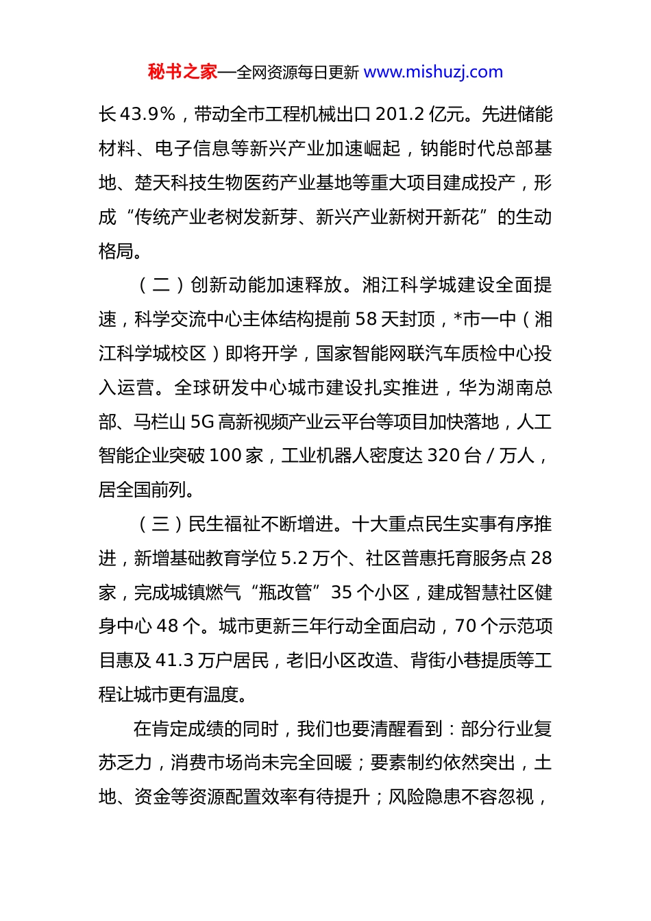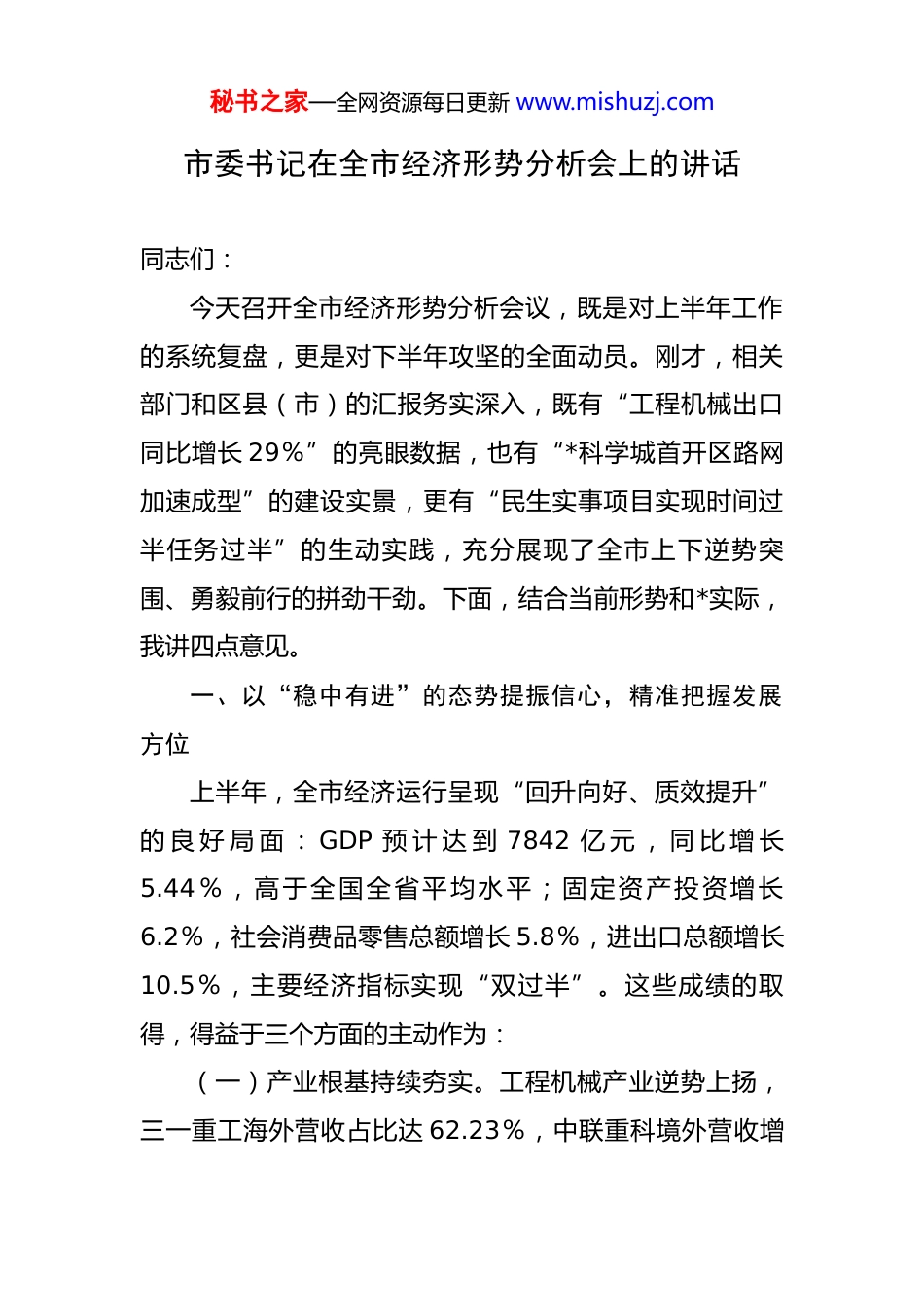 秘书之家—全网资源每日更新 www.mishuzj.com市委书记在全市经济形势分析会上的讲话 同志们:今天召开全市经济形势分析会议,既是对上半年工作的系统复盘,更是对下半年攻坚的全面动员。刚才,相关部门和区县(市)的汇报务实深入,既有“工程机械出口同比增长 29%”的亮眼数据,也有“*科学城首开区路网加速成型”的建设实景,更有“民生实事项目实现时间过半任务过半”的生动实践,充分展现了全市上下逆势突围、勇毅前行的拼劲干劲。下面,结合当前形势和*实际,我讲四点意见。一、以“稳中有进”的态势提振信心,精准把握发展方位上半年,全市经济运行呈现“回升向好、质效提升”的 良 好 局 面 : GDP 预 计 达 到 7842 亿 元 , 同 比 增 长5.44%,高于全国全省平均水平;固定资产投资增长6.2%,社会消费品零售总额增长 5.8%,进出口总额增长10.5%,主要经济指标实现“双过半”。这些成绩的取得,得益于三个方面的主动作为:(一)产业根基持续夯实。工程机械产业逆势上扬,三一重工海外营收占比达 62.23%,中联重科境外营收增秘书之家—全网资源每日更新 www.mishuzj.com长 43.9%,带动全市工程机械出口 201.2 亿元。先进储能材料、电子信息等新兴产业加速崛起,钠能时代总部基地、楚天科技生物医药产业基地等重大项目建成投产,形成“传统产业老树发新芽、新兴产业新树开新花”的生动格局。(二)创新动能加速释放。湘江科学城建设全面提速,科学交流中心主体结构提前 58 天封顶,*市一中(湘江科学城校区)即将开学,国家智能网联汽车质检中心投入运营。全球研发中心城市建设扎实推进,华为湖南总部、马栏山 5G 高新视频产业云平台等项目加快落地,人工智能企业突破 100 家,工业机器人密度达 320 台/万人,居全国前列。(三)民生福祉不断增进。十大重点民生实事有序推进,新增基础教育学位 5.2 万个、社区普惠托育服务点 28家,完成城镇燃气“瓶改管”35 个小区,建成智慧社区健身中心 48 个。城市更新三年行动全面启动,70 个示范项目惠及 41.3 万户居民,老旧小区改造、背街小巷提质等工程让城市更有温度。在肯定成绩的同时,我们也要清醒看到:部分行业复苏乏力,消费市场尚未完全回暖;要素制约依然突出,土地、资金等资源配置效率有待提升;风险隐患不容忽视,秘书之家—全网资源每日更新 www.mishuzj.com安全生产、债务化解等任务艰巨。这些问题必须引起高度重视,在下半年工作中靶向施策、精准破解。二、以“精准发力”的举措攻坚突破,全面夯实发展根基当前,经济运行正处于“爬坡过坎”的关键阶段。我们要紧扣“做优增量、盘活存量、提升质量”主线,重点抓好五个方面工作:(一)聚焦产业升级,筑牢实体经济根基。一是做强先进制造业集群。深入实施“产业质效倍增年”行动,推动工程机械向“智能化、绿色化、服务化”转型,支持三一重工、中联重科等龙头企业拓展海外市场,力争全年出口突破 500 亿元。加快建设全球研发中心城市,依托湘江科学城、岳麓山大学科技城等平台,推动人工智能、量子科技等前沿技术与制造业深度融合,培育 3-5 个国家级产业创新中心。二是做优现代服务业。大力发展生产性服务业,加快建设国家物流枢纽城市,推进金霞保税物流中心、传化智联等项目建设,打造“通道+枢纽+网络”现代物流体系。积极培育生活性服务业,办好“*十二时辰”消费 IP 活动,推出新能源汽车购车补贴、家电以旧换新等政策,力争社会消费品零售总额增长 7%以上。三是做实数字经济。深入实施“智赋万企”行动,推进中小企业数字秘书之家—全网资源每日更新 www.mishuzj.com化转型试点,力争全年新增上云企业 1 万家、上平台企业500 家。加快建设马栏山视频文创产业园,支持华为湖南总部、中广天择总部基地等项目建设,打造“中国 V 谷”核心引擎。(二)聚焦扩大内需,增强经济发展动能。一是精准扩大有效投资。扎实推进“五个十大”项目建设,确保638 个市重点项目全年完成投资 2366 亿元以上。突出抓好产业链招商,瞄准“三类 500 强”企业和“专精特新”小巨人企业,力争引进项目...