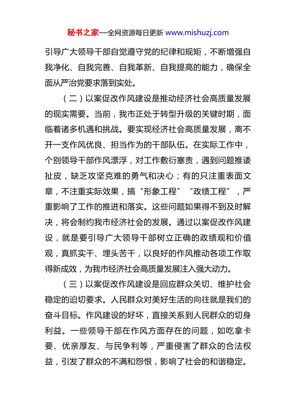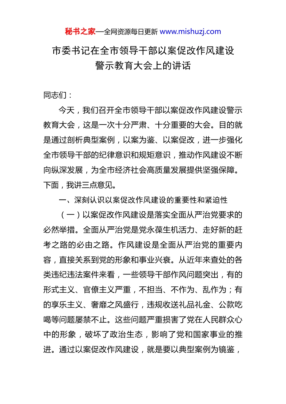 秘书之家—全网资源每日更新 www.mishuzj.com市委书记在全市领导干部以案促改作风建设警示教育大会上的讲话 同志们:今天,我们召开全市领导干部以案促改作风建设警示教育大会,这是一次十分严肃、十分重要的大会。目的就是通过剖析典型案例,以案为鉴、以案促改,进一步强化全市领导干部的纪律意识和规矩意识,推动作风建设不断向纵深发展,为全市经济社会高质量发展提供坚强保障。下面,我讲三点意见。一、深刻认识以案促改作风建设的重要性和紧迫性(一)以案促改作风建设是落实全面从严治党要求的必然举措。全面从严治党是党永葆生机活力、走好新的赶考之路的必由之路。作风建设是全面从严治党的重要内容,直接关系到党的形象和事业兴衰。从近年来查处的各类违纪违法案件来看,一些领导干部作风问题突出,有的形式主义、官僚主义严重,不担当、不作为、乱作为;有的享乐主义、奢靡之风盛行,违规收送礼品礼金、公款吃喝等问题屡禁不止。这些问题严重损害了党在人民群众心中的形象,破坏了政治生态,影响了党和国家事业的推进。通过以案促改作风建设,就是要以典型案例为镜鉴,秘书之家—全网资源每日更新 www.mishuzj.com引导广大领导干部自觉遵守党的纪律和规矩,不断增强自我净化、自我完善、自我革新、自我提高的能力,确保全面从严治党要求落到实处。(二)以案促改作风建设是推动经济社会高质量发展的现实需要。当前,我市正处于转型升级的关键时期,面临着诸多机遇和挑战。要实现经济社会高质量发展,离不开一支作风优良、担当作为的干部队伍。在实际工作中,个别领导干部作风漂浮,对工作敷衍塞责,遇到问题推诿扯皮,缺乏攻坚克难的勇气和决心;有的只注重表面文章,不注重实际效果,搞“形象工程”“政绩工程”,严重影响了工作的推进和落实。这些问题如果得不到及时解决,将会制约我市经济社会的发展。通过以案促改作风建设,就是要引导广大领导干部树立正确的政绩观和价值观,真抓实干、埋头苦干,以良好的作风推动各项工作取得新成效,为我市经济社会高质量发展注入强大动力。(三)以案促改作风建设是回应群众关切、维护社会稳定的迫切要求。人民群众对美好生活的向往就是我们的奋斗目标。作风建设的好坏,直接关系到人民群众的切身利益。一些领导干部在作风方面存在的问题,如吃拿卡要、优亲厚友、与民争利等,严重侵害了群众的合法权益,引发了群众的不满和怨恨,影响了社会的和谐稳定。秘书之家—全网资源每日更新 www.mishuzj.com通过以案促改作风建设,就是要以解决群众反映强烈的突出问题为突破口,坚决整治侵害群众利益的不正之风和腐败问题,让群众感受到作风建设带来的新变化、新气象,不断增强群众的获得感、幸福感、安全感。二、深入剖析典型案例,汲取教训,引以为戒(一)剖析理想信念缺失的案例,坚定理想信念。理想信念是共产党人精神上的“钙”,没有理想信念,理想信念不坚定,精神上就会“缺钙”,就会得“软骨病”。从一些违纪违法案例中可以看出,个别领导干部之所以走上违法犯罪的道路,根本原因在于理想信念动摇,丧失了共产党人的政治灵魂。他们忘记了为人民服务的宗旨,背离了党的初心和使命,在金钱、权力和美色的诱惑面前,丧失了原则和底线,最终沦为阶下囚。广大领导干部要从这些案例中汲取教训,加强党性修养,坚定理想信念,始终保持对党的忠诚,对人民的赤诚,自觉做到在党言党、在党忧党、在党为党。(二)剖析纪律意识淡薄的案例,严守纪律规矩。纪律是党的生命线,是管党治党的重器和戒尺。然而,在实际工作中,个别领导干部纪律意识淡薄,无视党的纪律和规矩,肆意妄为。有的违反政治纪律,搞“两面派”、做“两面人”,阳奉阴违、欺上瞒下;有的违反组织纪律,秘书之家—全网资源每日更新 www.mishuzj.com违规选拔任用干部,拉帮结派、搞团团伙伙;有的违反廉洁纪律,利用职务之便谋取私利,收受他人财物,违规从事营利活动等。这些行为严重违反了党的纪律,损害了党的团结统一和党内政治生态。广大领导干部要从中吸取教训,增强纪律意识,自觉遵守党的各项纪律和规矩,做到心有所畏、言有所戒、行有所止。(三)剖析责...
