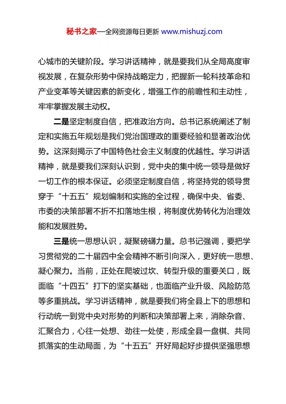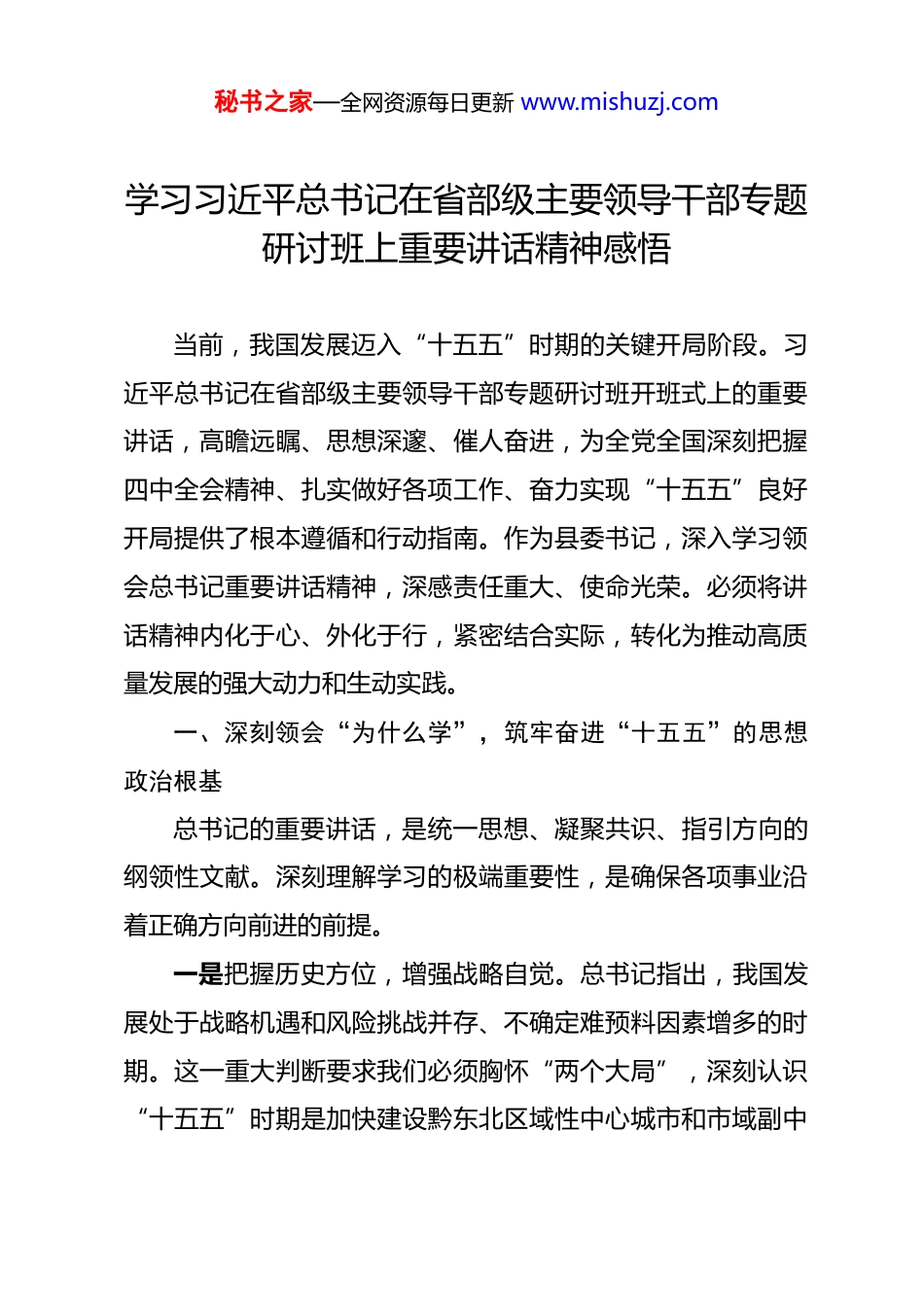 秘书之家—全网资源每日更新 www.mishuzj.com学习习近平总书记在省部级主要领导干部专题研讨班上重要讲话精神感悟 当前,我国发展迈入“十五五”时期的关键开局阶段。习近平总书记在省部级主要领导干部专题研讨班开班式上的重要讲话,高瞻远瞩、思想深邃、催人奋进,为全党全国深刻把握四中全会精神、扎实做好各项工作、奋力实现“十五五”良好开局提供了根本遵循和行动指南。作为县委书记,深入学习领会总书记重要讲话精神,深感责任重大、使命光荣。必须将讲话精神内化于心、外化于行,紧密结合实际,转化为推动高质量发展的强大动力和生动实践。一、深刻领会“为什么学”,筑牢奋进“十五五”的思想政治根基总书记的重要讲话,是统一思想、凝聚共识、指引方向的纲领性文献。深刻理解学习的极端重要性,是确保各项事业沿着正确方向前进的前提。一是把握历史方位,增强战略自觉。总书记指出,我国发展处于战略机遇和风险挑战并存、不确定难预料因素增多的时期。这一重大判断要求我们必须胸怀“两个大局”,深刻认识“十五五”时期是加快建设黔东北区域性中心城市和市域副中秘书之家—全网资源每日更新 www.mishuzj.com心城市的关键阶段。学习讲话精神,就是要我们从全局高度审视发展,在复杂形势中保持战略定力,把握新一轮科技革命和产业变革等关键因素的新变化,增强工作的前瞻性和主动性,牢牢掌握发展主动权。二是坚定制度自信,把准政治方向。总书记系统阐述了制定和实施五年规划是我们党治国理政的重要经验和显著政治优势。这深刻揭示了中国特色社会主义制度的优越性。学习讲话精神,就是要我们深刻认识到,党中央的集中统一领导是做好一切工作的根本保证。必须坚定制度自信,将坚持党的领导贯穿于“十五五”规划编制和实施的全过程,确保中央、省委、市委的决策部署不折不扣落地生根,将制度优势转化为治理效能和发展胜势。三是统一思想认识,凝聚磅礴力量。总书记强调,要把学习贯彻党的二十届四中全会精神不断引向深入,更好统一思想、凝心聚力。当前,正处在爬坡过坎、转型升级的重要关口,既面临“十四五”打下的坚实基础,也面临产业升级、风险防范等多重挑战。学习讲话精神,就是要我们将全县上下的思想和行动统一到党中央对形势的判断和决策部署上来,消除杂音、汇聚合力,心往一处想、劲往一处使,形成全县一盘棋、共同抓落实的生动局面,为“十五五”开好局起好步提供坚强思想秘书之家—全网资源每日更新 www.mishuzj.com保证。二、精准把握“学什么”,吃透实现良好开局的精髓要义总书记的重要讲话内涵丰富,既部署“过河”的任务,又指导解决“桥或船”的问题。必须全面、深刻、准确领会其核心要义和实践要求。一是学懂“十五五”发展的战略部署与根本要求。总书记对“十五五”时期经济社会发展作出了战略部署,强调要全面、深刻、准确领会和把握。对于**而言,就是要将“十五五”发展蓝图与“一心五城”的战略定位深度融合。学习讲话精神,要求我们必须精准把握政策界限和尺度,做到该为的必须为、能为的努力为、不该为的决不为。在规划编制中,既要体现国家整体规划的精神,又要坚持从实际出发,因地因事制宜,确保规划可落地、能见效。二是学通现代化建设的路径方法与重点任务。讲话明确了“十五五”时期的系列战略任务。其一,建设现代化产业体系。总书记强调要坚持智能化、绿色化、融合化方向,因地制宜发展新质生产力。这要求必须立足资源禀赋和产业基础,找准定位。例如,持续推进智慧烟区建设与“物联网+智能烘烤”系统全面推广,推动天麻、茶叶等特色产业提质升级,加快发展大数据产业,正是贯彻这一要求的实践。其二,构建新发展格秘书之家—全网资源每日更新 www.mishuzj.com局。要坚持以国内大循环为主体,正确处理消费和投资、需求和供给的关系。**需着力扩大内需,提升“枢纽之城”功能,畅通县域经济循环,同时以乌江航运复苏等为契机扩大对外开放。其三,统筹发展和安全。必须把安全发展贯穿各领域全过程,有效防范化解各类风险。三是学深提高执政能力的实践指向与作风保障。总书记强调,顺利完成“十五五”时期目标任务,必须着力提高党...