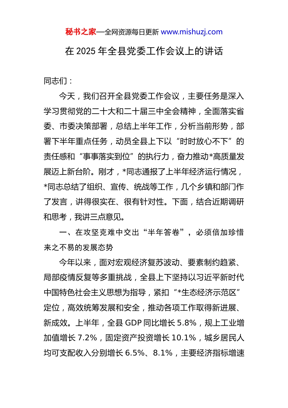 秘书之家—全网资源每日更新 www.mishuzj.com在 2025 年全县党委工作会议上的讲话 同志们:今天,我们召开全县党委工作会议,主要任务是深入学习贯彻党的二十大和二十届三中全会精神,全面落实省委、市委决策部署,总结上半年工作,分析当前形势,部署下半年重点任务,动员全县上下以“时时放心不下”的责任感和“事事落实到位”的执行力,奋力推动*高质量发展迈上新台阶。刚才,*同志通报了上半年经济运行情况,*同志总结了组织、宣传、统战等工作,几个乡镇和部门作了发言,讲得很实在、很有针对性。下面,结合近期调研和思考,我讲三点意见。一、在攻坚克难中交出“半年答卷”,必须倍加珍惜来之不易的发展态势今年以来,面对宏观经济复苏波动、要素制约趋紧、局部疫情反复等多重挑战,全县上下坚持以习近平新时代中国特色社会主义思想为指导,紧扣“*生态经济示范区”定位,高效统筹发展和安全,推动各项工作取得新进展、新成效。上半年,全县 GDP 同比增长 5.8%,规上工业增加值增长 7.2%,固定资产投资增长 10.1%,城乡居民人均可支配收入分别增长 6.5%、8.1%,主要经济指标增速秘书之家—全网资源每日更新 www.mishuzj.com保持在全市第一方阵,实现了“时间过半、任务过半”的目标。这些成绩的取得,是上级党委政府关心支持的结果,是全县干部群众团结奋斗的结果。这里,我要重点讲三个方面的“可圈可点”。一是“项目为王”的导向更实了。我们坚持把项目建设作为“头号工程”,建立“县级领导包联+专班推进+每周调度”机制,上半年新签约项目 32 个、总投资 186 亿元,其中亿元以上项目 21 个;开工项目 28 个、竣工项目19 个,形成“签约即拿地、拿地即开工”的良性循环。特别让我感动的是,在*新能源电池项目落地过程中,县自然资源局干部连续 40 天驻点办公,协调解决用地指标、林地审批等难题;*镇党员干部组建“项目服务队”,为施工队解决临时用水用电、周边群众协调等问题 23 件,项目从签约到试生产仅用 10 个月,比预期提前 3 个月。这启示我们:只要干部多用心、群众多支持,再难的项目也能啃下“硬骨头”。二是“民生为本”的温度更足了。我们始终把群众的“急难愁盼”作为工作的“方向标”,上半年民生支出占一般公共预算支出的 78%。比如教育方面,新建的*小学 9月将投入使用,新增学位 1200 个,解决了城区东部“入学难”问题;医疗方面,县人民医院与省三甲医院建立“远秘书之家—全网资源每日更新 www.mishuzj.com程会诊”平台,让群众在家门口就能看名医;养老方面,我们在 12 个乡镇试点“幸福食堂”,采取“政府补贴+村集体运营+社会捐赠”模式,日均服务老人 2000 余人次,很多老人说:“以前吃饭凑合,现在顿顿有热汤,日子越过越舒坦。”这些变化,让我更加坚信:民生投入不是“花钱”,而是“种福”,群众的笑脸就是对我们工作最大的肯定。三是“基层治理”的成色更亮了。我们深化“党建+网格”管理模式,将全县划分为 1200 个微网格,选配 1300名专兼职网格员,实现“小事网格办、大事乡级管、难事县级帮”。上半年,网格员累计排查化解矛盾纠纷 420起,解决群众诉求 1800 余件,其中*社区网格员**同志,为独居老人张大爷联系医院就医、帮留守儿童联系志愿者辅导作业,被群众称为“贴心小棉袄”。更值得肯定的是,我们创新推行“乡贤参事会”“村规民约积分制”,*村通过乡贤捐赠、村民集资,硬化了 3 公里村内道路;*镇将“孝老爱亲”“垃圾分类”纳入积分管理,村民参与公共事务的积极性明显提升。这说明:基层治理既要“靠制度”,也要“聚人心”,只要发动群众、依靠群众,就能画出最大“同心圆”。二、在把握大势中认清“方位坐标”,必须始终保持秘书之家—全网资源每日更新 www.mishuzj.com清醒头脑当前,世界百年变局加速演进,国内经济恢复基础尚不牢固,我县发展也面临“标兵渐远、追兵渐近”的竞争压力。从宏观环境看,全球经济复苏乏力,外部需求收缩,原材料价格上涨、物流成本攀升等问题对我县纺织、建材等传统产业冲击较大;从自身发展看,虽然经济增速较快,但产业结构仍偏“重”...