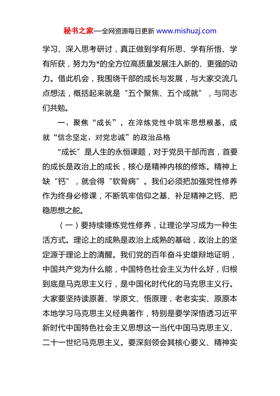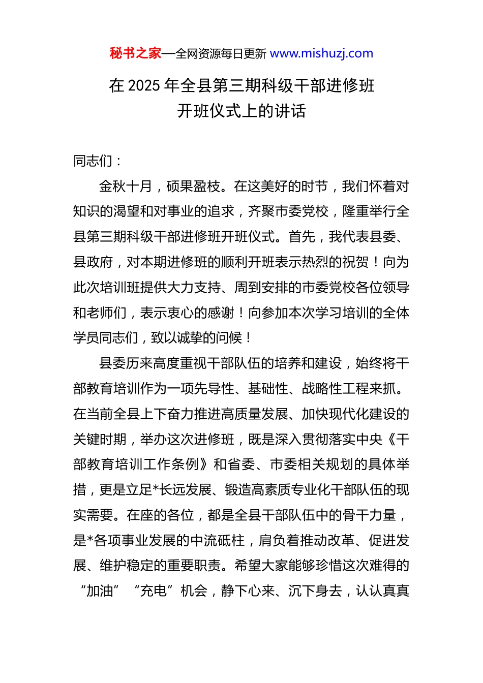 秘书之家—全网资源每日更新 www.mishuzj.com在 2025 年全县第三期科级干部进修班开班仪式上的讲话 同志们:金秋十月,硕果盈枝。在这美好的时节,我们怀着对知识的渴望和对事业的追求,齐聚市委党校,隆重举行全县第三期科级干部进修班开班仪式。首先,我代表县委、县政府,对本期进修班的顺利开班表示热烈的祝贺!向为此次培训班提供大力支持、周到安排的市委党校各位领导和老师们,表示衷心的感谢!向参加本次学习培训的全体学员同志们,致以诚挚的问候!县委历来高度重视干部队伍的培养和建设,始终将干部教育培训作为一项先导性、基础性、战略性工程来抓。在当前全县上下奋力推进高质量发展、加快现代化建设的关键时期,举办这次进修班,既是深入贯彻落实中央《干部教育培训工作条例》和省委、市委相关规划的具体举措,更是立足*长远发展、锻造高素质专业化干部队伍的现实需要。在座的各位,都是全县干部队伍中的骨干力量,是*各项事业发展的中流砥柱,肩负着推动改革、促进发展、维护稳定的重要职责。希望大家能够珍惜这次难得的“加油”“充电”机会,静下心来、沉下身去,认认真真秘书之家—全网资源每日更新 www.mishuzj.com学习、深入思考研讨,真正做到学有所思、学有所悟、学有所获,努力为*的全方位高质量发展注入新的、更强的动力。借此机会,我围绕干部的成长与发展,与大家交流几点想法,概括起来就是“五个聚焦、五个成就”,与同志们共勉。一、聚焦“成长”,在淬炼党性中筑牢思想根基,成就“信念坚定、对党忠诚”的政治品格“成长”是人生的永恒课题,对于党员干部而言,首要的成长是政治上的成长,核心是精神内核的修炼。精神上缺“钙”,就会得“软骨病”。我们必须把加强党性修养作为终身必修课,不断筑牢信仰之基、补足精神之钙、把稳思想之舵。(一)要持续锤炼党性修养,让理论学习成为一种生活方式。理论上的成熟是政治上成熟的基础,政治上的坚定源于理论上的清醒。我们党的百年奋斗史雄辩地证明,中国共产党为什么能,中国特色社会主义为什么好,归根到底是马克思主义行,是中国化时代化的马克思主义行。大家要坚持读原著、学原文、悟原理,老老实实、原原本本地学习马克思主义经典著作,特别是要学深悟透习近平新时代中国特色社会主义思想这一当代中国马克思主义、二十一世纪马克思主义。要深刻领会其核心要义、精神实秘书之家—全网资源每日更新 www.mishuzj.com质、丰富内涵和实践要求,真正靠“科学世界观”来校准思想偏差,靠“管用方法论”来抓实具体工作。不能满足于浅尝辄止、一知半解,要做到知其然并知其所以然,不断增进对党的创新理论的政治认同、思想认同、理论认同、情感认同,自觉做党的创新理论的坚定信仰者和忠实实践者。(二)要全面提升政治素养,让“两个维护”融入血脉灵魂。讲政治,是我们党作为马克思主义政党的根本要求。党员干部的政治素养,集中体现在对党忠诚上。要深刻领悟“两个确立”的决定性意义,这不仅是我们在新时代取得一切成就最根本的保证,也是我们战胜一切艰难险阻、应对一切不确定性的最大确定性、最大底气、最大保证。大家要将坚决捍卫“两个确立”、忠诚践行“两个维护”作为最高政治原则和根本政治规矩,不断提高政治判断力、政治领悟力、政治执行力。要时刻关注党中央在关心什么、强调什么,深刻领会什么是党和国家最重要的利益、什么是最需要坚定维护的立场,自觉在思想上政治上行动上同以习近平同志为核心的党中央保持高度一致。要不折不扣地贯彻落实好省委、市委的各项决策部署,确保中央和上级政令在*畅通无阻、落地生根。要始终跟着学、时刻照着做、踏实埋头干,以实际行动诠释对党绝对忠秘书之家—全网资源每日更新 www.mishuzj.com诚。(三)要不断加强道德涵养,让高尚情操成为立身之本。国无德不兴,人无德不立。党员干部的道德修养,不仅是个人品行问题,更关系到党的形象和公信力。我们要做一个“明白人”,在大是大非面前旗帜鲜明,在风浪考验面前无所畏惧,在各种诱惑面前立场坚定。要做一个“厚道人”,待人以诚、与人为善,胸怀宽广、格局远大,能够团结同志、凝聚力量。要做一个...