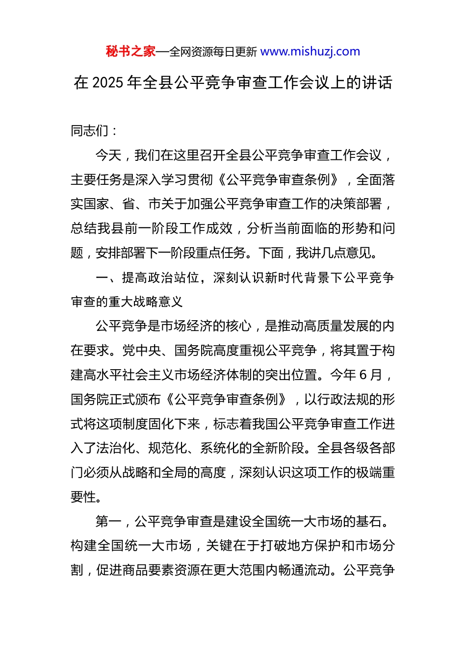 秘书之家—全网资源每日更新 www.mishuzj.com在 2025 年全县公平竞争审查工作会议上的讲话 同志们:今天,我们在这里召开全县公平竞争审查工作会议,主要任务是深入学习贯彻《公平竞争审查条例》,全面落实国家、省、市关于加强公平竞争审查工作的决策部署,总结我县前一阶段工作成效,分析当前面临的形势和问题,安排部署下一阶段重点任务。下面,我讲几点意见。一、提高政治站位,深刻认识新时代背景下公平竞争审查的重大战略意义公平竞争是市场经济的核心,是推动高质量发展的内在要求。党中央、国务院高度重视公平竞争,将其置于构建高水平社会主义市场经济体制的突出位置。今年 6 月,国务院正式颁布《公平竞争审查条例》,以行政法规的形式将这项制度固化下来,标志着我国公平竞争审查工作进入了法治化、规范化、系统化的全新阶段。全县各级各部门必须从战略和全局的高度,深刻认识这项工作的极端重要性。第一,公平竞争审查是建设全国统一大市场的基石。构建全国统一大市场,关键在于打破地方保护和市场分割,促进商品要素资源在更大范围内畅通流动。公平竞争秘书之家—全网资源每日更新 www.mishuzj.com审查制度,正是从政策制定的源头上,清理和废除妨碍统一市场和公平竞争的各种规定和做法的一项根本性制度。它像一把精准的手术刀,旨在切除那些通过不当行政干预扭曲资源配置、阻碍市场准入、给予特定企业不正当优势的“病灶”,为各类市场主体营造一视同仁、平等参与的市场环境,从而真正实现市场在资源配置中的决定性作用。第二,公平竞争审查是优化营以及商环境的核心举措。营商环境是生产力,更是竞争力。一个地区的发展,短期靠项目,中期靠政策,长期靠环境。而法治化、可预期的公平竞争环境,是最好的“梧桐树”,最能吸引“金凤凰”。当所有企业,无论大小、无论内外,都能在同一片蓝天下,遵循同样的规则进行竞争,他们的创新活力和投资热情才会被最大限度地激发。因此,严格落实公平竞争审查制度,就是向社会、向市场释放最明确、最强烈的信号:我们致力于打造一个稳定、公平、透明的营商环境,让所有企业家都能安心经营、放心投资、专心创业。第三,公平竞争审查是规范政府行为的有效途径。这项制度的本质,是对政府权力的一种自我约束和规范。它要求政府部门在制定涉及市场主体经济活动的政策措施时,必须进行“自我体检”,审视其是否可能排除或限制秘书之家—全网资源每日更新 www.mishuzj.com竞争。这就在政府和市场之间建立了一道“防火墙”,有效防止了公权力的“越位”和“错位”,推动政府从“划桨人”向“掌舵人”转变,将更多精力投入到提供优质公共服务、创造良好发展环境和维护社会公平正义上来。这是我们建设法治政府、服务型政府的题中应有之义。二、正视现实差距,清醒认识当前我县公平竞争审查工作面临的挑战与不足近年来,在县委、县政府的坚强领导下,我县公平竞争审查工作取得了积极进展。我们建立了由 22 个部门组成的县级公平竞争审查工作联席会议制度,初步构建了“谁起草、谁审查”的工作格局,有序开展了存量政策措施的清理工作,基本实现了增量政策“应审尽审”的目标。根据统计,2025 年上半年,全县各部门在制定市场准入、产业发展、招商引资等方面的政策措施时,累计开展公平竞争审查 112 件次,审查率达到 98%,识别并纠正了 8 处可能存在排除、限制竞争效果的条款,工作取得了一定成效。但在肯定成绩的同时,我们更要清醒地看到,对照《条例》的新要求,对标先进地区的好做法,我们的工作仍存在不少短板和弱项,主要体现在三个方面:一是“不想审”的思想藩篱依然存在。部分单位和干秘书之家—全网资源每日更新 www.mishuzj.com部对公平竞争审查的重要性认识不足、理解不深,仍然存在惯性思维。有的认为这项工作是市场监管部门一家的事,与己无关;有的将其视为一项额外负担,认为是束缚手脚的“紧箍咒”,在制定政策时习惯于“给本地企业留点好处”“给重点项目开点绿灯”,存在规避审查、选择性审查的侥幸心理。这种“重发展、轻公平”的陈旧观念,是影响制度落地生根的最大障碍。二是“不会审”的专业能力...
