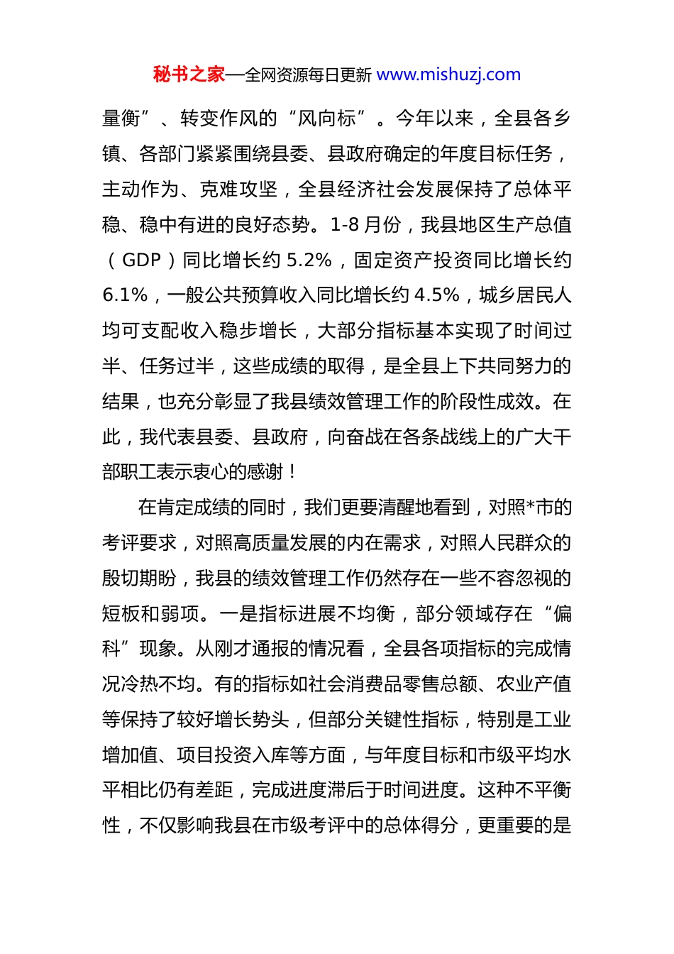 秘书之家—全网资源每日更新 www.mishuzj.com在 2025 年全县绩效管理工作推进会上的讲话 同志们:今天,我们在这里召开 2025 年全县绩效管理工作推进会,主要任务是深入学习领会中央关于绩效工作的重要论述、关于我区工作的重要指示要求和对*市的重要指示精神,全面贯彻落实自治区、*市和县委、县政府关于绩效管理工作的最新部署,总结分析今年以来我县绩效管理工作取得的成效和存在的不足,研究部署下一阶段的重点任务,动员全县上下进一步统一思想、加压奋进,以决战决胜的姿态,确保圆满完成全年各项目标任务。刚才,*同志主持会议并提出了明确要求,会议通报了我县 1-8 月在*市绩效考评中的目标任务执行情况,县发展改革局、县科技工信和商贸局、县财政局、县农业农村局、县教育局、县卫健局、县交通局等 7 个单位作了汇报发言,既有对当前工作的深入分析,也体现了冲刺攻坚的决心。总的来看,大家对绩效工作的认识是深刻的,抓落实的态度是坚决的。下面,我讲三点意见。一、肯定成绩,正视差距,切实增强做好绩效管理工作的责任感和紧迫感绩效管理是推动发展的“指挥棒”、检验工作的“度秘书之家—全网资源每日更新 www.mishuzj.com量衡”、转变作风的“风向标”。今年以来,全县各乡镇、各部门紧紧围绕县委、县政府确定的年度目标任务,主动作为、克难攻坚,全县经济社会发展保持了总体平稳、稳中有进的良好态势。1-8 月份,我县地区生产总值(GDP)同比增长约 5.2%,固定资产投资同比增长约6.1%,一般公共预算收入同比增长约 4.5%,城乡居民人均可支配收入稳步增长,大部分指标基本实现了时间过半、任务过半,这些成绩的取得,是全县上下共同努力的结果,也充分彰显了我县绩效管理工作的阶段性成效。在此,我代表县委、县政府,向奋战在各条战线上的广大干部职工表示衷心的感谢!在肯定成绩的同时,我们更要清醒地看到,对照*市的考评要求,对照高质量发展的内在需求,对照人民群众的殷切期盼,我县的绩效管理工作仍然存在一些不容忽视的短板和弱项。一是指标进展不均衡,部分领域存在“偏科”现象。从刚才通报的情况看,全县各项指标的完成情况冷热不均。有的指标如社会消费品零售总额、农业产值等保持了较好增长势头,但部分关键性指标,特别是工业增加值、项目投资入库等方面,与年度目标和市级平均水平相比仍有差距,完成进度滞后于时间进度。这种不平衡性,不仅影响我县在市级考评中的总体得分,更重要的是秘书之家—全网资源每日更新 www.mishuzj.com反映出我们发展的内生动力和协调性有待加强。二是创新争优意识不强,“守成”思想依然存在。在工作中,部分单位和干部满足于“过得去”,习惯于“老套路”,缺乏“跳起来摘桃子”的拼劲和“无中生有”的闯劲。对标自治区和*市提出的“创新为魂”要求,我们在培育特色亮点、打造先进典型、争取上级试点等方面主动性不强,报送的创新创优案例质量不高,能够真正在全市乃至全区叫得响、推得开的“*经验”还不多。这种“守成”心态是绩效管理提质增效的最大障碍。三是协同配合不够紧密,“单打独斗”现象突出。绩效管理是一项系统工程,涉及经济社会发展的方方面面,需要各部门、各单位树立“一盘棋”思想,通力协作。但从实际情况看,部门之间信息壁垒、责任壁垒依然存在,“各扫门前雪”的现象时有发生。比如,一个重大项目的推进,需要发改、自然资源、财政、交通等多个部门联动,任何一个环节“掉链子”,都会影响整个项目的绩效。跨部门、跨领域的综合性指标,往往成为我们绩效考评中的失分点。四是结果导向不够鲜明,“重过程轻结果”问题待解。有些单位在汇报工作时,讲了多少次会议、发了多少份文件、开展了多少次检查,看起来过程很“圆满”,但一问实际效果、群众反映,就语焉不详。绩效管理的核心在于结果,在于最终是秘书之家—全网资源每日更新 www.mishuzj.com否推动了发展、惠及了民生。我们必须坚决摒弃形式主义,把工作的落脚点放在“干成了什么、效果怎么样、群众满不满意”上,让绩效成果真正体现在发展成效和群众获得感上。以上这些问题,是摆在我们面前必须解决的现实课题。全县各...