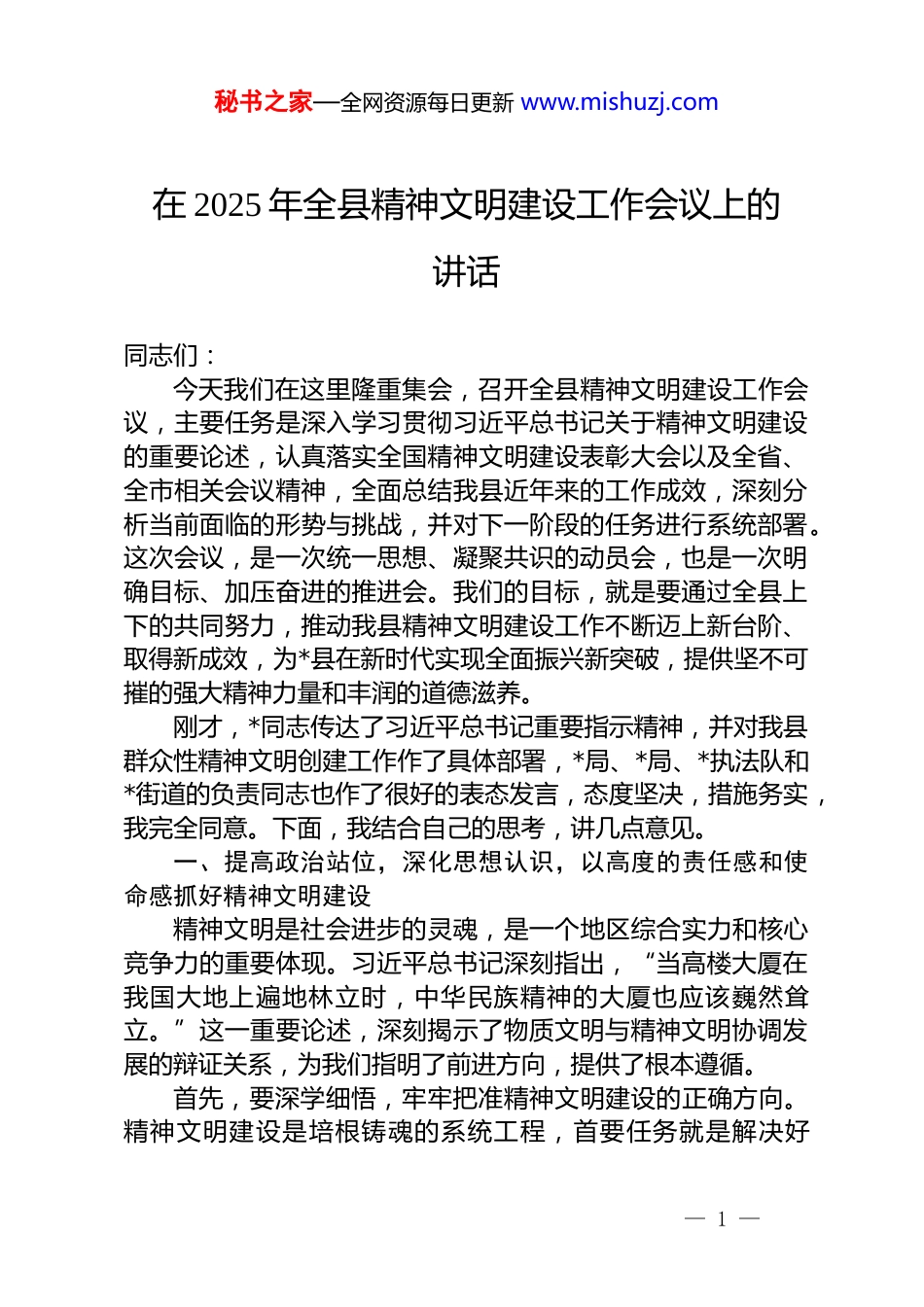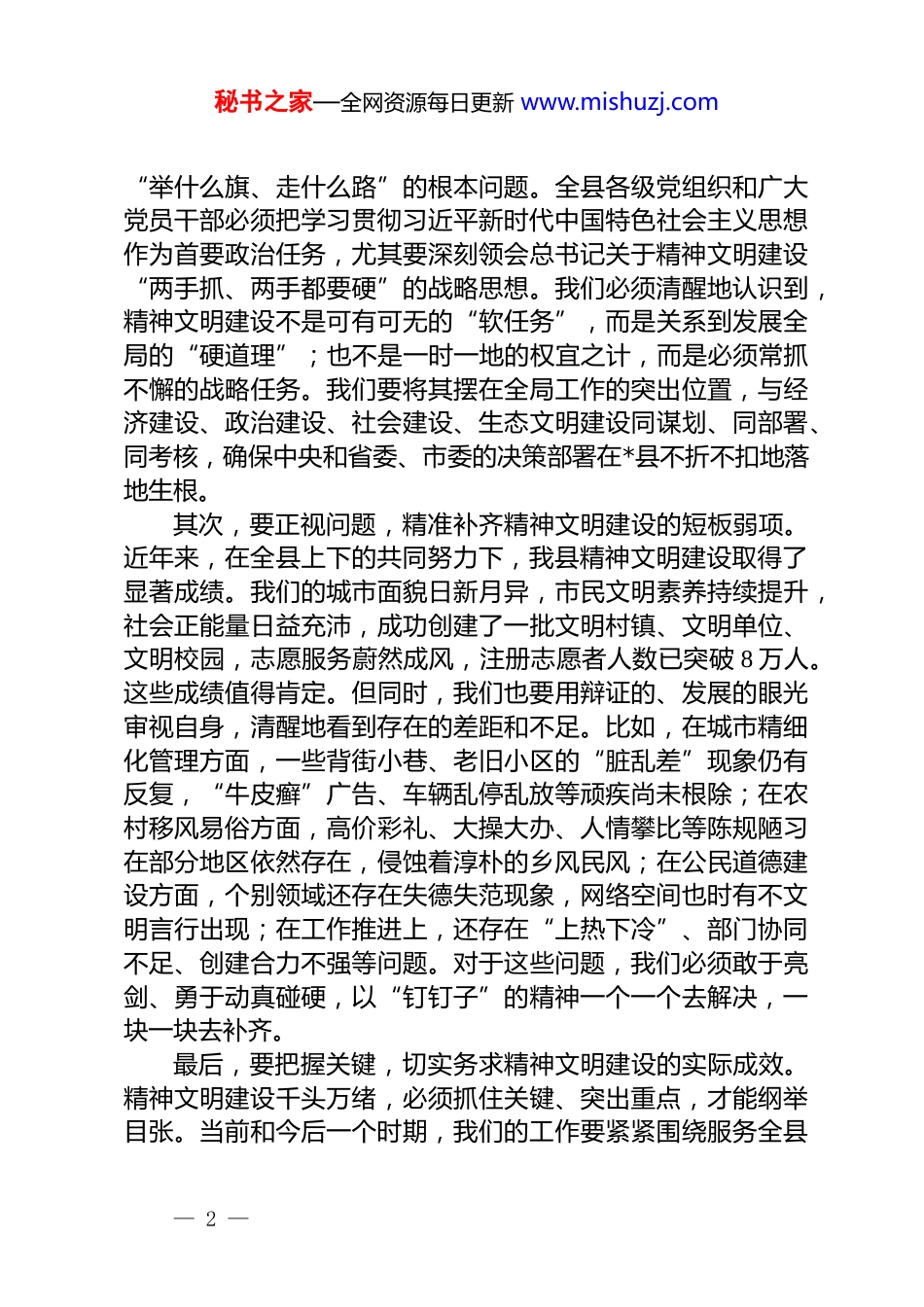 秘书之家—全网资源每日更新 www.mishuzj.com在 2025 年全县精神文明建设工作会议上的讲话同志们:今天我们在这里隆重集会,召开全县精神文明建设工作会议,主要任务是深入学习贯彻习近平总书记关于精神文明建设的重要论述,认真落实全国精神文明建设表彰大会以及全省、全市相关会议精神,全面总结我县近年来的工作成效,深刻分析当前面临的形势与挑战,并对下一阶段的任务进行系统部署。这次会议,是一次统一思想、凝聚共识的动员会,也是一次明确目标、加压奋进的推进会。我们的目标,就是要通过全县上下的共同努力,推动我县精神文明建设工作不断迈上新台阶、取得新成效,为*县在新时代实现全面振兴新突破,提供坚不可摧的强大精神力量和丰润的道德滋养。刚才,*同志传达了习近平总书记重要指示精神,并对我县群众性精神文明创建工作作了具体部署,*局、*局、*执法队和*街道的负责同志也作了很好的表态发言,态度坚决,措施务实,我完全同意。下面,我结合自己的思考,讲几点意见。一、提高政治站位,深化思想认识,以高度的责任感和使命感抓好精神文明建设精神文明是社会进步的灵魂,是一个地区综合实力和核心竞争力的重要体现。习近平总书记深刻指出,“当高楼大厦在我国大地上遍地林立时,中华民族精神的大厦也应该巍然耸立。”这一重要论述,深刻揭示了物质文明与精神文明协调发展的辩证关系,为我们指明了前进方向,提供了根本遵循。首先,要深学细悟,牢牢把准精神文明建设的正确方向。精神文明建设是培根铸魂的系统工程,首要任务就是解决好— 1 —秘书之家—全网资源每日更新 www.mishuzj.com“举什么旗、走什么路”的根本问题。全县各级党组织和广大党员干部必须把学习贯彻习近平新时代中国特色社会主义思想作为首要政治任务,尤其要深刻领会总书记关于精神文明建设“两手抓、两手都要硬”的战略思想。我们必须清醒地认识到,精神文明建设不是可有可无的“软任务”,而是关系到发展全局的“硬道理”;也不是一时一地的权宜之计,而是必须常抓不懈的战略任务。我们要将其摆在全局工作的突出位置,与经济建设、政治建设、社会建设、生态文明建设同谋划、同部署、同考核,确保中央和省委、市委的决策部署在*县不折不扣地落地生根。其次,要正视问题,精准补齐精神文明建设的短板弱项。近年来,在全县上下的共同努力下,我县精神文明建设取得了显著成绩。我们的城市面貌日新月异,市民文明素养持续提升,社会正能量日益充沛,成功创建了一批文明村镇、文明单位、文明校园,志愿服务蔚然成风,注册志愿者人数已突破 8 万人。这些成绩值得肯定。但同时,我们也要用辩证的、发展的眼光审视自身,清醒地看到存在的差距和不足。比如,在城市精细化管理方面,一些背街小巷、老旧小区的“脏乱差”现象仍有反复,“牛皮癣”广告、车辆乱停乱放等顽疾尚未根除;在农村移风易俗方面,高价彩礼、大操大办、人情攀比等陈规陋习在部分地区依然存在,侵蚀着淳朴的乡风民风;在公民道德建设方面,个别领域还存在失德失范现象,网络空间也时有不文明言行出现;在工作推进上,还存在“上热下冷”、部门协同不足、创建合力不强等问题。对于这些问题,我们必须敢于亮剑、勇于动真碰硬,以“钉钉子”的精神一个一个去解决,一块一块去补齐。最后,要把握关键,切实务求精神文明建设的实际成效。精神文明建设千头万绪,必须抓住关键、突出重点,才能纲举目张。当前和今后一个时期,我们的工作要紧紧围绕服务全县— 2 —秘书之家—全网资源每日更新 www.mishuzj.com发展大局来展开。*县正处在滚石上山、爬坡过坎的关键时期,推动产业转型升级、实现高质量发展,不仅需要坚实的物质基础,更需要强大的精神支撑。我们要通过精神文明建设,引导全县人民树立与新时代相适应的思想观念、精神面貌、文明风尚和行为规范,把全县人民的智慧和力量凝聚到县委、县政府确定的各项目标任务上来,形成“人人关心*、人人建设*、人人奉献*”的生动局面,让文明之花在*大地结出高质量发展的累累硕果。二、活用优势资源,做强宣传引导,筑牢精神文明建设的思想根基思想是行动的先导。精神文明建设,根本...