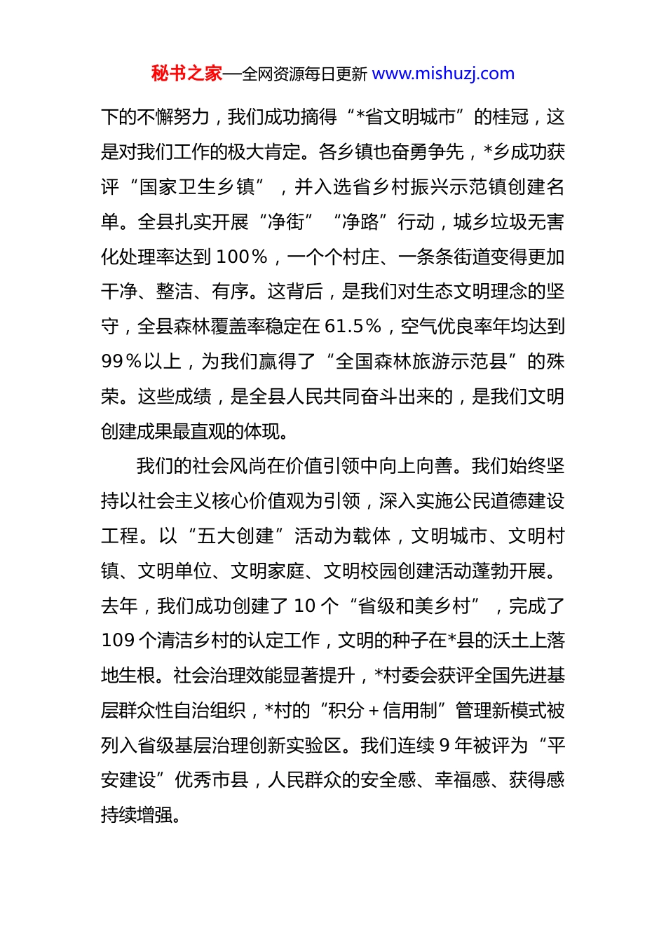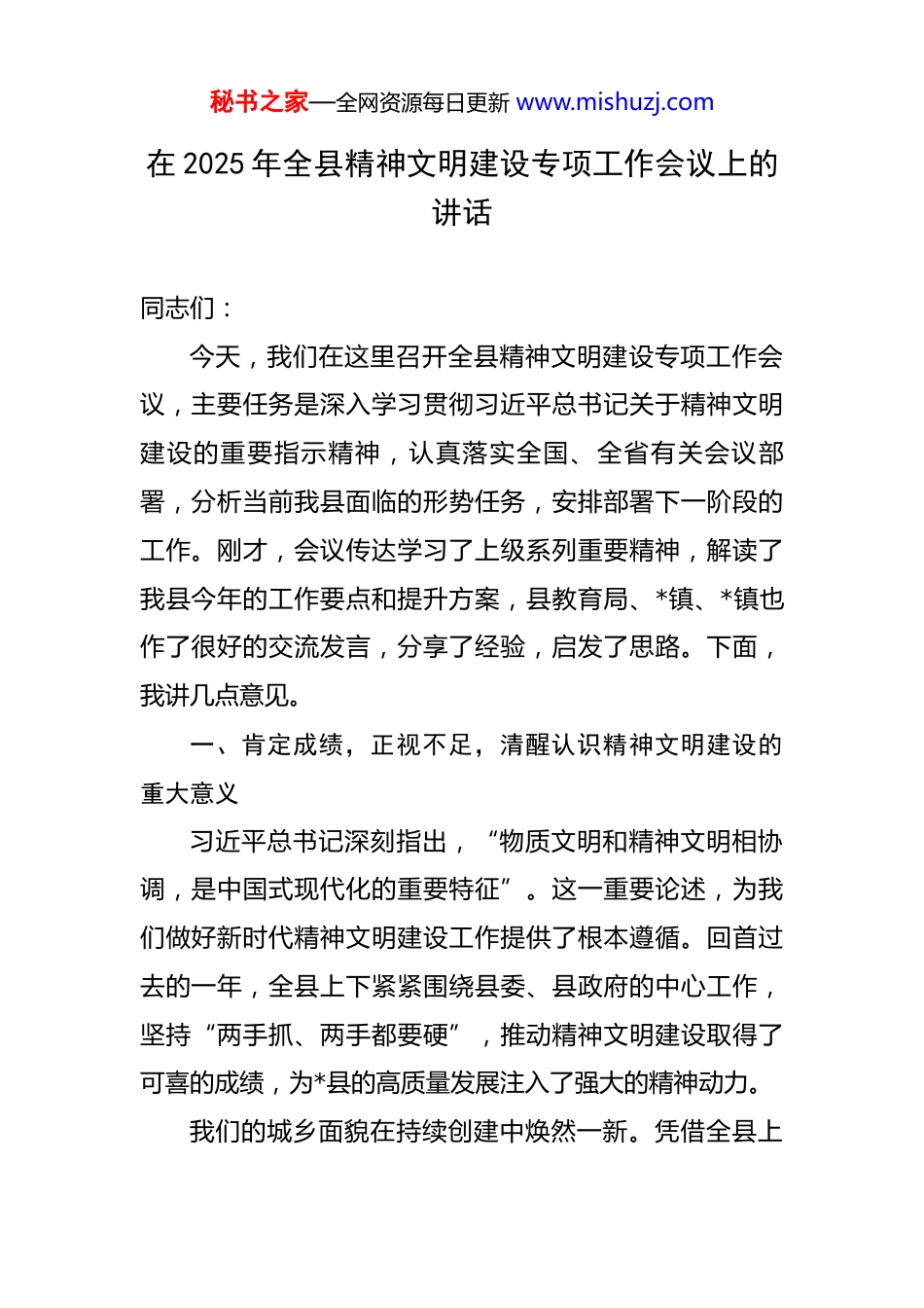 秘书之家—全网资源每日更新 www.mishuzj.com在 2025 年全县精神文明建设专项工作会议上的讲话 同志们:今天,我们在这里召开全县精神文明建设专项工作会议,主要任务是深入学习贯彻习近平总书记关于精神文明建设的重要指示精神,认真落实全国、全省有关会议部署,分析当前我县面临的形势任务,安排部署下一阶段的工作。刚才,会议传达学习了上级系列重要精神,解读了我县今年的工作要点和提升方案,县教育局、*镇、*镇也作了很好的交流发言,分享了经验,启发了思路。下面,我讲几点意见。一、肯定成绩,正视不足,清醒认识精神文明建设的重大意义习近平总书记深刻指出,“物质文明和精神文明相协调,是中国式现代化的重要特征”。这一重要论述,为我们做好新时代精神文明建设工作提供了根本遵循。回首过去的一年,全县上下紧紧围绕县委、县政府的中心工作,坚持“两手抓、两手都要硬”,推动精神文明建设取得了可喜的成绩,为*县的高质量发展注入了强大的精神动力。我们的城乡面貌在持续创建中焕然一新。凭借全县上秘书之家—全网资源每日更新 www.mishuzj.com下的不懈努力,我们成功摘得“*省文明城市”的桂冠,这是对我们工作的极大肯定。各乡镇也奋勇争先,*乡成功获评“国家卫生乡镇”,并入选省乡村振兴示范镇创建名单。全县扎实开展“净街”“净路”行动,城乡垃圾无害化处理率达到 100%,一个个村庄、一条条街道变得更加干净、整洁、有序。这背后,是我们对生态文明理念的坚守,全县森林覆盖率稳定在 61.5%,空气优良率年均达到99%以上,为我们赢得了“全国森林旅游示范县”的殊荣。这些成绩,是全县人民共同奋斗出来的,是我们文明创建成果最直观的体现。我们的社会风尚在价值引领中向上向善。我们始终坚持以社会主义核心价值观为引领,深入实施公民道德建设工程。以“五大创建”活动为载体,文明城市、文明村镇、文明单位、文明家庭、文明校园创建活动蓬勃开展。去年,我们成功创建了 10 个“省级和美乡村”,完成了109 个清洁乡村的认定工作,文明的种子在*县的沃土上落地生根。社会治理效能显著提升,*村委会获评全国先进基层群众性自治组织,*村的“积分+信用制”管理新模式被列入省级基层治理创新实验区。我们连续 9 年被评为“平安建设”优秀市县,人民群众的安全感、幸福感、获得感持续增强。秘书之家—全网资源每日更新 www.mishuzj.com我们的文化生活在创新实践中多姿多彩。我们着力打造群众喜闻乐见的文明实践品牌。特别是我们的“*文化惠民”演出品牌,去年深入全县 11 个乡镇,累计开展了 60场演出,吸引了大量群众热情参与,成为了深受百姓欢迎的文化名片。我们积极探索“赛事+旅游”、“文化+旅游”融合发展新模式,成功举办了 35 场大型文体赛事,其中跨年烟花许愿夜等活动吸引了超过 4 万人次参与,有效激发了城乡文化活力。全民健身蔚然成风,城乡居民体质合格比例达到 95.2%,我们正朝着创建全民运动健身模范县的目标稳步迈进。在肯定成绩的同时,我们更要清醒地看到工作中存在的短板和不足。对标中国式现代化的要求,对标人民群众对美好生活的新期待,我县精神文明建设工作还存在一些亟待解决的问题。比如,城乡发展的硬件设施上去了,但部分市民的文明“软件”还未完全跟上,乱闯红灯、乱扔垃圾、公共场所大声喧哗等不文明现象仍时有发生。一些领域的创建工作存在前热后冷、重牌子轻实效的问题,长效机制仍需健全。未成年人思想道德建设面临着网络冲击、家庭教育缺位等新挑战,校家社协同育人体系有待进一步完善。这些问题,是我们下一步工作中必须下大力气解决的重点和难点。秘书之家—全网资源每日更新 www.mishuzj.com二、聚焦重点,精准发力,全面提升精神文明建设的质量水平2025 年是实现“十四五”规划目标任务的关键一年,做好今年的精神文明建设工作至关重要。我们必须坚持问题导向、目标导向、效果导向,紧扣《2025 年*县精神文明建设工作要点》和《提升方案》,精准发力,推动各项工作任务落地见效。第一,要以“五大创建”为统领,在深化内涵、拓展外延上下功夫。创建不是终点,而是新的起点。要推动文明...