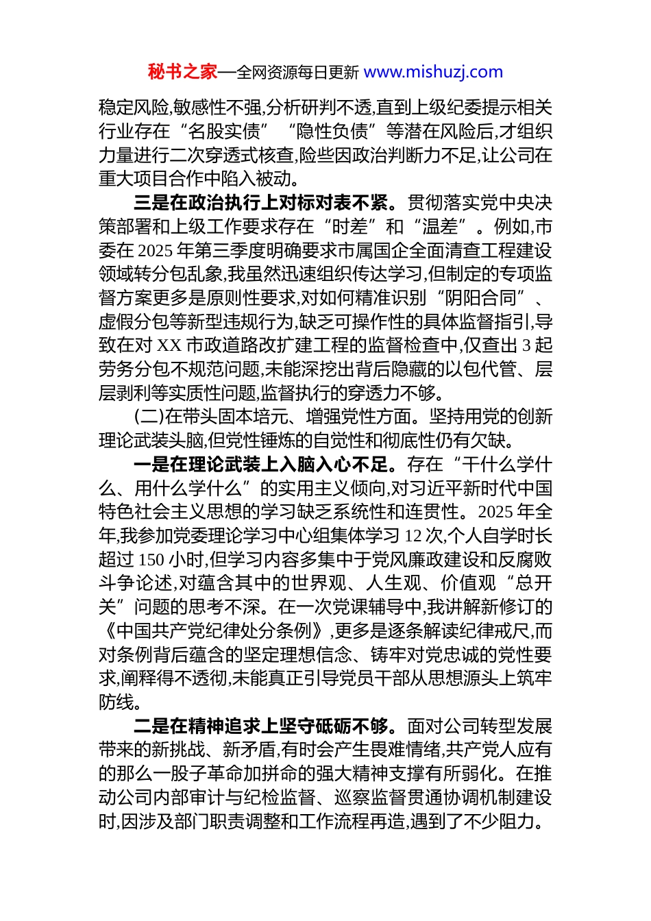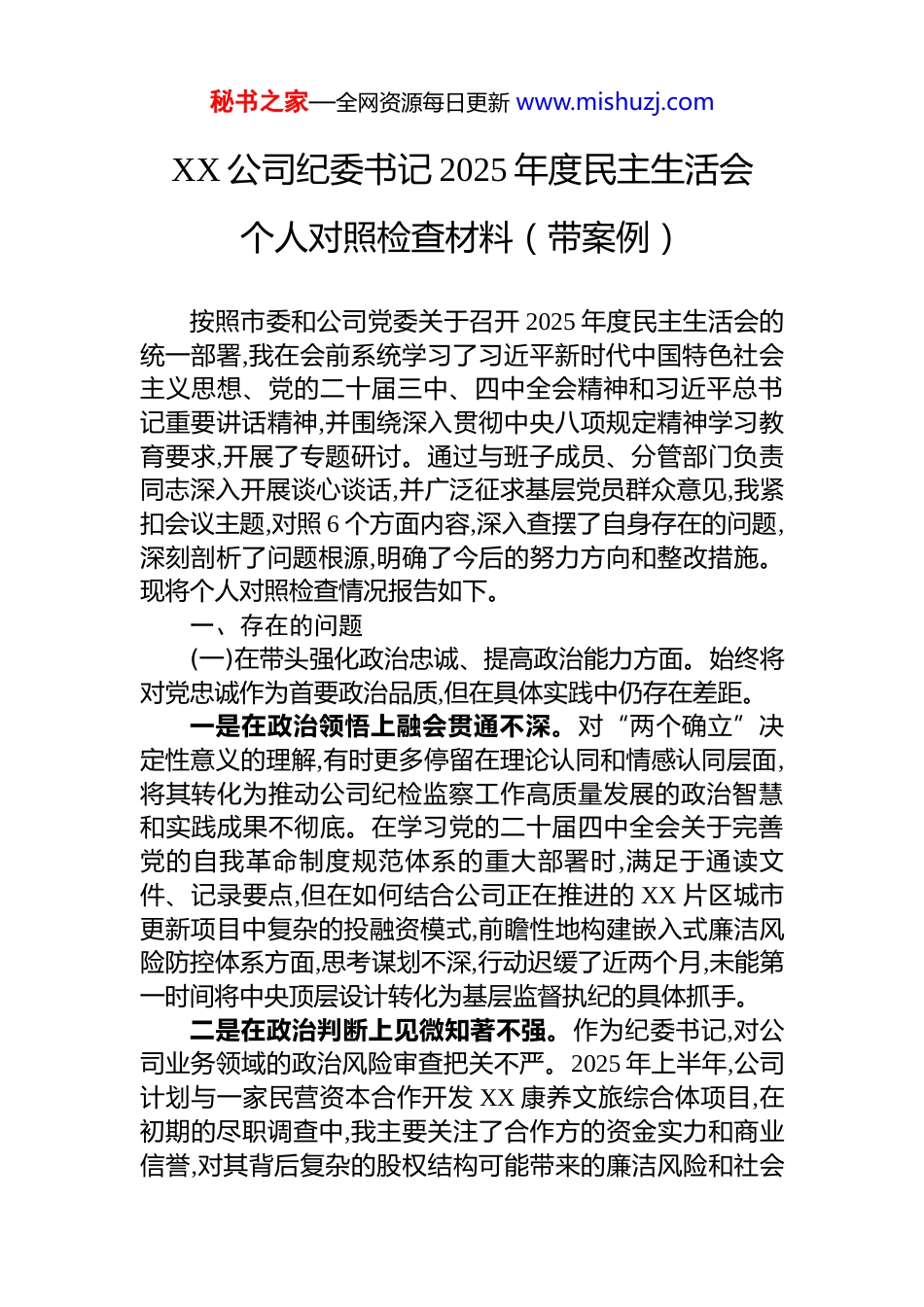 秘书之家—全网资源每日更新 www.mishuzj.comXX 公司纪委书记 2025 年度民主生活会个人对照检查材料(带案例)按照市委和公司党委关于召开 2025 年度民主生活会的统一部署,我在会前系统学习了习近平新时代中国特色社会主义思想、党的二十届三中、四中全会精神和习近平总书记重要讲话精神,并围绕深入贯彻中央八项规定精神学习教育要求,开展了专题研讨。通过与班子成员、分管部门负责同志深入开展谈心谈话,并广泛征求基层党员群众意见,我紧扣会议主题,对照 6 个方面内容,深入查摆了自身存在的问题,深刻剖析了问题根源,明确了今后的努力方向和整改措施。现将个人对照检查情况报告如下。一、存在的问题(一)在带头强化政治忠诚、提高政治能力方面。始终将对党忠诚作为首要政治品质,但在具体实践中仍存在差距。一是在政治领悟上融会贯通不深。对“两个确立”决定性意义的理解,有时更多停留在理论认同和情感认同层面,将其转化为推动公司纪检监察工作高质量发展的政治智慧和实践成果不彻底。在学习党的二十届四中全会关于完善党的自我革命制度规范体系的重大部署时,满足于通读文件、记录要点,但在如何结合公司正在推进的 XX 片区城市更新项目中复杂的投融资模式,前瞻性地构建嵌入式廉洁风险防控体系方面,思考谋划不深,行动迟缓了近两个月,未能第一时间将中央顶层设计转化为基层监督执纪的具体抓手。二是在政治判断上见微知著不强。作为纪委书记,对公司业务领域的政治风险审查把关不严。2025 年上半年,公司计划与一家民营资本合作开发 XX 康养文旅综合体项目,在初期的尽职调查中,我主要关注了合作方的资金实力和商业信誉,对其背后复杂的股权结构可能带来的廉洁风险和社会秘书之家—全网资源每日更新 www.mishuzj.com稳定风险,敏感性不强,分析研判不透,直到上级纪委提示相关行业存在“名股实债”“隐性负债”等潜在风险后,才组织力量进行二次穿透式核查,险些因政治判断力不足,让公司在重大项目合作中陷入被动。三是在政治执行上对标对表不紧。贯彻落实党中央决策部署和上级工作要求存在“时差”和“温差”。例如,市委在 2025 年第三季度明确要求市属国企全面清查工程建设领域转分包乱象,我虽然迅速组织传达学习,但制定的专项监督方案更多是原则性要求,对如何精准识别“阴阳合同”、虚假分包等新型违规行为,缺乏可操作性的具体监督指引,导致在对 XX 市政道路改扩建工程的监督检查中,仅查出 3 起劳务分包不规范问题,未能深挖出背后隐藏的以包代管、层层剥利等实质性问题,监督执行的穿透力不够。(二)在带头固本培元、增强党性方面。坚持用党的创新理论武装头脑,但党性锤炼的自觉性和彻底性仍有欠缺。一是在理论武装上入脑入心不足。存在“干什么学什么、用什么学什么”的实用主义倾向,对习近平新时代中国特色社会主义思想的学习缺乏系统性和连贯性。2025 年全年,我参加党委理论学习中心组集体学习 12 次,个人自学时长超过 150 小时,但学习内容多集中于党风廉政建设和反腐败斗争论述,对蕴含其中的世界观、人生观、价值观“总开关”问题的思考不深。在一次党课辅导中,我讲解新修订的《中国共产党纪律处分条例》,更多是逐条解读纪律戒尺,而对条例背后蕴含的坚定理想信念、铸牢对党忠诚的党性要求,阐释得不透彻,未能真正引导党员干部从思想源头上筑牢防线。二是在精神追求上坚守砥砺不够。面对公司转型发展带来的新挑战、新矛盾,有时会产生畏难情绪,共产党人应有的那么一股子革命加拼命的强大精神支撑有所弱化。在推动公司内部审计与纪检监督、巡察监督贯通协调机制建设时,因涉及部门职责调整和工作流程再造,遇到了不少阻力。秘书之家—全网资源每日更新 www.mishuzj.com初期几次协调会效果不彰后,我一度产生了“等一等、放一放”的消极念头,认为时机尚不成熟,攻坚克难的劲头不强,直到主要领导亲自督办,才下定决心啃下这块“硬骨头”,反映出我在复杂局面面前,坚守共产党人精神追求的韧劲不足。三是在党性修养上知行合一不实。在党性分析和自我剖析上,有时对自己要求不严,存在“闯关”思想。在筹备本次民主生活会时,我梳理个人问题清单,起初列出的几条问题比较空泛,满足于...