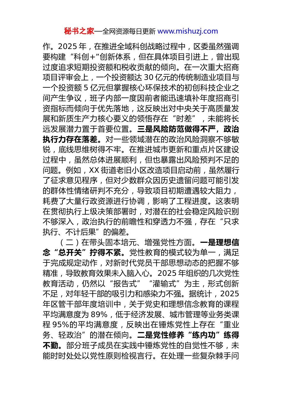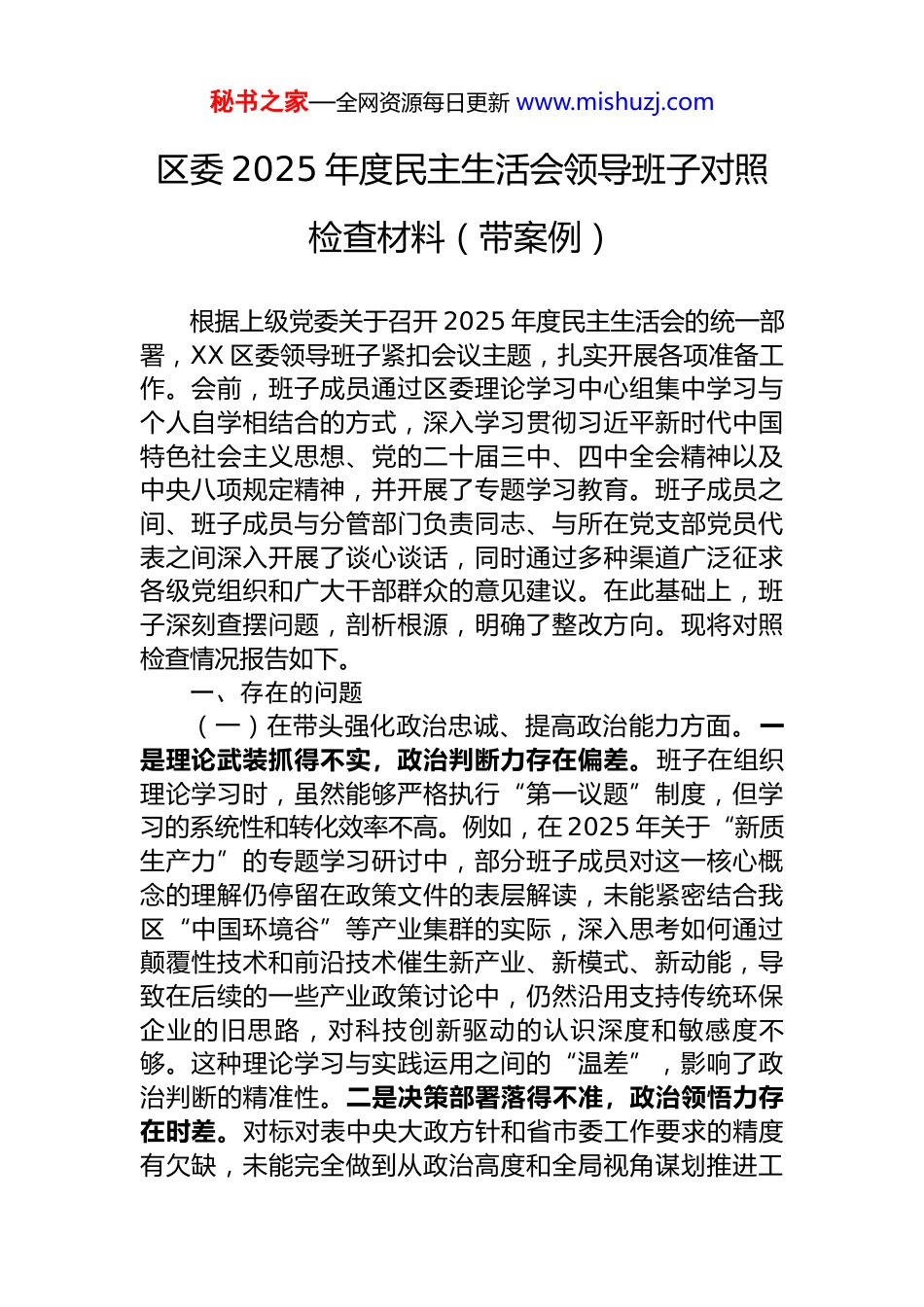 秘书之家—全网资源每日更新 www.mishuzj.com区委 2025 年度民主生活会领导班子对照检查材料(带案例)根据上级党委关于召开 2025 年度民主生活会的统一部署,XX 区委领导班子紧扣会议主题,扎实开展各项准备工作。会前,班子成员通过区委理论学习中心组集中学习与个人自学相结合的方式,深入学习贯彻习近平新时代中国特色社会主义思想、党的二十届三中、四中全会精神以及中央八项规定精神,并开展了专题学习教育。班子成员之间、班子成员与分管部门负责同志、与所在党支部党员代表之间深入开展了谈心谈话,同时通过多种渠道广泛征求各级党组织和广大干部群众的意见建议。在此基础上,班子深刻查摆问题,剖析根源,明确了整改方向。现将对照检查情况报告如下。一、存在的问题(一)在带头强化政治忠诚、提高政治能力方面。一是理论武装抓得不实,政治判断力存在偏差。班子在组织理论学习时,虽然能够严格执行“第一议题”制度,但学习的系统性和转化效率不高。例如,在 2025 年关于“新质生产力”的专题学习研讨中,部分班子成员对这一核心概念的理解仍停留在政策文件的表层解读,未能紧密结合我区“中国环境谷”等产业集群的实际,深入思考如何通过颠覆性技术和前沿技术催生新产业、新模式、新动能,导致在后续的一些产业政策讨论中,仍然沿用支持传统环保企业的旧思路,对科技创新驱动的认识深度和敏感度不够。这种理论学习与实践运用之间的“温差”,影响了政治判断的精准性。二是决策部署落得不准,政治领悟力存在时差。对标对表中央大政方针和省市委工作要求的精度有欠缺,未能完全做到从政治高度和全局视角谋划推进工秘书之家—全网资源每日更新 www.mishuzj.com作。2025 年,在推进全域科创战略过程中,区委虽然强调要构建“科创+”创新体系,但在具体项目引进上,曾出现过度追求短期投资额和税收贡献的倾向。在一次重大招商项目评审会上,一个投资额达 30 亿元的传统制造业项目与一个投资额 5 亿元但掌握核心环保技术的初创科技企业之间产生争议,班子内部一度因前者能迅速填补年度招商引资指标而倾向于优先落地,这反映出对中央关于高质量发展和新质生产力核心要义的领悟存在“时差”,未能将长远发展潜力置于首要位置。三是风险防范做得不严,政治执行力存在落差。对一些领域潜在的政治风险洞察不够敏锐,底线思维树得不牢。在推进城市更新和重点片区建设过程中,虽然总体进展顺利,但也暴露出风险预判不足的问题。例如,XX 街道老旧小区改造项目启动前,虽然履行了征求意见程序,但对少数群众因历史遗留问题可能引发的群体性情绪研判不充分,导致项目初期遭遇较大阻力,耗费了大量行政资源进行协调,影响了工程进度。这表明在贯彻执行上级决策部署时,对潜在的社会稳定风险识别不够深入,政治执行的前瞻性和穿透力不强,存在“只求执行、不计后果”的偏差。(二)在带头固本培元、增强党性方面。一是理想信念“总开关”拧得不紧。党性教育的模式较为单一,满足于完成规定动作,对新时代党员干部思想动态的把握不够精准,导致教育效果未入脑入心。2025 年组织的几次党性教育活动,仍然以“报告式”“灌输式”为主,形式创新不足,对年轻干部的吸引力和感染力不强。据统计,2025年区管干部年度培训中,关于党史和理想信念教育的课程平均满意度为 89%,低于经济发展、城市管理等业务类课程 95%的平均满意度,反映出在锤炼党性上存在“重业务、轻政治”的潜在倾向。二是党性修养“练内功”练得不勤。部分班子成员在实践中锤炼党性的自觉性不够,未能时时处处以党性原则检视言行。在处理一些复杂棘手问秘书之家—全网资源每日更新 www.mishuzj.com题时,有时首先考虑的是如何“稳妥”地规避矛盾,而不是如何从党性原则出发担当作为。例如,在处理 XX 开发区两家企业因排污指标产生的长期纠纷时,相关分管领导长达半年时间未能下决心作出裁决,反复协调,希望“和稀泥”,暴露出在直面矛盾、坚持原则的党性锻炼上存在“软肋”,斗争精神不足。三是纪律规矩“高压线”架得不牢。对党章党规党纪的学习不够深入,未能真正将纪律规矩刻印于心、外化于行。个...