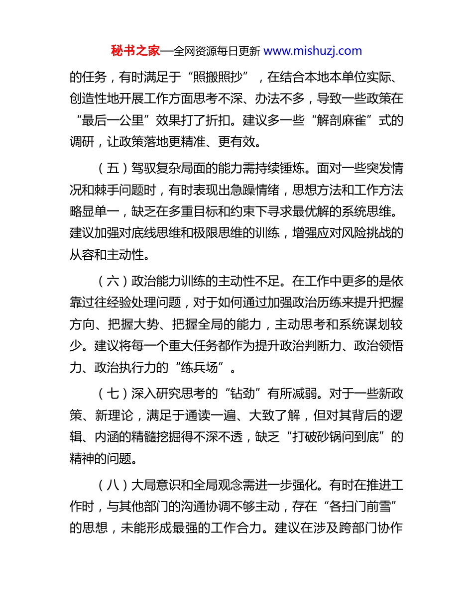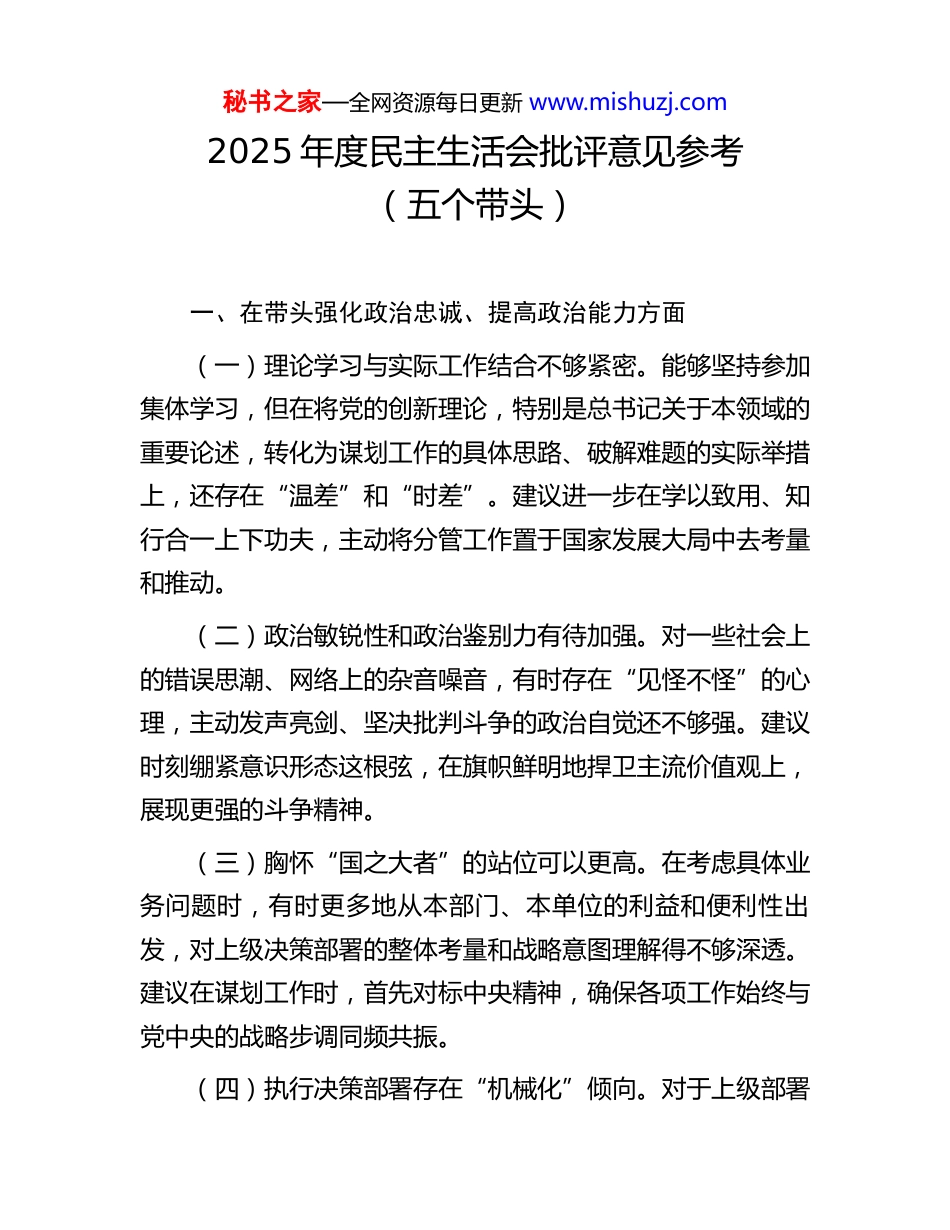 秘书之家—全网资源每日更新 www.mishuzj.com2025 年度民主生活会批评意见参考(五个带头)一、在带头强化政治忠诚、提高政治能力方面(一)理论学习与实际工作结合不够紧密。能够坚持参加集体学习,但在将党的创新理论,特别是总书记关于本领域的重要论述,转化为谋划工作的具体思路、破解难题的实际举措上,还存在“温差”和“时差”。建议进一步在学以致用、知行合一上下功夫,主动将分管工作置于国家发展大局中去考量和推动。(二)政治敏锐性和政治鉴别力有待加强。对一些社会上的错误思潮、网络上的杂音噪音,有时存在“见怪不怪”的心理,主动发声亮剑、坚决批判斗争的政治自觉还不够强。建议时刻绷紧意识形态这根弦,在旗帜鲜明地捍卫主流价值观上,展现更强的斗争精神。(三)胸怀“国之大者”的站位可以更高。在考虑具体业务问题时,有时更多地从本部门、本单位的利益和便利性出发,对上级决策部署的整体考量和战略意图理解得不够深透。建议在谋划工作时,首先对标中央精神,确保各项工作始终与党中央的战略步调同频共振。(四)执行决策部署存在“机械化”倾向。对于上级部署秘书之家—全网资源每日更新 www.mishuzj.com的任务,有时满足于“照搬照抄”,在结合本地本单位实际、创造性地开展工作方面思考不深、办法不多,导致一些政策在“最后一公里”效果打了折扣。建议多一些“解剖麻雀”式的调研,让政策落地更精准、更有效。(五)驾驭复杂局面的能力需持续锤炼。面对一些突发情况和棘手问题时,有时表现出急躁情绪,思想方法和工作方法略显单一,缺乏在多重目标和约束下寻求最优解的系统思维。建议加强对底线思维和极限思维的训练,增强应对风险挑战的从容和主动性。(六)政治能力训练的主动性不足。在工作中更多的是依靠过往经验处理问题,对于如何通过加强政治历练来提升把握方向、把握大势、把握全局的能力,主动思考和系统谋划较少。建议将每一个重大任务都作为提升政治判断力、政治领悟力、政治执行力的“练兵场”。(七)深入研究思考的“钻劲”有所减弱。对于一些新政策、新理论,满足于通读一遍、大致了解,但对其背后的逻辑、内涵的精髓挖掘得不深不透,缺乏“打破砂锅问到底”的精神的问题。(八)大局意识和全局观念需进一步强化。有时在推进工作时,与其他部门的沟通协调不够主动,存在“各扫门前雪”的思想,未能形成最强的工作合力。建议在涉及跨部门协作秘书之家—全网资源每日更新 www.mishuzj.com时,主动向前一步,多沟通、多补台。(九)对分管领域干部政治素质的考察不够深入。更多关注干部的业务能力和工作实绩,但在其政治忠诚、政治定力等方面的日常了解和考察上,下的功夫还不够,未能做到见微知著、防患未然。(十)政策宣传的“群众语言”转化不足。在向基层和群众宣讲党的方针政策时,习惯于讲理论、用术语,未能完全转化为群众听得懂、能共鸣的“家常话”,影响了政策的入耳入心。(十一)在贯彻新发展理念上存在思维惯性。面对一些传统路径依赖较强的工作,创新突破的决心和勇气还不够大,对于如何用新发展理念指导实践、破解发展难题,探索性、开创性的举措不多。(十二)对“两个确立”的决定性意义领悟需再深化。在日常工作中,虽然能够做到“两个维护”,但在思想深处,对于“两个确立”如何为我们应对惊涛骇浪提供了根本保证,对其历史逻辑和现实意义的思考和感悟还可以更深一层。二、在带头固本培元、增强党性方面(一)参加党内政治生活的“仪式感”有所淡化。虽然能按时参加组织生活,但有时将其等同于一般的工作会议,发言准备不够充分,批评和自我批评辣味不足,未能完全达到“红秘书之家—全网资源每日更新 www.mishuzj.com脸出汗、排毒治病”的效果。(二)党性分析的深刻性有待提升。在撰写党性分析材料或进行自我剖析时,对问题的根源挖掘不够深入,多是查找客观原因和外部因素,从世界观、人生观、价值观这个“总开关”上进行反思和剖析的力度不足。(三)对年轻党员的“传帮带”作用发挥不充分。与年轻党员干部的谈心谈话,多是围绕业务工作,对其思想动态、成长困惑的关心了解不够,在传承红色基因、加强党性...