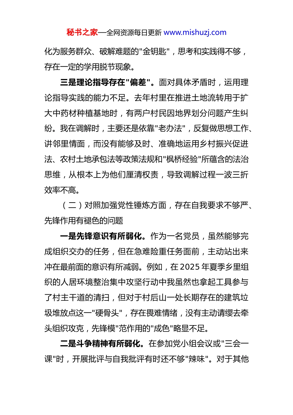 秘书之家—全网资源每日更新 www.mishuzj.com2025 年度组织生活会个人对照检查按照 XX 要求,本人严格对照党员标准,聚焦党员本位,从五个方面进行深刻的自我剖析和检视,恳请各位同志批评指正。一、存在的主要问题(一)对照贯彻党的创新理论方面,存在学思践悟不够深、知行合一有差距的问题一是理论学习存在"温差"。对于党的二十届四中全会提出的关于全面深化改革、推进中国式现代化的宏伟蓝图在集中学习时能够认真听、记笔记,但会后主动钻研、深化理解的劲头不足。有时觉得这些宏大叙事距离我们基层党员的日常工作较远,未能完全将全会精神的深刻内涵与我所在的**村的发展实际紧密结合起来,思考如何将中央的顶层设计转化为推动本村茶产业升级的具体路径导致学习的深度和温度不够。二是理论转化存在"落差"。在推动"党建引领信用村建设"工作中,我虽然能够向村民解释政策的基本框架和流程,但在如何利用这一机制真正解决产业发展中"融资难、贷款慢"的实际问题上,办法不多、思路不宽。更多时候是停留在完成上级布置的任务层面,对于如何将党的创新理论转秘书之家—全网资源每日更新 www.mishuzj.com化为服务群众、破解难题的"金钥匙",思考和实践得不够,存在一定的学用脱节现象。三是理论指导存在"偏差"。面对具体矛盾时,运用理论指导实践的能力不足。去年村里在推进土地流转用于扩大中药材种植基地时,有两户村民因地界划分问题产生纠纷。我在调解时,主要还是依靠"老办法",反复做思想工作、讲邻里情面,而没有能够及时、准确地运用乡村振兴促进法、农村土地承包法等政策法规和"枫桥经验"所蕴含的法治思维,从根本上为他们厘清权责,导致调解过程一波三折效率不高。(二)对照加强党性锤炼方面,存在自我要求不够严、先锋作用有褪色的问题一是先锋意识有所弱化。作为一名党员,虽然能够完成组织交办的任务,但在急难险重任务面前,主动站出来冲在最前面的意识有所减弱。例如,在 2025 年夏季乡里组织的人居环境整治集中攻坚行动中我虽然也拿起工具参与了村主干道的清扫,但对于村后山一处长期存在的建筑垃圾堆放点这一"硬骨头",存在畏难情绪,没有主动请缨去牵头组织攻克,先锋模"范作用的"成色"略显不足。二是斗争精神有所弱化。在参加党小组会议或"三会一课"时,开展批评与自我批评有时还不够"辣味"。对于其他秘书之家—全网资源每日更新 www.mishuzj.com同志的一些小问题,总觉得是细枝末节,抱着与人为善的心态,多栽花、少栽刺,点到即止,没有真正做到红脸出汗、排毒治病。对自己存在的问题,也偶尔会选择性地轻描淡写怕说多了、说重了会丢面子,党内政治生活的熔炉作用未能充分发挥。三是奉献精神有所减退。随着年龄增长和工作趋于稳定,有时会不自觉地产生"歇歇脚"的念头。对于参与志愿服务、为群众办实事等活动,虽然也积极响应,但与一些年轻新党员相比,那股子废寝忘食、不计得失的劲头有所消减。有时会把参加主题党日活动或完成党员积分管理任务看作是必须履行的硬指标而忽略了其背后锤炼党性、服务群众的根本目的。(三)对照联系服务群众方面,存在深入基层不够勤、为民办事有欠缺的问题一是服务群众不够主动。习惯于在村委会"坐等上门",等着群众来反映问题,而主动下沉到田间地头、农家院落了解民情的时候少了。去年乡里推广残疾人家庭无障碍改造项目全乡投入 9.8 万元惠及了 28 户家庭。我所在片区的一户残疾老人,是我在一次偶然闲聊中才得知其有改造需求,而不是通过我主动摸排发现的。这反映出我"群众利益无小事"的观念树得还不够牢固。秘书之家—全网资源每日更新 www.mishuzj.com二是服务方式不够精细。在为群众排忧解难时,有时方法比较单一,缺乏"绣花"功夫。在参与 XX 实践活动中,我曾帮助一位村民联系修复了门前的自来水管。但事情办完后,没有再进一步了解他家在产业发展、子女教育等方面是否还有其他困难,服务仅仅停留在了"头痛医头、脚痛医脚"的浅层,未能提供更加系统化、个性化的关怀与帮助。三是服务效果不够持久。去年我曾协助几户青年村民申请了返乡创业的小额贷款,在申请阶段跑前跑后,帮助他们备齐了材料。但贷款发...