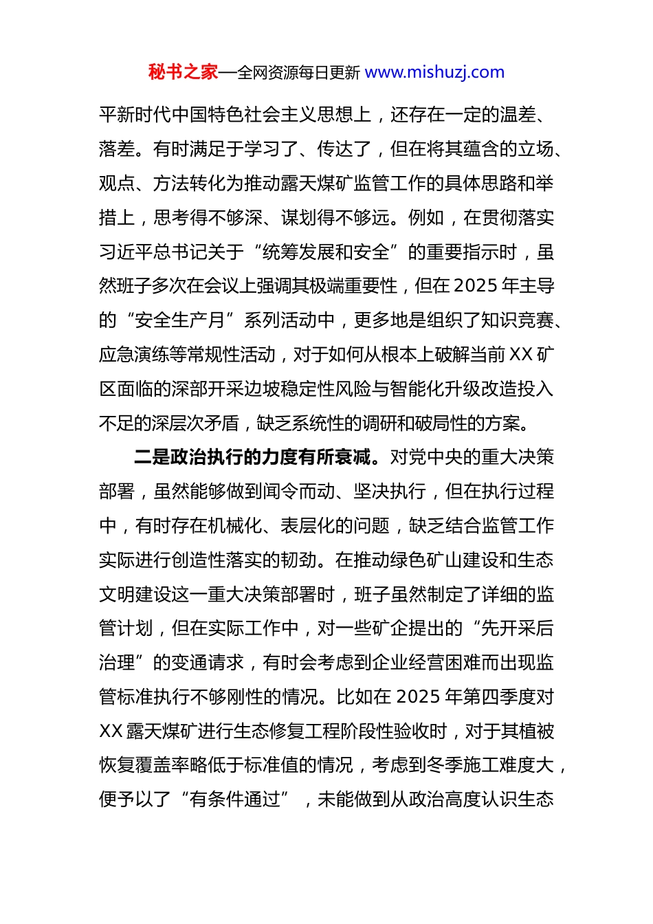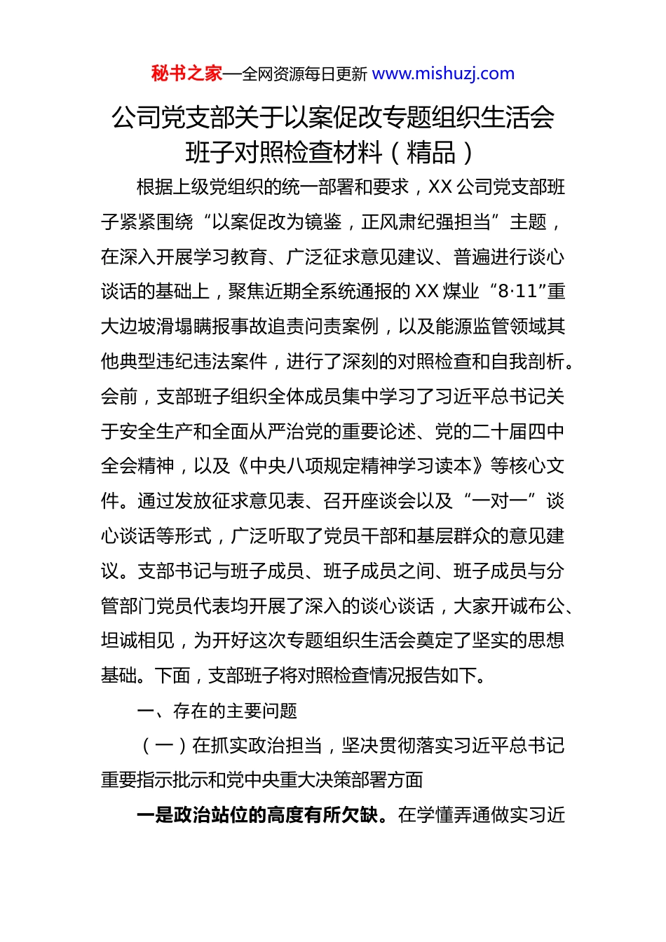 秘书之家—全网资源每日更新 www.mishuzj.com公司党支部关于以案促改专题组织生活会班子对照检查材料(精品)根据上级党组织的统一部署和要求,XX 公司党支部班子紧紧围绕“以案促改为镜鉴,正风肃纪强担当”主题,在深入开展学习教育、广泛征求意见建议、普遍进行谈心谈话的基础上,聚焦近期全系统通报的 XX 煤业“8·11”重大边坡滑塌瞒报事故追责问责案例,以及能源监管领域其他典型违纪违法案件,进行了深刻的对照检查和自我剖析。会前,支部班子组织全体成员集中学习了习近平总书记关于安全生产和全面从严治党的重要论述、党的二十届四中全会精神,以及《中央八项规定精神学习读本》等核心文件。通过发放征求意见表、召开座谈会以及“一对一”谈心谈话等形式,广泛听取了党员干部和基层群众的意见建议。支部书记与班子成员、班子成员之间、班子成员与分管部门党员代表均开展了深入的谈心谈话,大家开诚布公、坦诚相见,为开好这次专题组织生活会奠定了坚实的思想基础。下面,支部班子将对照检查情况报告如下。一、存在的主要问题(一)在抓实政治担当,坚决贯彻落实习近平总书记重要指示批示和党中央重大决策部署方面一是政治站位的高度有所欠缺。在学懂弄通做实习近秘书之家—全网资源每日更新 www.mishuzj.com平新时代中国特色社会主义思想上,还存在一定的温差、落差。有时满足于学习了、传达了,但在将其蕴含的立场、观点、方法转化为推动露天煤矿监管工作的具体思路和举措上,思考得不够深、谋划得不够远。例如,在贯彻落实习近平总书记关于“统筹发展和安全”的重要指示时,虽然班子多次在会议上强调其极端重要性,但在 2025 年主导的“安全生产月”系列活动中,更多地是组织了知识竞赛、应急演练等常规性活动,对于如何从根本上破解当前 XX 矿区面临的深部开采边坡稳定性风险与智能化升级改造投入不足的深层次矛盾,缺乏系统性的调研和破局性的方案。二是政治执行的力度有所衰减。对党中央的重大决策部署,虽然能够做到闻令而动、坚决执行,但在执行过程中,有时存在机械化、表层化的问题,缺乏结合监管工作实际进行创造性落实的韧劲。在推动绿色矿山建设和生态文明建设这一重大决策部署时,班子虽然制定了详细的监管计划,但在实际工作中,对一些矿企提出的“先开采后治理”的变通请求,有时会考虑到企业经营困难而出现监管标准执行不够刚性的情况。比如在 2025 年第四季度对XX 露天煤矿进行生态修复工程阶段性验收时,对于其植被恢复覆盖率略低于标准值的情况,考虑到冬季施工难度大,便予以了“有条件通过”,未能做到从政治高度认识生态秘书之家—全网资源每日更新 www.mishuzj.com环保的“国之大者”,严格执行监管标准。三是政治监督的锐度有所钝化。作为承担监管职责的国企党支部,对所监管领域内企业党组织贯彻执行党的路线方针政策情况的监督意识还不够强。习惯于将目光聚焦在安全生产、环保指标等业务层面,对于被监管企业是否存在党的领导弱化、党的建设缺失等深层次政治问题,主动去了解、去监督的意识和手段都有所不足。在日常监管工作中,与矿企党组织的沟通多是围绕业务展开,很少主动过问其“三会一课”质量、党员先锋模用发挥等情况,未能有效形成监管合力,发挥政治监督“探头”作用。(二)在抓实“一岗双责”,筑牢职责与廉政双重防线方面一是党员职责与业务工作的融合度不够。作为党员领导干部,在履行岗位职责时,有时未能时时处处以党员的先进性标准来审视和要求自己。在思想深处,存在一种“业务过硬就是最大政治”的模糊认识,导致党建工作与监管业务“两张皮”现象依然存在。在部署业务工作时,强调技术规范、管理流程的多,但结合业务特点同步强调廉政风险、同步进行党性教育的少。2025 年组织对《露天煤矿安全规程》进行再学习再培训时,主要精力放在了对边坡角、台阶高度等技术参数的解读上,对于规程背后所秘书之家—全网资源每日更新 www.mishuzj.com体现的敬畏生命、敬畏法纪的党员责任担当精神,挖掘和阐释得不够深入。二是岗位职责中的廉政风险排查不够主动。对监管工作中存在的廉政风险点,虽然有制度性的排查机制...