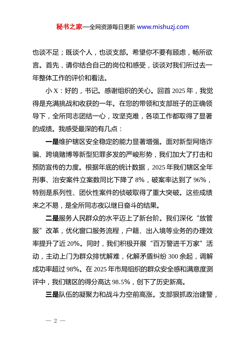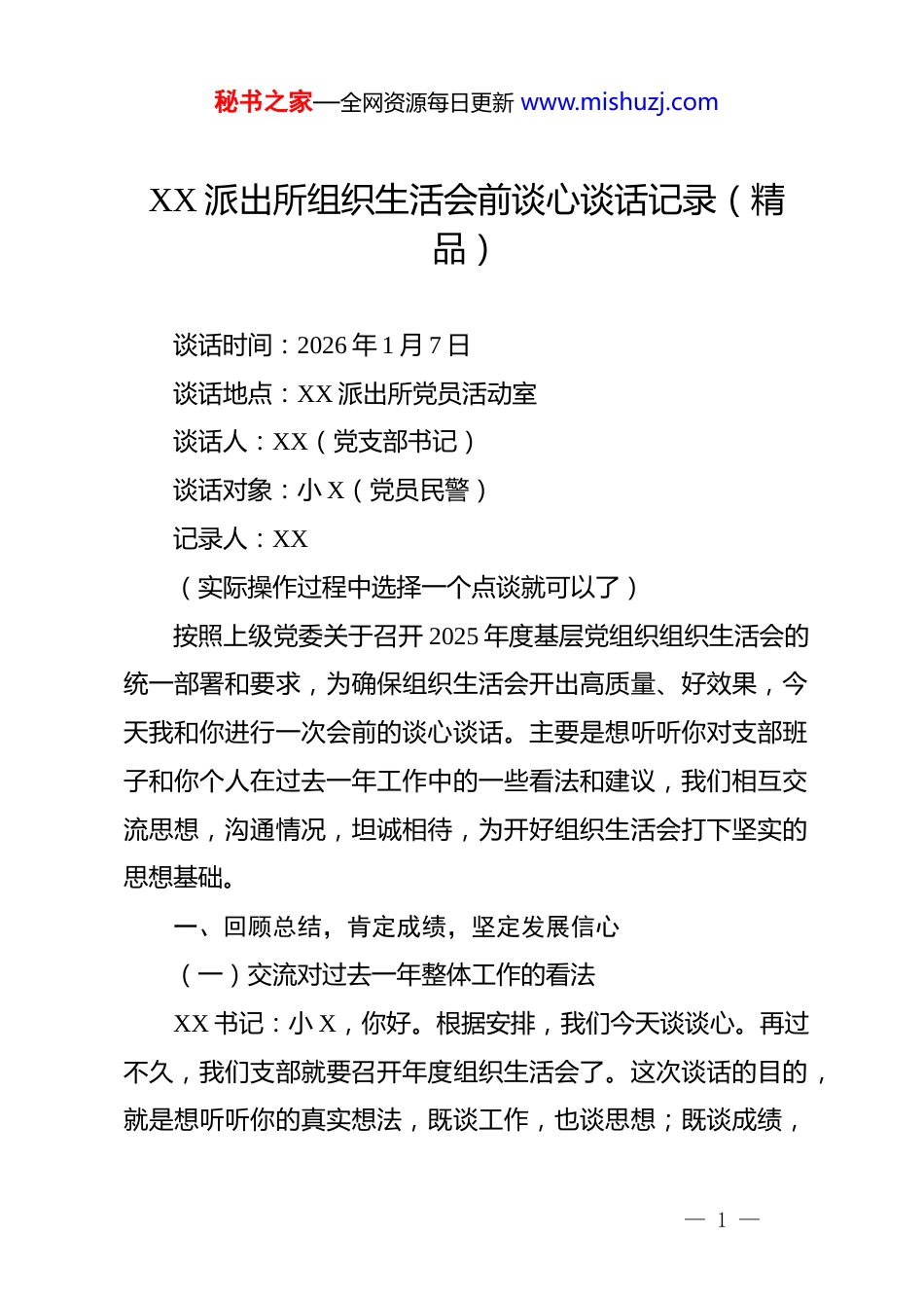 秘书之家—全网资源每日更新 www.mishuzj.comXX 派出所组织生活会前谈心谈话记录(精品)谈话时间:2026 年 1 月 7 日谈话地点:XX 派出所党员活动室谈话人:XX(党支部书记)谈话对象:小 X(党员民警)记录人:XX(实际操作过程中选择一个点谈就可以了)按照上级党委关于召开 2025 年度基层党组织组织生活会的统一部署和要求,为确保组织生活会开出高质量、好效果,今天我和你进行一次会前的谈心谈话。主要是想听听你对支部班子和你个人在过去一年工作中的一些看法和建议,我们相互交流思想,沟通情况,坦诚相待,为开好组织生活会打下坚实的思想基础。一、回顾总结,肯定成绩,坚定发展信心(一)交流对过去一年整体工作的看法XX 书记:小 X,你好。根据安排,我们今天谈谈心。再过不久,我们支部就要召开年度组织生活会了。这次谈话的目的,就是想听听你的真实想法,既谈工作,也谈思想;既谈成绩,— 1 —秘书之家—全网资源每日更新 www.mishuzj.com也谈不足;既谈个人,也谈支部。希望你不要有顾虑,畅所欲言。首先,请你结合自己的岗位和感受,谈谈对我们所过去一年整体工作的评价和看法。小 X:好的,书记。感谢组织的关心。回首 2025 年,我觉得是充满挑战和收获的一年。在您的带领和支部班子的正确领导下,全所同志团结一心,攻坚克难,各项工作都取得了显著的成绩。我感受最深的有几点:一是维护辖区安全稳定的能力显著增强。面对新型网络诈骗、跨境赌博等新型犯罪多发的严峻形势,我们加大了打击和预防宣传的力度。根据年底的统计数据,2025 年我们辖区全年刑事、治安案件立案数同比下降了 8%,破案率达到了 96%,特别是系列性、团伙性案件的侦破取得了重大突破。这些成绩来之不易,是全所同志夜以继日奋斗的结果。二是服务人民群众的水平迈上了新台阶。我们深化“放管服”改革,优化窗口服务流程,户籍、出入境等业务的办理效率提升了近 20%。同时,我们积极开展“百万警进千万家”活动,主动上门为群众排忧解难,化解矛盾纠纷 300 余起,调解成功率超过 98%。在 2025 年市局组织的群众安全感和满意度测评中,我们辖区的得分高达 98.5%,创下了历史新高。三是队伍的凝聚力和战斗力空前高涨。支部狠抓政治建警,— 2 —秘书之家—全网资源每日更新 www.mishuzj.com常态化开展政治理论学习和党史学习教育,全体民警的政治判断力、政治领悟力、政治执行力得到了有效提升。大家心往一处想,劲往一处使,无论是日常巡逻防控,还是重大安保任务,都能做到召之即来、来之能战、战之必胜。(二)肯定成绩并指出努力方向XX 书记:你总结得很好,很全面,这些成绩的取得,离不开包括你在内的每一位同志的辛勤付出。数据是最好的证明,群众的肯定是最高的褒奖。这些成绩是我们继续前进的底气和信心所在。但同时我们也要清醒地看到,成绩属于过去,未来的挑战依然严峻。对标新时代公安工作的新要求和人民群众的新期待,我们的工作还有不少需要改进和提升的地方。这也是我们这次谈心谈话和即将召开的组织生活会需要重点解决的问题。二、对照检查,查摆问题,深刻剖析根源(一)引导个人进行自我剖析XX 书记:小 X,你作为我们所的青年骨干,业务能力强,工作热情高,这是大家有目共睹的。但“金无足赤,人无完人”,按照“吾日三省吾身”的要求,请你结合思想、工作、作风和廉洁自律等方面,认真查摆一下自己存在哪些不足之处,并深刻剖析一下产生问题的原因。— 3 —秘书之家—全网资源每日更新 www.mishuzj.com小 X:谢谢书记的肯定,这更是对我的鞭策。经过认真反思,我感到自己主要存在以下几个方面的问题:一是在理论学习的深度和广度上还有差距。平时忙于接处警、办案和值班备勤,客观上挤占了学习时间。主观上对理论学习的重要性认识还不够深刻,存在“以干代学”的现象。学习习近平新时代中国特色社会主义思想和党的最新理论成果时,往往满足于通读一遍、学过一遍,但在“学懂、弄通、做实”上下的功夫不够,特别是运用党的创新理论指导实践、破解工作难题的能力还有待提高。比如,在处理一些涉及新领域、新业态的复杂警情时,偶...