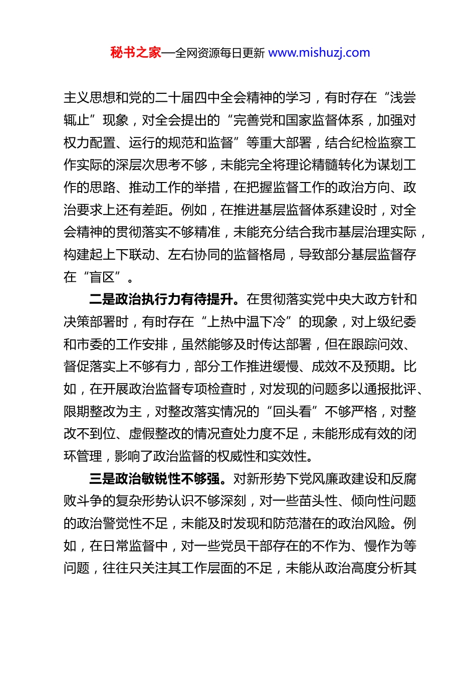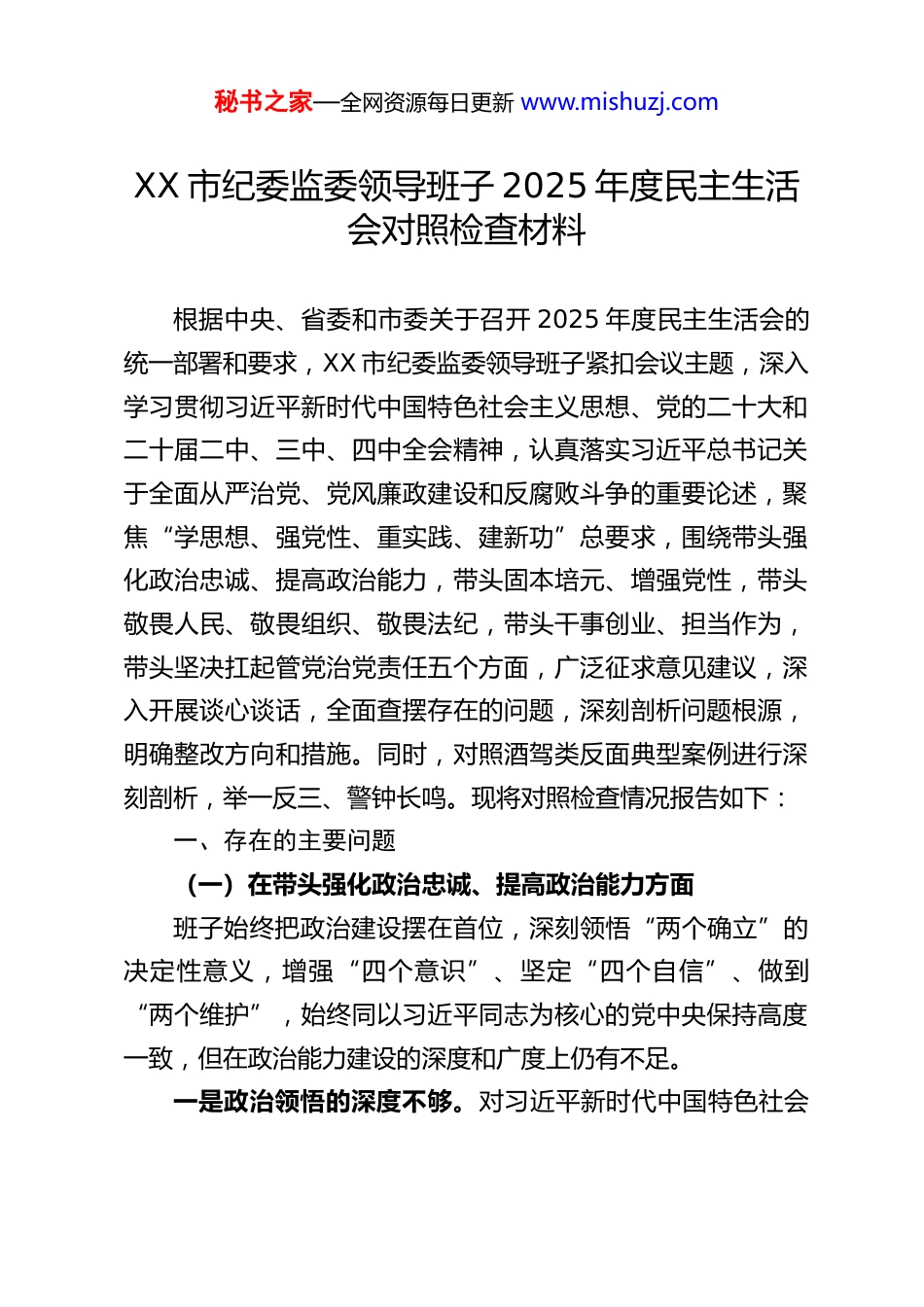 秘书之家—全网资源每日更新 www.mishuzj.comXX 市纪委监委领导班子 2025 年度民主生活会对照检查材料根据中央、省委和市委关于召开 2025 年度民主生活会的统一部署和要求,XX 市纪委监委领导班子紧扣会议主题,深入学习贯彻习近平新时代中国特色社会主义思想、党的二十大和二十届二中、三中、四中全会精神,认真落实习近平总书记关于全面从严治党、党风廉政建设和反腐败斗争的重要论述,聚焦“学思想、强党性、重实践、建新功”总要求,围绕带头强化政治忠诚、提高政治能力,带头固本培元、增强党性,带头敬畏人民、敬畏组织、敬畏法纪,带头干事创业、担当作为,带头坚决扛起管党治党责任五个方面,广泛征求意见建议,深入开展谈心谈话,全面查摆存在的问题,深刻剖析问题根源,明确整改方向和措施。同时,对照酒驾类反面典型案例进行深刻剖析,举一反三、警钟长鸣。现将对照检查情况报告如下:一、存在的主要问题(一)在带头强化政治忠诚、提高政治能力方面班子始终把政治建设摆在首位,深刻领悟“两个确立”的决定性意义,增强“四个意识”、坚定“四个自信”、做到“两个维护”,始终同以习近平同志为核心的党中央保持高度一致,但在政治能力建设的深度和广度上仍有不足。一是政治领悟的深度不够。对习近平新时代中国特色社会秘书之家—全网资源每日更新 www.mishuzj.com主义思想和党的二十届四中全会精神的学习,有时存在“浅尝辄止”现象,对全会提出的“完善党和国家监督体系,加强对权力配置、运行的规范和监督”等重大部署,结合纪检监察工作实际的深层次思考不够,未能完全将理论精髓转化为谋划工作的思路、推动工作的举措,在把握监督工作的政治方向、政治要求上还有差距。例如,在推进基层监督体系建设时,对全会精神的贯彻落实不够精准,未能充分结合我市基层治理实际,构建起上下联动、左右协同的监督格局,导致部分基层监督存在“盲区”。二是政治执行力有待提升。在贯彻落实党中央大政方针和决策部署时,有时存在“上热中温下冷”的现象,对上级纪委和市委的工作安排,虽然能够及时传达部署,但在跟踪问效、督促落实上不够有力,部分工作推进缓慢、成效不及预期。比如,在开展政治监督专项检查时,对发现的问题多以通报批评、限期整改为主,对整改落实情况的“回头看”不够严格,对整改不到位、虚假整改的情况查处力度不足,未能形成有效的闭环管理,影响了政治监督的权威性和实效性。三是政治敏锐性不够强。对新形势下党风廉政建设和反腐败斗争的复杂形势认识不够深刻,对一些苗头性、倾向性问题的政治警觉性不足,未能及时发现和防范潜在的政治风险。例如,在日常监督中,对一些党员干部存在的不作为、慢作为等问题,往往只关注其工作层面的不足,未能从政治高度分析其秘书之家—全网资源每日更新 www.mishuzj.com背后的政治隐患,未能及时提醒、坚决纠正,导致部分问题逐渐升级,影响了党的形象和公信力。四是战略定力不够坚定。面对反腐败斗争的严峻复杂形势,有时存在一定的畏难情绪,对一些难度大、涉及面广的腐败案件,缺乏“一查到底、绝不姑息”的坚定决心,在案件查办过程中,受到各种因素干扰时,斗争精神有所弱化。同时,在推动党风廉政建设和反腐败斗争向纵深发展时,对一些长期存在的顽瘴痼疾,缺乏持之以恒、久久为功的韧劲,整治效果不够彻底。(二)在带头固本培元、增强党性方面班子始终坚持把政治修养摆在党性修养的首位,自觉以习近平新时代中国特色社会主义思想凝心铸魂,认真学习党章党规党纪,努力筑牢党员干部的思想道德防线,但在党性修养的常态化、制度化建设上仍有欠缺。一是理论学习不够扎实。虽然建立了常态化学习机制,但学习形式较为单一,多以集中学习、专题研讨为主,缺乏针对性和实效性,部分班子成员存在“被动学习”“应付学习”的现象,对党章党规党纪和党的创新理论的学习不够系统、不够深入,未能真正做到学深悟透、融会贯通。例如,在开展深入贯彻中央八项规定精神学习教育时,对八项规定及其实施细则精神的学习不够细致,对近年来中央出台的一系列配套规定和纪律要求,掌握不够全面,导致在监督执纪过程中,...