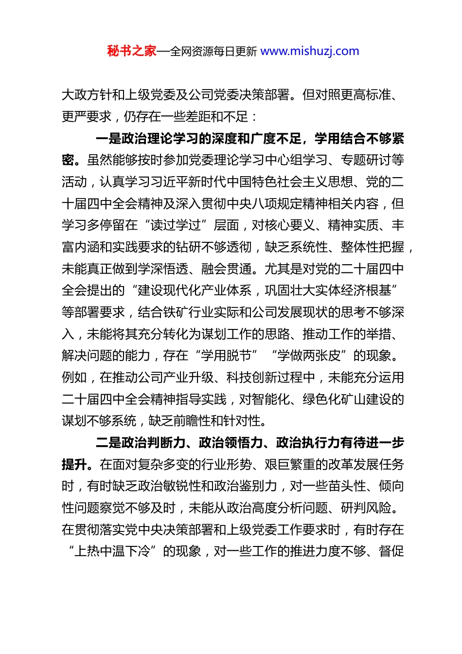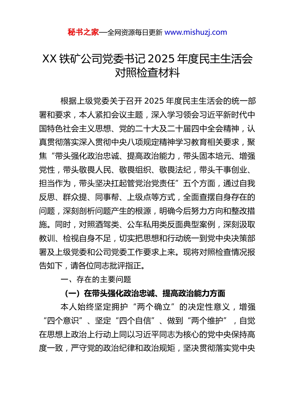秘书之家—全网资源每日更新 www.mishuzj.comXX 铁矿公司党委书记 2025 年度民主生活会对照检查材料根据上级党委关于召开 2025 年度民主生活会的统一部署和要求,本人紧扣会议主题,深入学习领会习近平新时代中国特色社会主义思想、党的二十大及二十届四中全会精神,认真贯彻落实深入贯彻中央八项规定精神学习教育相关要求,聚焦“带头强化政治忠诚、提高政治能力,带头固本培元、增强党性,带头敬畏人民、敬畏组织、敬畏法纪,带头干事创业、担当作为,带头坚决扛起管党治党责任”五个方面,通过自我反思、群众提、同事帮、上级点等方式,全面查摆自身存在的问题,深刻剖析问题产生的根源,明确今后努力方向和整改措施。同时,对照酒驾类、公车私用类反面典型案例,深刻汲取教训、检视自身不足,切实把思想和行动统一到党中央决策部署及上级党委和公司党委工作要求上来。现将对照检查情况报告如下,请各位同志批评指正。一、存在的主要问题(一)在带头强化政治忠诚、提高政治能力方面本人始终坚定拥护“两个确立”的决定性意义,增强“四个意识”、坚定“四个自信”、做到“两个维护”,自觉在思想上政治上行动上同以习近平同志为核心的党中央保持高度一致,严守党的政治纪律和政治规矩,坚决贯彻落实党中央秘书之家—全网资源每日更新 www.mishuzj.com大政方针和上级党委及公司党委决策部署。但对照更高标准、更严要求,仍存在一些差距和不足:一是政治理论学习的深度和广度不足,学用结合不够紧密。虽然能够按时参加党委理论学习中心组学习、专题研讨等活动,认真学习习近平新时代中国特色社会主义思想、党的二十届四中全会精神及深入贯彻中央八项规定精神相关内容,但学习多停留在“读过学过”层面,对核心要义、精神实质、丰富内涵和实践要求的钻研不够透彻,缺乏系统性、整体性把握,未能真正做到学深悟透、融会贯通。尤其是对党的二十届四中全会提出的“建设现代化产业体系,巩固壮大实体经济根基”等部署要求,结合铁矿行业实际和公司发展现状的思考不够深入,未能将其充分转化为谋划工作的思路、推动工作的举措、解决问题的能力,存在“学用脱节”“学做两张皮”的现象。例如,在推动公司产业升级、科技创新过程中,未能充分运用二十届四中全会精神指导实践,对智能化、绿色化矿山建设的谋划不够系统,缺乏前瞻性和针对性。二是政治判断力、政治领悟力、政治执行力有待进一步提升。在面对复杂多变的行业形势、艰巨繁重的改革发展任务时,有时缺乏政治敏锐性和政治鉴别力,对一些苗头性、倾向性问题察觉不够及时,未能从政治高度分析问题、研判风险。在贯彻落实党中央决策部署和上级党委工作要求时,有时存在“上热中温下冷”的现象,对一些工作的推进力度不够、督促秘书之家—全网资源每日更新 www.mishuzj.com检查不够严格,存在“重部署、轻落实”“重形式、轻实效”的问题,导致部分决策部署落地见效不够明显。例如,在落实上级关于安全生产、生态环保的决策部署时,虽然召开了会议、下发了文件,但在后续跟踪问效、督促整改方面不够到位,部分基层单位仍存在侥幸心理,隐患排查整治不够彻底,反映出本人政治执行力仍需加强。三是战略定力和必胜信心有待进一步增强。面对铁矿行业市场波动、资源禀赋制约、环保压力加大、安全生产形势严峻等多重挑战,有时存在焦虑情绪和畏难心理,对公司长远发展的战略思考不够深入,缺乏“功成不必在我、功成必定有我”的境界和担当,在一些重点工作、难点任务的推进过程中,有时会出现动摇和松懈,未能始终保持战略定力和必胜信心,坚定不移推动公司高质量发展。同时,对深入贯彻中央八项规定精神学习教育的长期性、艰巨性认识不够深刻,认为经过多年整治,作风建设已经取得明显成效,存在松懈麻痹思想,未能始终以钉钉子精神锲而不舍推进作风建设。(二)在带头固本培元、增强党性方面本人始终坚持把政治修养摆在党性修养的首位,自觉以习近平新时代中国特色社会主义思想凝心铸魂,坚守共产党人精神追求,认真学习党章党规党纪,努力解决好世界观、人生观、价值观这个总开关问题,坚定理想信念、筑牢对党忠诚、厚植为民情...