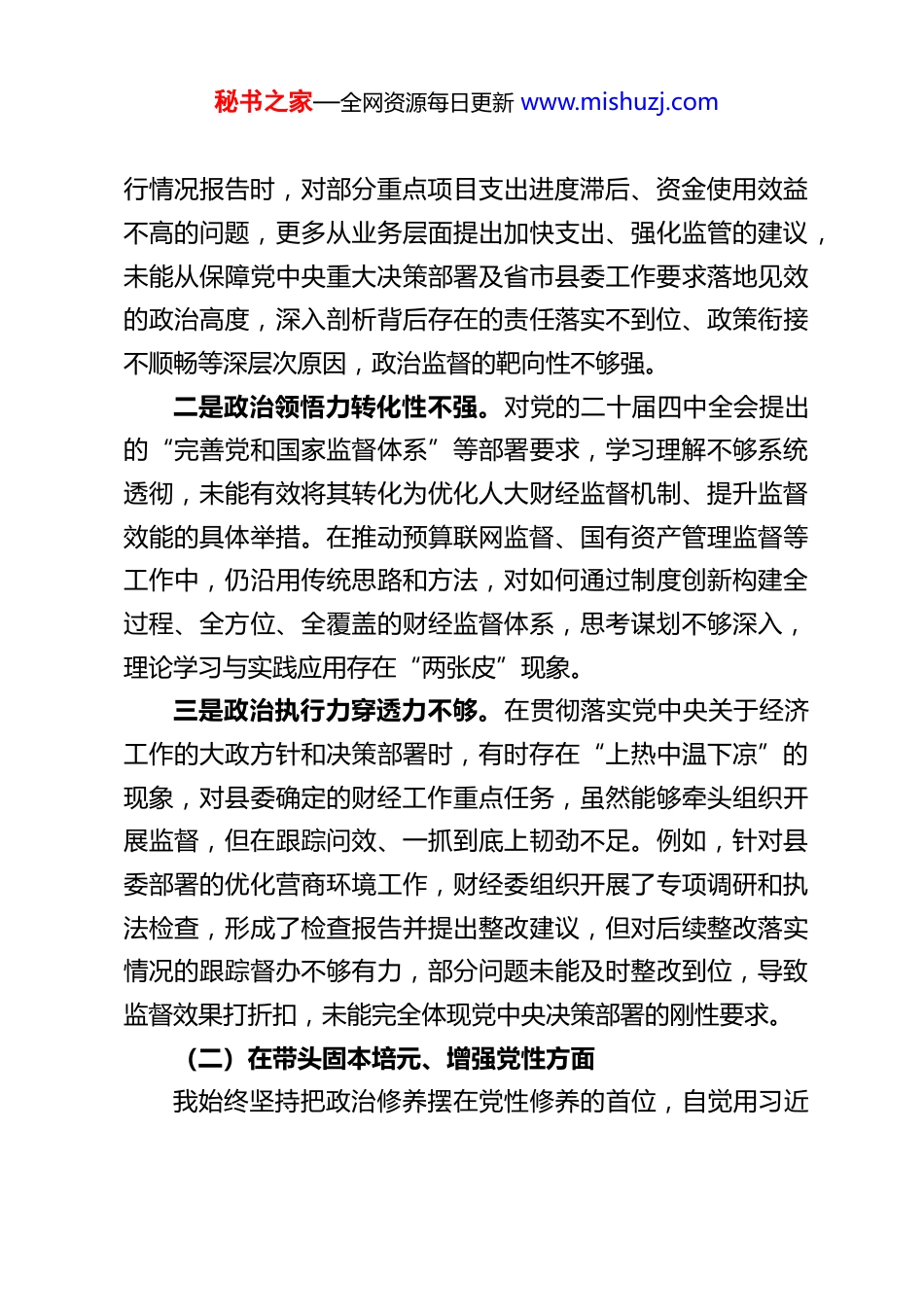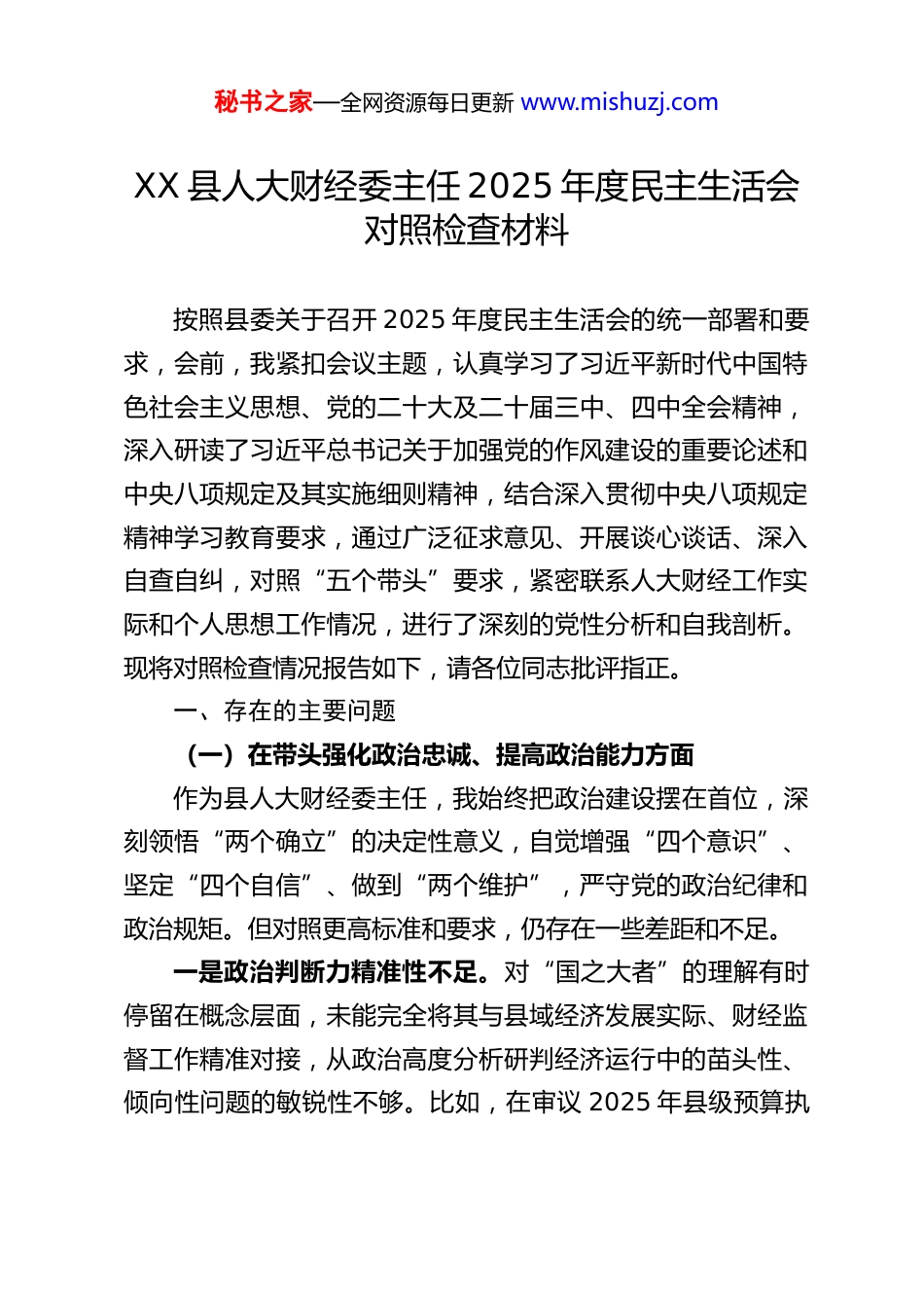 秘书之家—全网资源每日更新 www.mishuzj.comXX 县人大财经委主任 2025 年度民主生活会对照检查材料按照县委关于召开 2025 年度民主生活会的统一部署和要求,会前,我紧扣会议主题,认真学习了习近平新时代中国特色社会主义思想、党的二十大及二十届三中、四中全会精神,深入研读了习近平总书记关于加强党的作风建设的重要论述和中央八项规定及其实施细则精神,结合深入贯彻中央八项规定精神学习教育要求,通过广泛征求意见、开展谈心谈话、深入自查自纠,对照“五个带头”要求,紧密联系人大财经工作实际和个人思想工作情况,进行了深刻的党性分析和自我剖析。现将对照检查情况报告如下,请各位同志批评指正。一、存在的主要问题(一)在带头强化政治忠诚、提高政治能力方面作为县人大财经委主任,我始终把政治建设摆在首位,深刻领悟“两个确立”的决定性意义,自觉增强“四个意识”、坚定“四个自信”、做到“两个维护”,严守党的政治纪律和政治规矩。但对照更高标准和要求,仍存在一些差距和不足。一是政治判断力精准性不足。对“国之大者”的理解有时停留在概念层面,未能完全将其与县域经济发展实际、财经监督工作精准对接,从政治高度分析研判经济运行中的苗头性、倾向性问题的敏锐性不够。比如,在审议 2025 年县级预算执秘书之家—全网资源每日更新 www.mishuzj.com行情况报告时,对部分重点项目支出进度滞后、资金使用效益不高的问题,更多从业务层面提出加快支出、强化监管的建议,未能从保障党中央重大决策部署及省市县委工作要求落地见效的政治高度,深入剖析背后存在的责任落实不到位、政策衔接不顺畅等深层次原因,政治监督的靶向性不够强。二是政治领悟力转化性不强。对党的二十届四中全会提出的“完善党和国家监督体系”等部署要求,学习理解不够系统透彻,未能有效将其转化为优化人大财经监督机制、提升监督效能的具体举措。在推动预算联网监督、国有资产管理监督等工作中,仍沿用传统思路和方法,对如何通过制度创新构建全过程、全方位、全覆盖的财经监督体系,思考谋划不够深入,理论学习与实践应用存在“两张皮”现象。三是政治执行力穿透力不够。在贯彻落实党中央关于经济工作的大政方针和决策部署时,有时存在“上热中温下凉”的现象,对县委确定的财经工作重点任务,虽然能够牵头组织开展监督,但在跟踪问效、一抓到底上韧劲不足。例如,针对县委部署的优化营商环境工作,财经委组织开展了专项调研和执法检查,形成了检查报告并提出整改建议,但对后续整改落实情况的跟踪督办不够有力,部分问题未能及时整改到位,导致监督效果打折扣,未能完全体现党中央决策部署的刚性要求。(二)在带头固本培元、增强党性方面我始终坚持把政治修养摆在党性修养的首位,自觉用习近秘书之家—全网资源每日更新 www.mishuzj.com平新时代中国特色社会主义思想凝心铸魂,认真学习党章党规党纪,努力坚守共产党人精神追求。但对照党性修养的高标准,仍存在一些薄弱环节。一是理论武装不够系统深入。存在碎片化学习、被动式学习的问题,对习近平新时代中国特色社会主义思想的核心要义、精神实质、丰富内涵和实践要求,学习不够全面系统,缺乏整体性、系统性的研读和思考。在参加深入贯彻中央八项规定精神学习教育时,更多是完成规定学习任务,主动结合财经工作实际开展专题研讨、深化思想认识不够,未能真正做到学深悟透、融会贯通,运用党的创新理论指导财经监督实践、破解工作难题的能力有待提升。二是党性锤炼不够经常自觉。党内政治生活的“熔炉”作用发挥不够充分,在参加组织生活会、民主生活会时,有时存在“例行公事”的心态,开展批评与自我批评不够严肃认真。对自身存在的问题,往往避重就轻、谈业务多谈思想少;对同志存在的问题,顾虑情面、点到为止,缺乏“辣味”,未能真正达到“红脸出汗、排毒治病”的效果。在日常工作中,对自身的党性锻炼缺乏有意识的设计和坚持,有时把自己当作普通干部对待,忽视了作为党员领导干部应有的党性觉悟和先锋模范作用。三是理想信念根基不够牢固。在面对县域经济发展中的困难和挑战时,有时会产生畏难情绪,缺乏“...