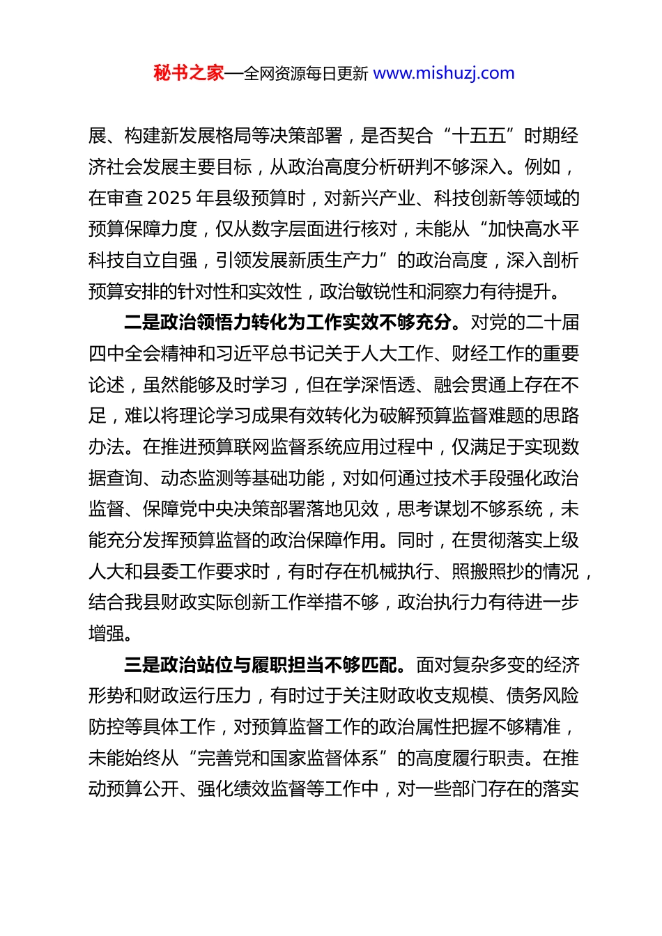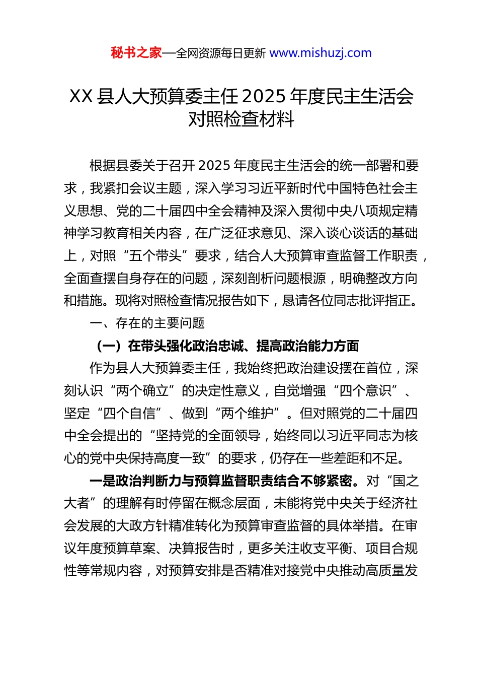秘书之家—全网资源每日更新 www.mishuzj.comXX 县人大预算委主任 2025 年度民主生活会对照检查材料根据县委关于召开 2025 年度民主生活会的统一部署和要求,我紧扣会议主题,深入学习习近平新时代中国特色社会主义思想、党的二十届四中全会精神及深入贯彻中央八项规定精神学习教育相关内容,在广泛征求意见、深入谈心谈话的基础上,对照“五个带头”要求,结合人大预算审查监督工作职责,全面查摆自身存在的问题,深刻剖析问题根源,明确整改方向和措施。现将对照检查情况报告如下,恳请各位同志批评指正。一、存在的主要问题(一)在带头强化政治忠诚、提高政治能力方面作为县人大预算委主任,我始终把政治建设摆在首位,深刻认识“两个确立”的决定性意义,自觉增强“四个意识”、坚定“四个自信”、做到“两个维护”。但对照党的二十届四中全会提出的“坚持党的全面领导,始终同以习近平同志为核心的党中央保持高度一致”的要求,仍存在一些差距和不足。一是政治判断力与预算监督职责结合不够紧密。对“国之大者”的理解有时停留在概念层面,未能将党中央关于经济社会发展的大政方针精准转化为预算审查监督的具体举措。在审议年度预算草案、决算报告时,更多关注收支平衡、项目合规性等常规内容,对预算安排是否精准对接党中央推动高质量发秘书之家—全网资源每日更新 www.mishuzj.com展、构建新发展格局等决策部署,是否契合“十五五”时期经济社会发展主要目标,从政治高度分析研判不够深入。例如,在审查 2025 年县级预算时,对新兴产业、科技创新等领域的预算保障力度,仅从数字层面进行核对,未能从“加快高水平科技自立自强,引领发展新质生产力”的政治高度,深入剖析预算安排的针对性和实效性,政治敏锐性和洞察力有待提升。二是政治领悟力转化为工作实效不够充分。对党的二十届四中全会精神和习近平总书记关于人大工作、财经工作的重要论述,虽然能够及时学习,但在学深悟透、融会贯通上存在不足,难以将理论学习成果有效转化为破解预算监督难题的思路办法。在推进预算联网监督系统应用过程中,仅满足于实现数据查询、动态监测等基础功能,对如何通过技术手段强化政治监督、保障党中央决策部署落地见效,思考谋划不够系统,未能充分发挥预算监督的政治保障作用。同时,在贯彻落实上级人大和县委工作要求时,有时存在机械执行、照搬照抄的情况,结合我县财政实际创新工作举措不够,政治执行力有待进一步增强。三是政治站位与履职担当不够匹配。面对复杂多变的经济形势和财政运行压力,有时过于关注财政收支规模、债务风险防控等具体工作,对预算监督工作的政治属性把握不够精准,未能始终从“完善党和国家监督体系”的高度履行职责。在推动预算公开、强化绩效监督等工作中,对一些部门存在的落实秘书之家—全网资源每日更新 www.mishuzj.com不力问题,多以提出整改建议为主,敢于动真碰硬、强化跟踪问效的政治担当不足,未能充分体现人大监督的政治权威。(二)在带头固本培元、增强党性方面我始终坚持以习近平新时代中国特色社会主义思想凝心铸魂,认真学习党章党规党纪,努力筑牢党性根基。但对照“把政治修养摆在党性修养首位,解决好世界观、人生观、价值观总开关问题”的要求,仍存在党性锤炼不够扎实、理想信念根基不够牢固等问题。一是理论学习的深度和实效不足。在开展深入贯彻中央八项规定精神学习教育中,存在被动学习、应付了事的情况,对习近平总书记关于作风建设的重要指示精神,以及党章党规党纪的学习不够系统深入,多停留在通读原文层面,缺乏深层次思考和实践转化。在学习党的二十届四中全会精神时,未能结合预算委工作实际开展专题研讨,对“以全面从严治党为根本保障”的理解不够深刻,理论学习与工作实践脱节的问题较为突出。同时,学习形式较为单一,多以集中学习、个人自学为主,缺乏互动交流、案例分析等生动有效的学习形式,学习积极性和主动性有待提升。二是党性锻炼的自觉性不够强。在日常工作中,更多关注业务工作推进情况,对党性修养的常态化锤炼重视不够,存在“重业务、轻党性”的倾向。在参加组织生活时,能够按时完成“三...