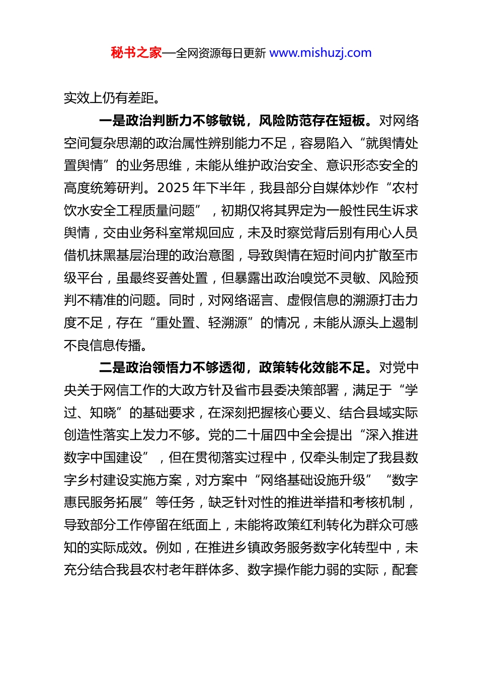 秘书之家—全网资源每日更新 www.mishuzj.comXX 县委网信办主任 2025 年度民主生活会对照检查材料根据县委关于召开 2025 年度民主生活会的统一部署和要求,本人紧扣会议主题,会前系统学习了习近平新时代中国特色社会主义思想、党的二十届三中及四中全会精神、习近平总书记关于网络强国的重要思想、深入贯彻中央八项规定精神学习教育相关要求,重温党章党规党纪及《中国共产党网络安全工作条例》等法规制度。通过参加党组理论学习中心组集中研讨、深入乡镇(街道)和网信企业调研走访、与班子成员及干部职工谈心谈话、广泛征求各方面意见建议,进一步深化了思想认识、找准了问题短板。在此基础上,严格对照“五个带头”要求,结合网信工作实际,全面查摆问题、深刻剖析根源、明确整改方向。现将对照检查情况报告如下,恳请各位领导、同志批评指正。一、存在的主要问题(一)带头强化政治忠诚、提高政治能力方面作为县委网信办主任,始终把政治忠诚作为立身之本,深刻领悟“两个确立”的决定性意义,自觉增强“四个意识”、坚定“四个自信”、做到“两个维护”,但对照党的二十届四中全会关于“国家安全体系和能力进一步加强,重点领域风险得到有效防范化解”的部署要求,在政治能力锤炼和履职尽责秘书之家—全网资源每日更新 www.mishuzj.com实效上仍有差距。一是政治判断力不够敏锐,风险防范存在短板。对网络空间复杂思潮的政治属性辨别能力不足,容易陷入“就舆情处置舆情”的业务思维,未能从维护政治安全、意识形态安全的高度统筹研判。2025 年下半年,我县部分自媒体炒作“农村饮水安全工程质量问题”,初期仅将其界定为一般性民生诉求舆情,交由业务科室常规回应,未及时察觉背后别有用心人员借机抹黑基层治理的政治意图,导致舆情在短时间内扩散至市级平台,虽最终妥善处置,但暴露出政治嗅觉不灵敏、风险预判不精准的问题。同时,对网络谣言、虚假信息的溯源打击力度不足,存在“重处置、轻溯源”的情况,未能从源头上遏制不良信息传播。二是政治领悟力不够透彻,政策转化效能不足。对党中央关于网信工作的大政方针及省市县委决策部署,满足于“学过、知晓”的基础要求,在深刻把握核心要义、结合县域实际创造性落实上发力不够。党的二十届四中全会提出“深入推进数字中国建设”,但在贯彻落实过程中,仅牵头制定了我县数字乡村建设实施方案,对方案中“网络基础设施升级”“数字惠民服务拓展”等任务,缺乏针对性的推进举措和考核机制,导致部分工作停留在纸面上,未能将政策红利转化为群众可感知的实际成效。例如,在推进乡镇政务服务数字化转型中,未充分结合我县农村老年群体多、数字操作能力弱的实际,配套秘书之家—全网资源每日更新 www.mishuzj.com推出适老化服务措施,导致部分群众仍面临“网上办事难”的问题。三是政治执行力不够坚决,统筹推进不够有力。在落实上级网信工作部署时,有时存在“上热中温下冷”的现象,对一些难度大、周期长的工作,缺乏一抓到底的韧劲。比如,上级要求 2025 年底前完成全县关键信息基础设施安全检测全覆盖,但因部分单位重视不足、配合度不高,加之自身统筹协调力度不够,未能按时完成检测任务,直至次年 1 月才整改到位,反映出在压实工作责任、推动政策落地方面存在短板,与“坚定不移贯彻落实党中央大政方针和决策部署”的要求存在差距。(二)带头固本培元、增强党性方面始终坚持把政治修养摆在党性修养首位,自觉以习近平新时代中国特色社会主义思想凝心铸魂,但对照“坚守共产党人精神追求,解决好世界观、人生观、价值观总开关问题”的要求,在理论武装的系统性、实践性上仍有薄弱环节。一是理论学习深度不足,存在“浅尝辄止”现象。日常工作中,因网信工作任务繁杂、应急处置事务多,常以“忙工作”为由挤占自主学习时间,对党的创新理论学习多停留在通读原文、掌握大意的层面,缺乏体系化研读和深层次思考。在学习党的二十届四中全会精神时,仅重点学习了与网信工作直接相关的内容,对“全面深化改革”“推进基层治理现代化”等全局性部署学习不深入,未能从整体上把握全会精神的实践秘书之家—全网资源...