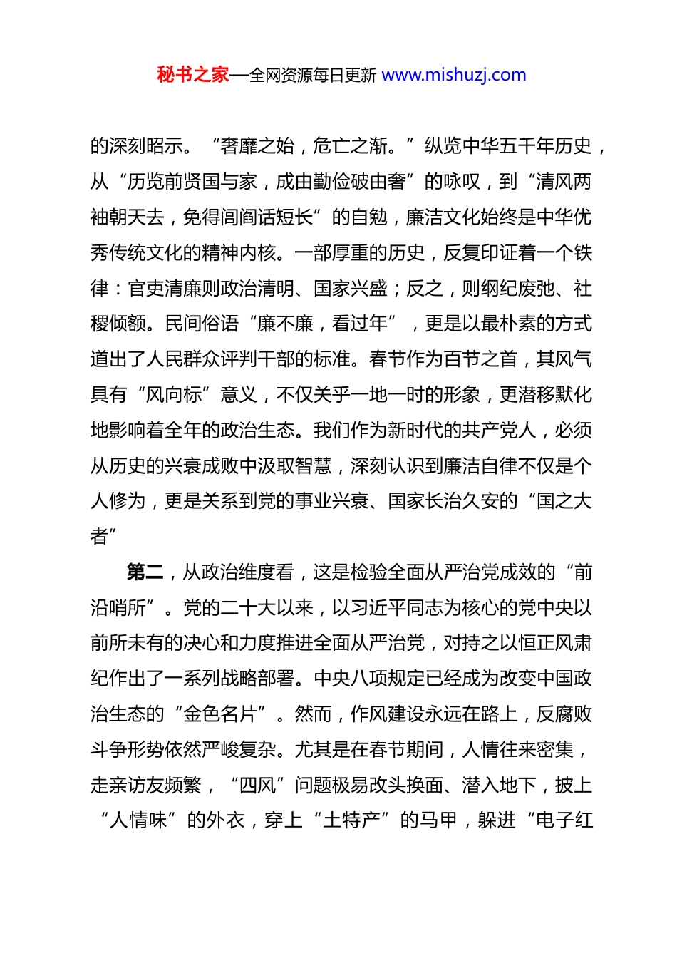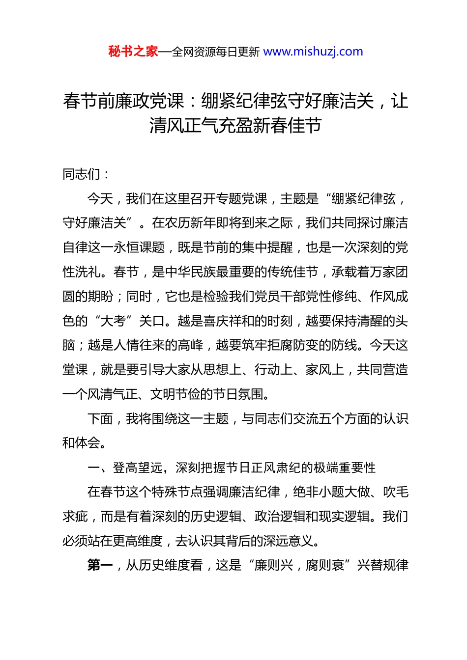 秘书之家—全网资源每日更新 www.mishuzj.com春节前廉政党课:绷紧纪律弦守好廉洁关,让清风正气充盈新春佳节 同志们:今天,我们在这里召开专题党课,主题是“绷紧纪律弦,守好廉洁关”。在农历新年即将到来之际,我们共同探讨廉洁自律这一永恒课题,既是节前的集中提醒,也是一次深刻的党性洗礼。春节,是中华民族最重要的传统佳节,承载着万家团圆的期盼;同时,它也是检验我们党员干部党性修纯、作风成色的“大考”关口。越是喜庆祥和的时刻,越要保持清醒的头脑;越是人情往来的高峰,越要筑牢拒腐防变的防线。今天这堂课,就是要引导大家从思想上、行动上、家风上,共同营造一个风清气正、文明节俭的节日氛围。下面,我将围绕这一主题,与同志们交流五个方面的认识和体会。一、登高望远,深刻把握节日正风肃纪的极端重要性在春节这个特殊节点强调廉洁纪律,绝非小题大做、吹毛求疵,而是有着深刻的历史逻辑、政治逻辑和现实逻辑。我们必须站在更高维度,去认识其背后的深远意义。第一,从历史维度看,这是“廉则兴,腐则衰”兴替规律秘书之家—全网资源每日更新 www.mishuzj.com的深刻昭示。“奢靡之始,危亡之渐。”纵览中华五千年历史,从“历览前贤国与家,成由勤俭破由奢”的咏叹,到“清风两袖朝天去,免得闾阎话短长”的自勉,廉洁文化始终是中华优秀传统文化的精神内核。一部厚重的历史,反复印证着一个铁律:官吏清廉则政治清明、国家兴盛;反之,则纲纪废弛、社稷倾额。民间俗语“廉不廉,看过年”,更是以最朴素的方式道出了人民群众评判干部的标准。春节作为百节之首,其风气具有“风向标”意义,不仅关乎一地一时的形象,更潜移默化地影响着全年的政治生态。我们作为新时代的共产党人,必须从历史的兴衰成败中汲取智慧,深刻认识到廉洁自律不仅是个人修为,更是关系到党的事业兴衰、国家长治久安的“国之大者”第二,从政治维度看,这是检验全面从严治党成效的“前沿哨所”。党的二十大以来,以习近平同志为核心的党中央以前所未有的决心和力度推进全面从严治党,对持之以恒正风肃纪作出了一系列战略部署。中央八项规定已经成为改变中国政治生态的“金色名片”。然而,作风建设永远在路上,反腐败斗争形势依然严峻复杂。尤其是在春节期间,人情往来密集,走亲访友频繁,“四风”问题极易改头换面、潜入地下,披上“人情味”的外衣,穿上“土特产”的马甲,躲进“电子红秘书之家—全网资源每日更新 www.mishuzj.com包”的青纱帐。能否有效防范和纠治这些隐形变异问题,是对我们政治判断力、政治领悟力、政治执行力的直接检验,是检验党纪学习教育成果是否入脑入心的重要标尺,更是衡量我们是否忠诚拥护“两个确立”、坚决做到“两个维护”的试金石。抓好春节期间的作风建设,就是以实际行动巩固全面从严治党的伟大成果。第三,从现实维度看,这是保护干部、关爱家庭的“暖心工程”。“堤溃蚁穴,气泄针芒。”大量的案例警示我们,许多领导干部的堕落轨迹,都是从节日期间收受一份“薄礼”、参加一次“盛情”的宴请开始的。起初可能只是觉得“盛情难却”“礼尚往来”,但一步步在温水煮青蛙式的“围猎”中放松了警惕、迷失了方向,最终滑向了违纪违法的深渊,落得个身败名裂、家庭破碎的悲惨下场。一个红包、一瓶名酒、一张购物卡,看似微小,却可能成为打开腐败“潘多拉魔盒”的钥匙。因此,节前的廉洁教育,既是组织的严格要求,更是对干部最真诚的关心和最实在的爱护。这既是对党的事业高度负责,也是对每一位同志及其家庭的最大负责。只有守住廉洁的底线,我们才能心安理得地与家人共享天伦之乐,才能确保大家过一个真正“安乐、祥和”的春节。二、见微知著,清醒洞察节日期间“四风”问题的新动向秘书之家—全网资源每日更新 www.mishuzj.com经过持续高压整治,“四风”问题明目张胆搞的少了,但树倒根存,一些问题由明转暗、花样翻新,呈现出更强的隐蔽性和迷惑性。我们必须擦亮眼睛,保持高度警惕。一是“礼尚往来”在包装上更加隐蔽。过去那种直接送现金、送购物卡的方式越来越少,取而代之的是更加“精致”和“体面”的手段。有的通过快递物流“隔空...