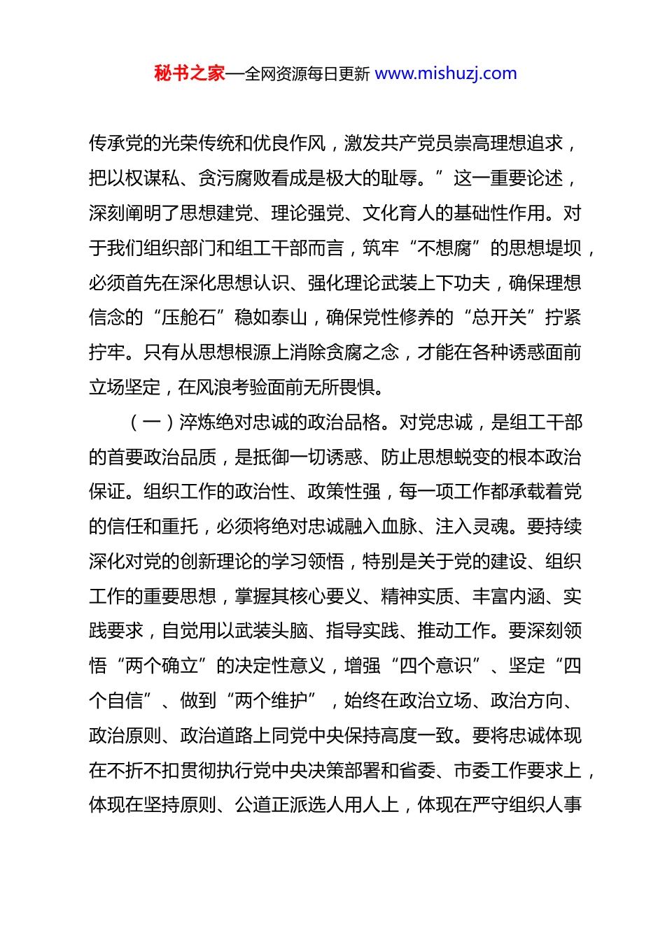 秘书之家—全网资源每日更新 www.mishuzj.com春节前廉政党课:以“赶考”的清醒坚定,走好组织工作新征程 同志们:在 2026 年春节即将来临之际,我们召开部机关廉政警示教育大会,既是贯彻落实二十届中央纪委五次全会精神、纵深推进全面从严治党的必然要求,也是深化部机关党风廉政建设、锻造模范部门和过硬队伍的关键举措。节点就是“考点”,年关也是“廉关”。春节前后人情往来密集,“四风”问题易发高发,是对党员干部党性和作风的重要检验。组织部门是管党治党的重要职能部门,组工干部是管干部的干部、管党员的党员,必须在廉洁自律上标准更高、要求更严、走在前列。今天这次党课,主要目的是通过深化学习教育、剖析典型案例、明晰实践要求、健全长效机制,教育引导全体同志始终保持“赶考”的清醒,筑牢拒腐防变的思想防线和行为底线,以风清气正的政治生态迎接新春佳节,以忠诚干净担当的实际行动推动全市组织工作高质量发展。一、深化思想认识,筑牢“不想腐”的根基堤坝习近平总书记在二十届中央纪委五次全会上深刻指出,“要加强新时代廉洁文化建设,深入开展党性党风党纪教育,秘书之家—全网资源每日更新 www.mishuzj.com传承党的光荣传统和优良作风,激发共产党员崇高理想追求,把以权谋私、贪污腐败看成是极大的耻辱。”这一重要论述,深刻阐明了思想建党、理论强党、文化育人的基础性作用。对于我们组织部门和组工干部而言,筑牢“不想腐”的思想堤坝,必须首先在深化思想认识、强化理论武装上下功夫,确保理想信念的“压舱石”稳如泰山,确保党性修养的“总开关”拧紧拧牢。只有从思想根源上消除贪腐之念,才能在各种诱惑面前立场坚定,在风浪考验面前无所畏惧。(一)淬炼绝对忠诚的政治品格。对党忠诚,是组工干部的首要政治品质,是抵御一切诱惑、防止思想蜕变的根本政治保证。组织工作的政治性、政策性强,每一项工作都承载着党的信任和重托,必须将绝对忠诚融入血脉、注入灵魂。要持续深化对党的创新理论的学习领悟,特别是关于党的建设、组织工作的重要思想,掌握其核心要义、精神实质、丰富内涵、实践要求,自觉用以武装头脑、指导实践、推动工作。要深刻领悟“两个确立”的决定性意义,增强“四个意识”、坚定“四个自信”、做到“两个维护”,始终在政治立场、政治方向、政治原则、政治道路上同党中央保持高度一致。要将忠诚体现在不折不扣贯彻执行党中央决策部署和省委、市委工作要求上,体现在坚持原则、公道正派选人用人上,体现在严守组织人事秘书之家—全网资源每日更新 www.mishuzj.com纪律、保守组织秘密上,确保组织工作的每一项决策、每一个环节、每一步程序都经得起历史、实践和人民的检验。要旗帜鲜明反对和抵制各种错误思潮,在大是大非面前敢于亮剑,在歪风邪气面前敢于斗争,永葆共产党人的政治本色,使对党忠诚成为组工干部最鲜明的身份标识和行动自觉。(二)树牢遵规守纪的底线思维。纪律是党的生命线,是管党治党的“戒尺”,也是党员干部约束自身行为的基本遵循。习近平总书记反复强调,“要加强纪律教育,使铁的纪律转化为党员、干部的日常习惯和自觉遵循。”组织部门是执行党的纪律的重要部门,组工干部更应成为学纪、知纪、明纪、守纪的表率。要深入学习新修订的《中国共产党纪律处分条例》等党内法规,原原本本学、联系实际学,搞清楚党的纪律规矩是什么,弄明白能干什么、不能干什么,把遵规守纪刻印在心,内化为言行准则。要强化组织观念,严格执行民主集中制、请示报告制度,自觉接受组织安排和纪律约束。要严守组织人事纪律,在干部选拔任用、人才引进、党员发展等工作中,坚持原则、按章办事,坚决防止跑风漏气、说情打招呼、搞亲亲疏疏。要绷紧廉洁自律这根弦,知敬畏、存戒惧、守底线,习惯在受监督和约束的环境中工作生活,做到心有所畏、言有所戒、行有所止,使党的纪律真正成为带电的“高压线”和护身的秘书之家—全网资源每日更新 www.mishuzj.com“金钟罩”。(三)涵养克己奉公的价值追求。公道正派是组织工作的生命线,甘为人梯是组工干部的优良传统。这背后体现的是共产党人克己奉公、无私奉献的崇高价值...