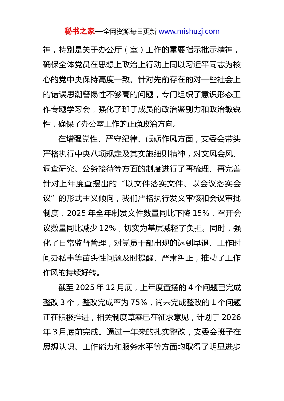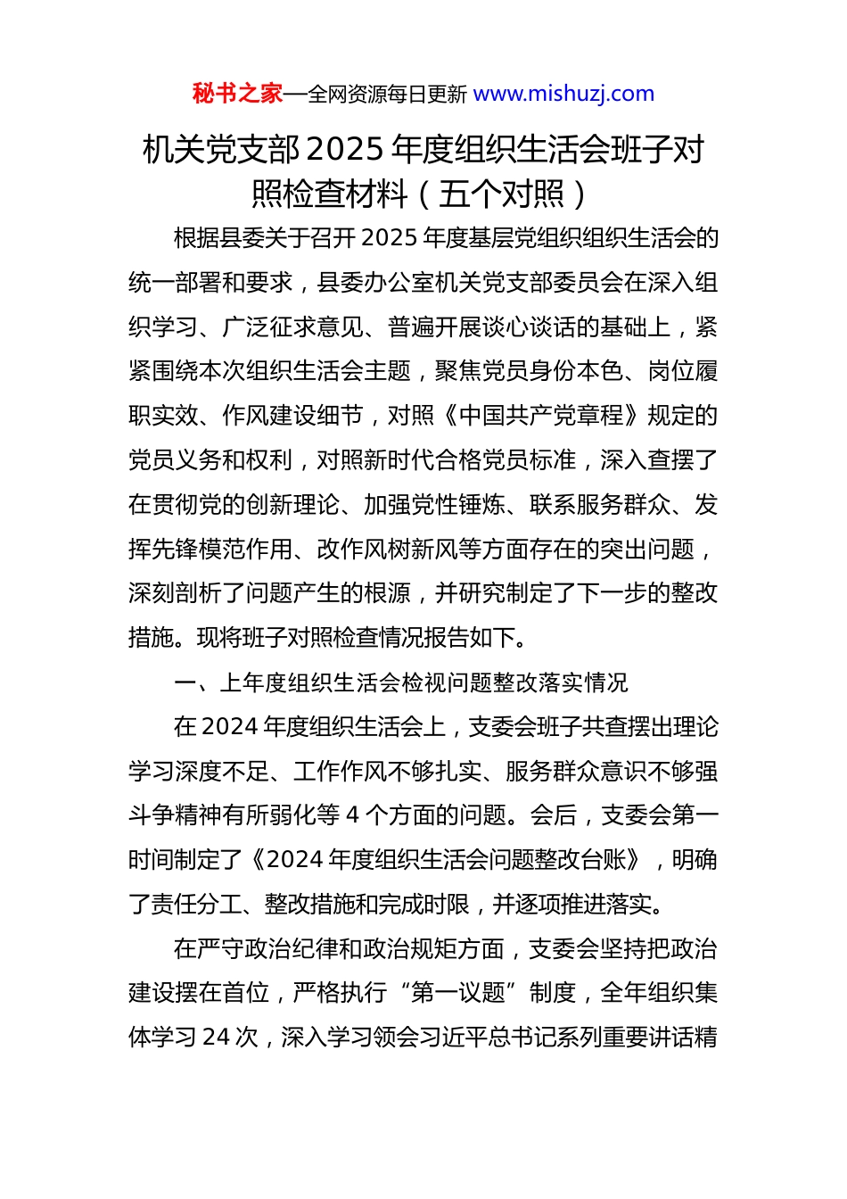 秘书之家—全网资源每日更新 www.mishuzj.com机关党支部 2025 年度组织生活会班子对照检查材料(五个对照)根据县委关于召开 2025 年度基层党组织组织生活会的统一部署和要求,县委办公室机关党支部委员会在深入组织学习、广泛征求意见、普遍开展谈心谈话的基础上,紧紧围绕本次组织生活会主题,聚焦党员身份本色、岗位履职实效、作风建设细节,对照《中国共产党章程》规定的党员义务和权利,对照新时代合格党员标准,深入查摆了在贯彻党的创新理论、加强党性锤炼、联系服务群众、发挥先锋模范作用、改作风树新风等方面存在的突出问题,深刻剖析了问题产生的根源,并研究制定了下一步的整改措施。现将班子对照检查情况报告如下。一、上年度组织生活会检视问题整改落实情况在 2024 年度组织生活会上,支委会班子共查摆出理论学习深度不足、工作作风不够扎实、服务群众意识不够强斗争精神有所弱化等 4 个方面的问题。会后,支委会第一时间制定了《2024 年度组织生活会问题整改台账》,明确了责任分工、整改措施和完成时限,并逐项推进落实。在严守政治纪律和政治规矩方面,支委会坚持把政治建设摆在首位,严格执行“第一议题”制度,全年组织集体学习 24 次,深入学习领会习近平总书记系列重要讲话精秘书之家—全网资源每日更新 www.mishuzj.com神,特别是关于办公厅(室)工作的重要指示批示精神,确保全体党员在思想上政治上行动上同以习近平同志为核心的党中央保持高度一致。针对先前存在的对一些社会上的错误思潮警惕性不够高的问题,专门组织了意识形态工作专题学习会,强化了班子成员的政治鉴别力和政治敏锐性,确保了办公室工作的正确政治方向。在增强党性、严守纪律、砥砺作风方面,支委会带头严格执行中央八项规定及其实施细则精神,对文风会风、调查研究、公务接待等方面的制度进行了再梳理、再完善针对上年度查摆出的“以文件落实文件、以会议落实会议”的形式主义倾向,我们严格执行发文审核和会议审批制度,2025 年全年制发文件数量同比下降 15%,召开会议数量同比减少 12%,切实为基层减轻了负担。同时,强化了日常监督管理,对党员干部出现的迟到早退、工作时间办私事等苗头性问题及时提醒、严肃纠正,推动了工作作风的持续好转。截至 2025 年 12 月底,上年度查摆的 4 个问题已完成整改 3 个,整改完成率为 75%,尚未完成整改的 1 个问题正在积极推进,相关制度草案已在征求意见,计划于 2026年 3 月底前完成。通过一年来的扎实整改,支委会班子在思想认识、工作能力和服务水平等方面均取得了明显进步秘书之家—全网资源每日更新 www.mishuzj.com但仍需在今后的工作中持续巩固整改成果,以钉钉子精神推动各项工作要求落地见效。二、存在的主要问题支委会坚持问题导向,聚焦党员本位,从具体务实的角度深入查摆,发现主要存在以下五个方面的问题。(一)在学懂弄通做实、贯彻党的创新理论方面一是理论学习的“深度”有待拓展。在学习贯彻党的二十大及二十届四中全会精神等党的创新理论过程中,班子成员虽然能够做到及时跟进学习,但系统性、研究性学习还不够。有时满足于通读文件、记录要点,对理论背后的历史逻辑、理论逻辑和实践逻辑钻研得不够透彻,导致在理解把握一些新思想、新论断时,仅停留在“知其然”的层面,离“知其所以然”还有差距。比如,在组织学习关于发展新质生产力的论述时,对如何结合我县产业基础和发展实际提出具体可行的参谋建议,思考谋划得不够深入。二是知行合一的“精度”有待提升。将理论学习成果转化为推动办公室“三服务”工作高质量发展的实际成效还不够明显。虽然时常强调要用党的创新理论指导实践,但在具体工作中,有时还是习惯于凭经验、老办法办事,运用新理论分析新情况、解决新问题的能力有待加强。去秘书之家—全网资源每日更新 www.mishuzj.com年在推进机关数字化转型工作中,虽然学习了大量关于数字政府建设的理论知识,但在具体推动公文流转系统升级优化“督查在线”平台功能时,未能充分运用系统思维进行顶层设计,导致部分功能模块与实际工作流程匹配度不高,影响了使用效率。三是检视反...