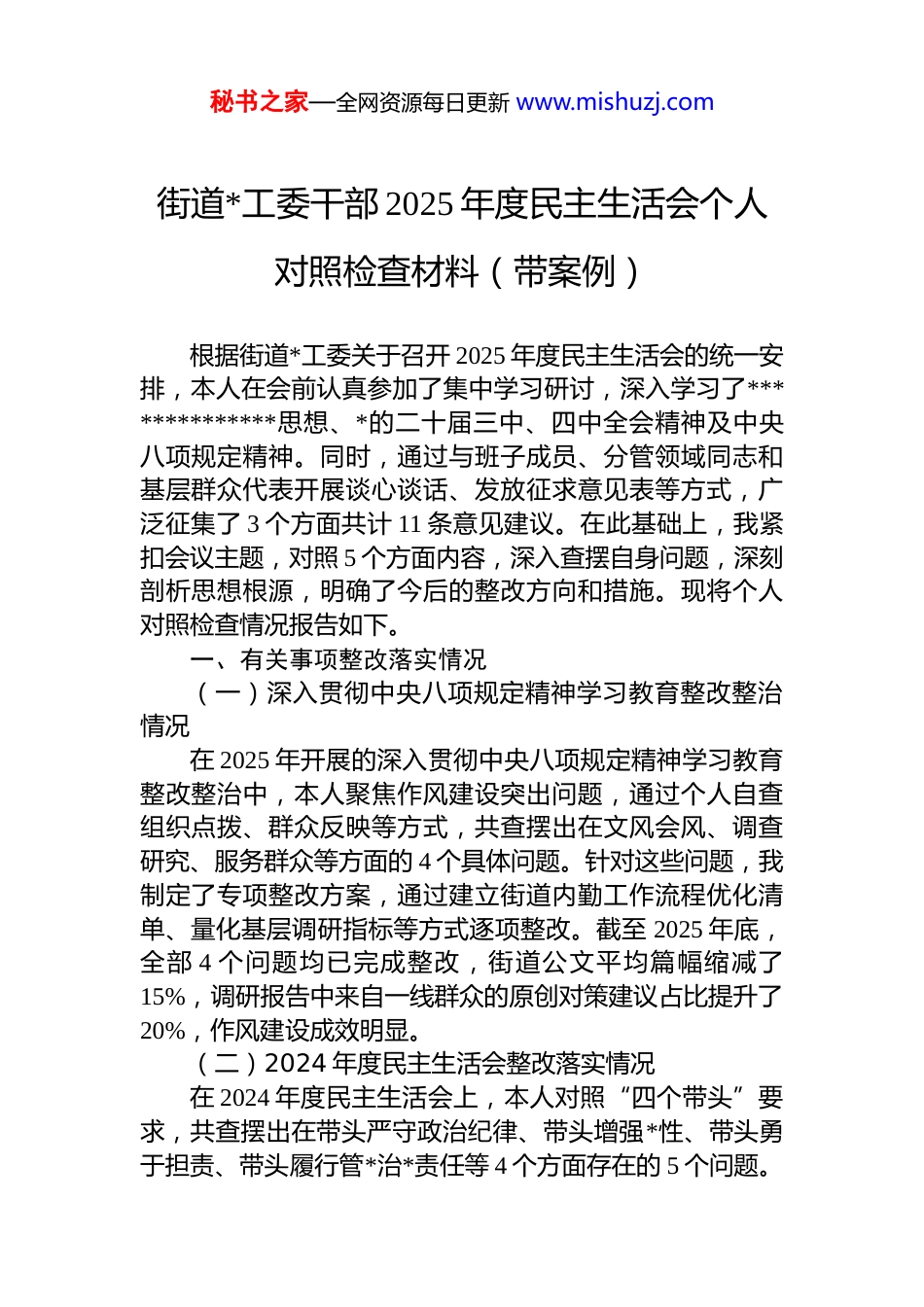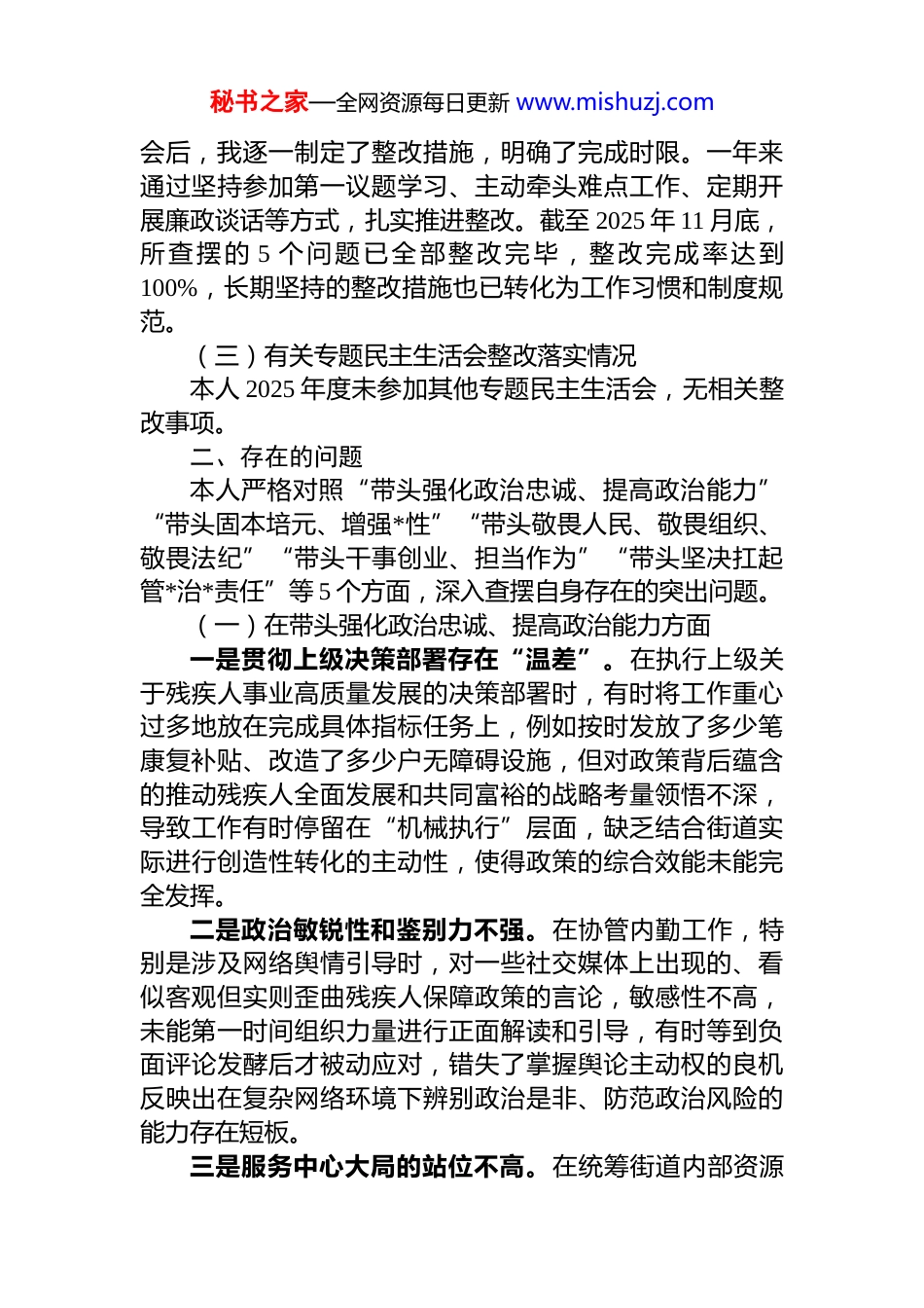 秘书之家—全网资源每日更新 www.mishuzj.com街道*工委干部 2025 年度民主生活会个人对照检查材料(带案例)根据街道*工委关于召开 2025 年度民主生活会的统一安排,本人在会前认真参加了集中学习研讨,深入学习了**************思想、*的二十届三中、四中全会精神及中央八项规定精神。同时,通过与班子成员、分管领域同志和基层群众代表开展谈心谈话、发放征求意见表等方式,广泛征集了 3 个方面共计 11 条意见建议。在此基础上,我紧扣会议主题,对照 5 个方面内容,深入查摆自身问题,深刻剖析思想根源,明确了今后的整改方向和措施。现将个人对照检查情况报告如下。一、有关事项整改落实情况(一)深入贯彻中央八项规定精神学习教育整改整治情况在 2025 年开展的深入贯彻中央八项规定精神学习教育整改整治中,本人聚焦作风建设突出问题,通过个人自查组织点拨、群众反映等方式,共查摆出在文风会风、调查研究、服务群众等方面的 4 个具体问题。针对这些问题,我制定了专项整改方案,通过建立街道内勤工作流程优化清单、量化基层调研指标等方式逐项整改。截至 2025 年底,全部 4 个问题均已完成整改,街道公文平均篇幅缩减了15%,调研报告中来自一线群众的原创对策建议占比提升了20%,作风建设成效明显。(二)2024 年度民主生活会整改落实情况在 2024 年度民主生活会上,本人对照“四个带头”要求,共查摆出在带头严守政治纪律、带头增强*性、带头勇于担责、带头履行管*治*责任等 4 个方面存在的 5 个问题。秘书之家—全网资源每日更新 www.mishuzj.com会后,我逐一制定了整改措施,明确了完成时限。一年来通过坚持参加第一议题学习、主动牵头难点工作、定期开展廉政谈话等方式,扎实推进整改。截至 2025 年 11 月底,所查摆的 5 个问题已全部整改完毕,整改完成率达到100%,长期坚持的整改措施也已转化为工作习惯和制度规范。(三)有关专题民主生活会整改落实情况本人 2025 年度未参加其他专题民主生活会,无相关整改事项。二、存在的问题本人严格对照“带头强化政治忠诚、提高政治能力”“带头固本培元、增强*性”“带头敬畏人民、敬畏组织、敬畏法纪”“带头干事创业、担当作为”“带头坚决扛起管*治*责任”等 5 个方面,深入查摆自身存在的突出问题。(一)在带头强化政治忠诚、提高政治能力方面一是贯彻上级决策部署存在“温差”。在执行上级关于残疾人事业高质量发展的决策部署时,有时将工作重心过多地放在完成具体指标任务上,例如按时发放了多少笔康复补贴、改造了多少户无障碍设施,但对政策背后蕴含的推动残疾人全面发展和共同富裕的战略考量领悟不深,导致工作有时停留在“机械执行”层面,缺乏结合街道实际进行创造性转化的主动性,使得政策的综合效能未能完全发挥。二是政治敏锐性和鉴别力不强。在协管内勤工作,特别是涉及网络舆情引导时,对一些社交媒体上出现的、看似客观但实则歪曲残疾人保障政策的言论,敏感性不高,未能第一时间组织力量进行正面解读和引导,有时等到负面评论发酵后才被动应对,错失了掌握舆论主动权的良机反映出在复杂网络环境下辨别政治是非、防范政治风险的能力存在短板。三是服务中心大局的站位不高。在统筹街道内部资源秘书之家—全网资源每日更新 www.mishuzj.com时,偶尔会陷入部门利益的局限。比如,在 2025 年第三季度的一次办公经费预算调整讨论中,我主要考虑的是如何平衡各科室的现有需求,确保内部运转稳定,而对是否应将更多机动财力向街道重点招商引资项目或优化营商环境等中心工作倾斜,思考不深、决心不大,未能完全做到把分管工作置于全街道高质量发展大局中去谋划和推动。(二)在带头固本培元、增强*性方面一是理论学习与实践转化不紧密。虽然能够坚持学习习近平***********思想,但运用其立场观点方法指导分管领域工作的能力不强。例如,在谋划残联工作时,对如何将“新质生产力”等新理念与残疾人就业培训相结合,探索如残疾人数据标注、电商直播助理等新业态思考不深,仍然主要依赖于传统的庇护性就业和手工艺培训模式,未能有效打开残疾人高质量就业的新路径。二是理想...