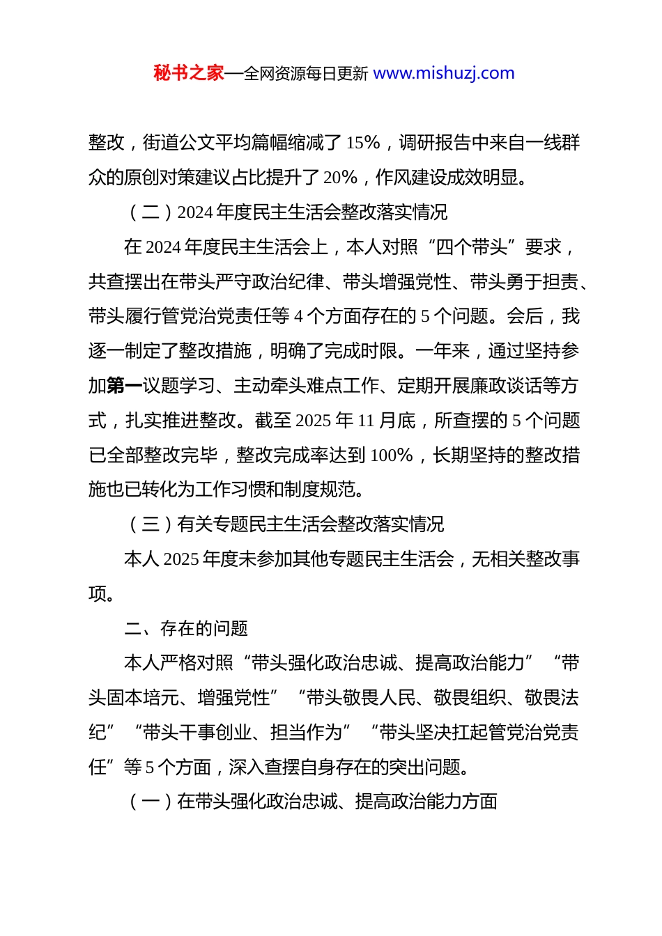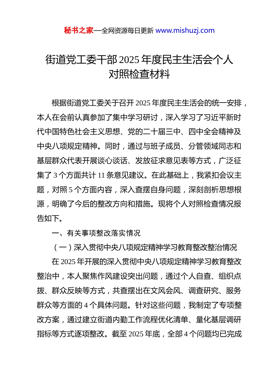 秘书之家—全网资源每日更新 www.mishuzj.com街道党工委干部 2025 年度民主生活会个人对照检查材料 根据街道党工委关于召开 2025 年度民主生活会的统一安排,本人在会前认真参加了集中学习研讨,深入学习了习近平新时代中国特色社会主义思想、党的二十届三中、四中全会精神及中央八项规定精神。同时,通过与班子成员、分管领域同志和基层群众代表开展谈心谈话、发放征求意见表等方式,广泛征集了 3 个方面共计 11 条意见建议。在此基础上,我紧扣会议主题,对照 5 个方面内容,深入查摆自身问题,深刻剖析思想根源,明确了今后的整改方向和措施。现将个人对照检查情况报告如下。一、有关事项整改落实情况(一)深入贯彻中央八项规定精神学习教育整改整治情况在 2025 年开展的深入贯彻中央八项规定精神学习教育整改整治中,本人聚焦作风建设突出问题,通过个人自查、组织点拨、群众反映等方式,共查摆出在文风会风、调查研究、服务群众等方面的 4 个具体问题。针对这些问题,我制定了专项整改方案,通过建立街道内勤工作流程优化清单、量化基层调研指标等方式逐项整改。截至 2025 年底,全部 4 个问题均已完成秘书之家—全网资源每日更新 www.mishuzj.com整改,街道公文平均篇幅缩减了 15%,调研报告中来自一线群众的原创对策建议占比提升了 20%,作风建设成效明显。(二)2024 年度民主生活会整改落实情况在 2024 年度民主生活会上,本人对照“四个带头”要求,共查摆出在带头严守政治纪律、带头增强党性、带头勇于担责、带头履行管党治党责任等 4 个方面存在的 5 个问题。会后,我逐一制定了整改措施,明确了完成时限。一年来,通过坚持参加第一议题学习、主动牵头难点工作、定期开展廉政谈话等方式,扎实推进整改。截至 2025 年 11 月底,所查摆的 5 个问题已全部整改完毕,整改完成率达到 100%,长期坚持的整改措施也已转化为工作习惯和制度规范。(三)有关专题民主生活会整改落实情况本人 2025 年度未参加其他专题民主生活会,无相关整改事项。二、存在的问题本人严格对照“带头强化政治忠诚、提高政治能力”“带头固本培元、增强党性”“带头敬畏人民、敬畏组织、敬畏法纪”“带头干事创业、担当作为”“带头坚决扛起管党治党责任”等 5 个方面,深入查摆自身存在的突出问题。(一)在带头强化政治忠诚、提高政治能力方面秘书之家—全网资源每日更新 www.mishuzj.com一是贯彻上级决策部署存在“温差”。在执行上级关于残疾人事业高质量发展的决策部署时,有时将工作重心过多地放在完成具体指标任务上,例如按时发放了多少笔康复补贴、改造了多少户无障碍设施,但对政策背后蕴含的推动残疾人全面发展和共同富裕的战略考量领悟不深,导致工作有时停留在“机械执行”层面,缺乏结合街道实际进行创造性转化的主动性,使得政策的综合效能未能完全发挥。二是政治敏锐性和鉴别力不强。在协管内勤工作,特别是涉及网络舆情引导时,对一些社交媒体上出现的、看似客观但实则歪曲残疾人保障政策的言论,敏感性不高,未能第一时间组织力量进行正面解读和引导,有时等到负面评论发酵后才被动应对,错失了掌握舆论主动权的良机,反映出在复杂网络环境下辨别政治是非、防范政治风险的能力存在短板。三是服务中心大局的站位不高。在统筹街道内部资源时,偶尔会陷入部门利益的局限。比如,在 2025 年第三季度的一次办公经费预算调整讨论中,我主要考虑的是如何平衡各科室的现有需求,确保内部运转稳定,而对是否应将更多机动财力向街道重点招商引资项目或优化营商环境等中心工作倾斜,思考不深、决心不大,未能完全做到把分管工作置于全街道高质量发展大局中去谋划和推动。秘书之家—全网资源每日更新 www.mishuzj.com(二)在带头固本培元、增强党性方面一是理论学习与实践转化不紧密。虽然能够坚持学习习近平新时代中国特色社会主义思想,但运用其立场观点方法指导分管领域工作的能力不强。例如,在谋划残联工作时,对如何将“新质生产力”等新理念与残疾人就业培训相结合,探索如残疾人数据标注、电商直播助理等新业态思考不深,仍然主要依赖...