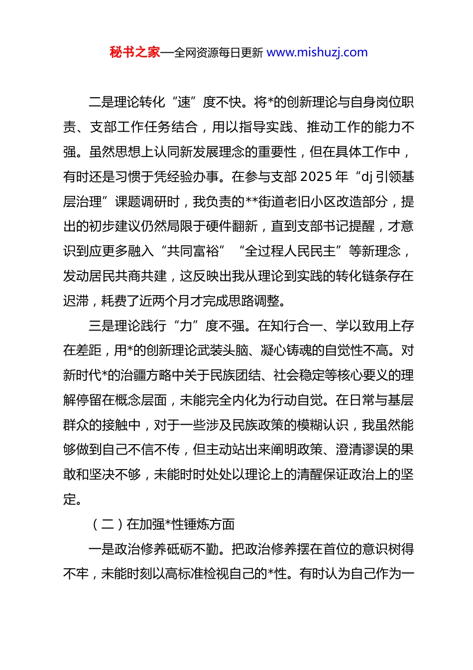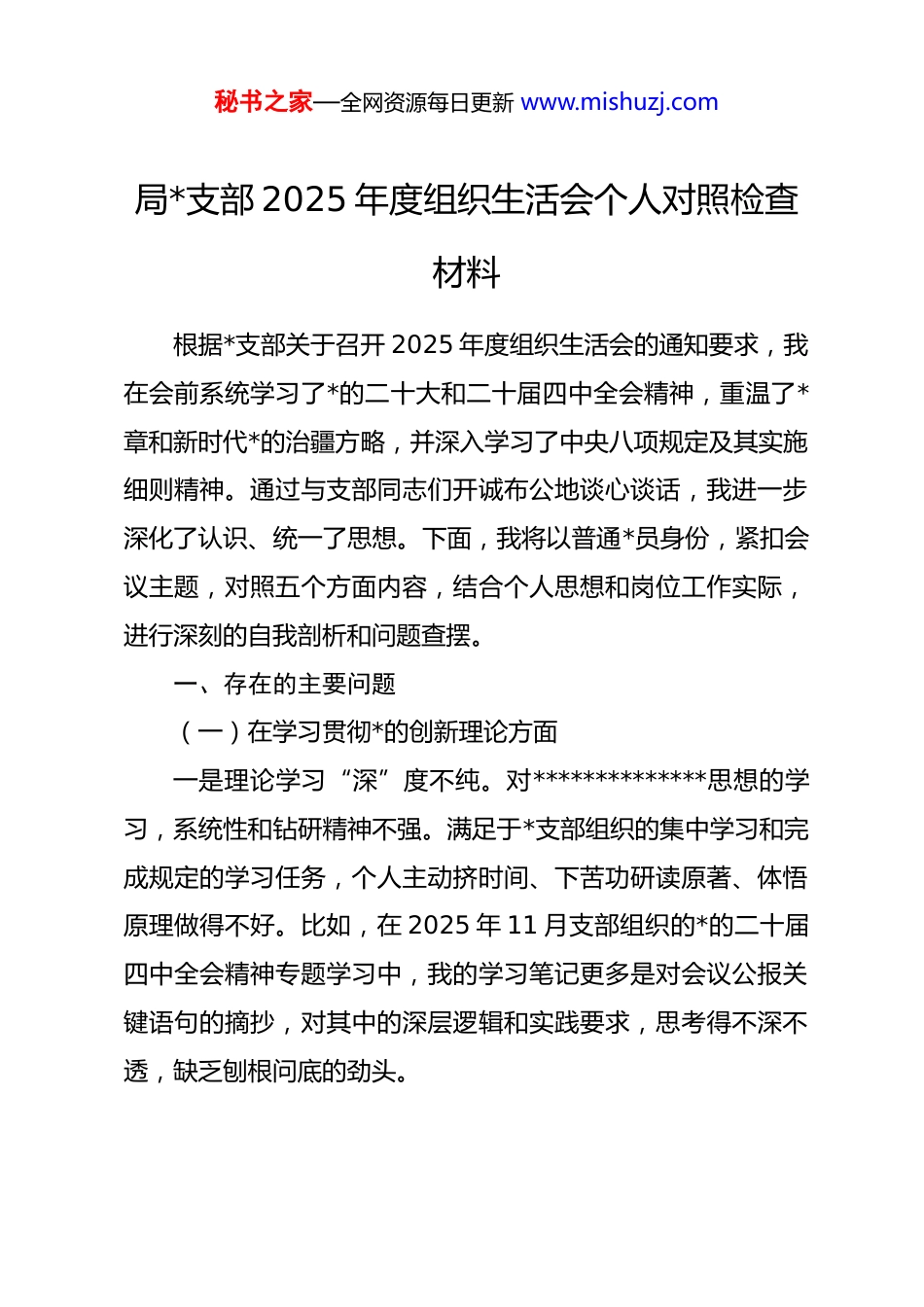 秘书之家—全网资源每日更新 www.mishuzj.com局*支部 2025 年度组织生活会个人对照检查材料根据*支部关于召开 2025 年度组织生活会的通知要求,我在会前系统学习了*的二十大和二十届四中全会精神,重温了*章和新时代*的治疆方略,并深入学习了中央八项规定及其实施细则精神。通过与支部同志们开诚布公地谈心谈话,我进一步深化了认识、统一了思想。下面,我将以普通*员身份,紧扣会议主题,对照五个方面内容,结合个人思想和岗位工作实际,进行深刻的自我剖析和问题查摆。一、存在的主要问题(一)在学习贯彻*的创新理论方面一是理论学习“深”度不纯。对**************思想的学习,系统性和钻研精神不强。满足于*支部组织的集中学习和完成规定的学习任务,个人主动挤时间、下苦功研读原著、体悟原理做得不好。比如,在 2025 年 11 月支部组织的*的二十届四中全会精神专题学习中,我的学习笔记更多是对会议公报关键语句的摘抄,对其中的深层逻辑和实践要求,思考得不深不透,缺乏刨根问底的劲头。秘书之家—全网资源每日更新 www.mishuzj.com二是理论转化“速”度不快。将*的创新理论与自身岗位职责、支部工作任务结合,用以指导实践、推动工作的能力不强。虽然思想上认同新发展理念的重要性,但在具体工作中,有时还是习惯于凭经验办事。在参与支部 2025 年“dj 引领基层治理”课题调研时,我负责的**街道老旧小区改造部分,提出的初步建议仍然局限于硬件翻新,直到支部书记提醒,才意识到应更多融入“共同富裕”“全过程人民民主”等新理念,发动居民共商共建,这反映出我从理论到实践的转化链条存在迟滞,耗费了近两个月才完成思路调整。三是理论践行“力”度不强。在知行合一、学以致用上存在差距,用*的创新理论武装头脑、凝心铸魂的自觉性不高。对新时代*的治疆方略中关于民族团结、社会稳定等核心要义的理解停留在概念层面,未能完全内化为行动自觉。在日常与基层群众的接触中,对于一些涉及民族政策的模糊认识,我虽然能够做到自己不信不传,但主动站出来阐明政策、澄清谬误的果敢和坚决不够,未能时时处处以理论上的清醒保证政治上的坚定。(二)在加强*性锤炼方面一是政治修养砥砺不勤。把政治修养摆在首位的意识树得不牢,未能时刻以高标准检视自己的*性。有时认为自己作为一秘书之家—全网资源每日更新 www.mishuzj.com名受*教育多年的干部,政治上是可靠的,从而在思想深处放松了对*性“再锤炼、再提升”的警惕。2025 年四个季度的*员思想汇报,有两次都是临近截止日期才匆忙完成,内容上反思具体工作多,触及灵魂深处的*性分析少,把一项严肃的政治任务当作了“常规作业”,反映出自我革命精神的弱化。二是纪律规矩约束不紧。对*章*规 dj 的学习不够刻印于心,在小事小节上对自己的要求有所放松,未能将纪律规矩完全融入日常言行。在一次与朋友的非正式聚会中,面对有人对当前经济形势发表的一些悲观甚至错误的言论,我碍于情面,仅仅是简单地转开话题,而没有旗帜鲜明地予以批驳和引导,丧失了一名*员应有的斗争精神。这暴露出我在大是大非问题上立场虽定,但在日常“微环境”中捍卫*的声誉、维护正确舆论导向的政治敏锐性和行动自觉性不强。三是理想信念扎根不牢。对“总开关”问题的审视和改造不够经常,共产主义远大理想和中国特色社会主义共同理想的信念基础需要持续加固。面对社会上一些诸如“精致利己主义”等错误思潮,虽然能保持警惕,但对其现实危害和思想根源的斗争和批判不彻底。例如,在与年轻同志交流时,对他们的一些个人发展优先于集体奉献的想法,我更多的是表示理解,而进行理想信念教育、引导其树立正确价值观的力度和效秘书之家—全网资源每日更新 www.mishuzj.com果不好,未能真正做到春风化雨、润物无声。(三)在联系服务群众方面一是为民情怀厚植不足。虽然始终牢记为人民服务的宗旨,但在情感上与群众的距离不够近,未能真正做到想群众之所想、急群众之所急。2025 年,我参与了支部组织的“双报到”进社区活动,在**社区“我为群众办实事”实践中,我领办的“小区绿化带补植”项目虽然完成了任务,但这是支部安排的“规...