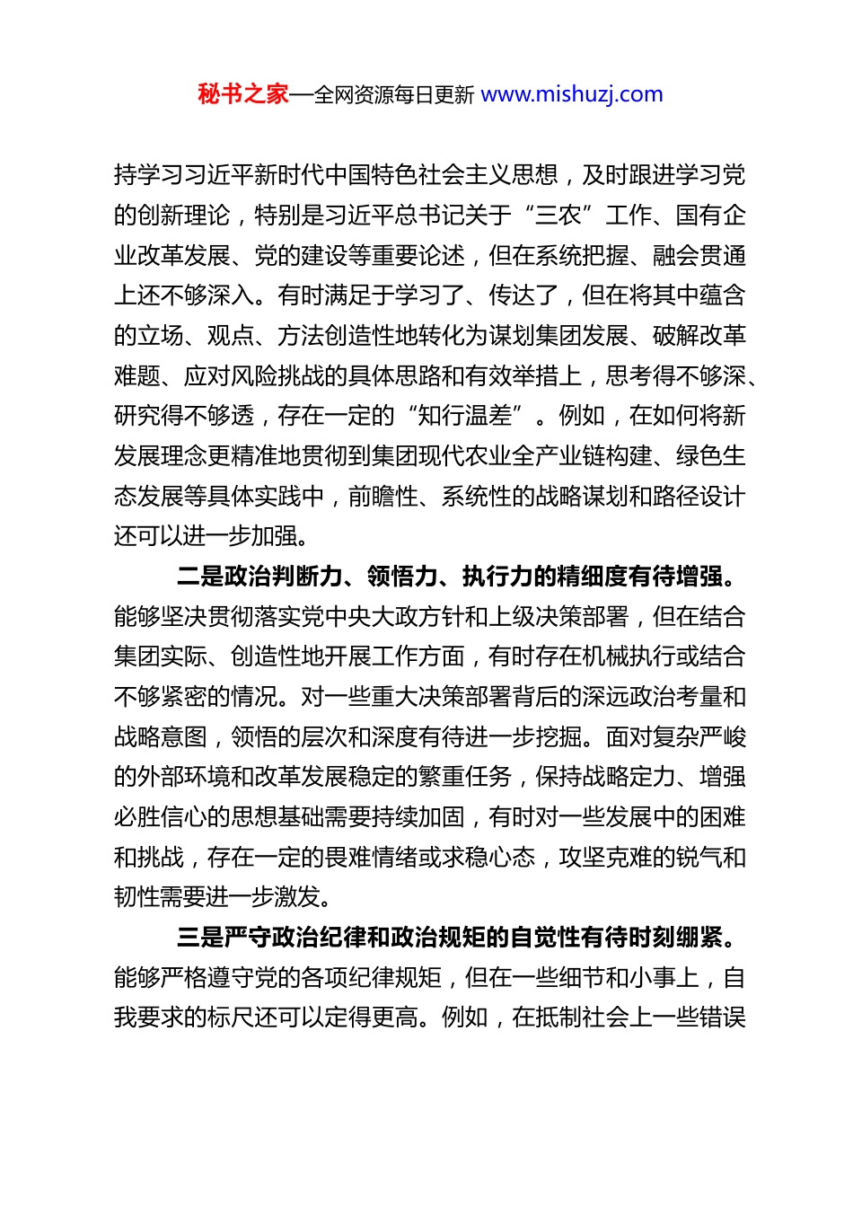秘书之家—全网资源每日更新 www.mishuzj.comXX 农发集团党委书记 2025 年度民主生活会对照检查材料根据上级党委关于开好 2025 年度民主生活会的统一部署和要求,本人紧扣会议主题,在深入开展学习研讨、广泛征求意见建议、坦诚进行谈心谈话的基础上,严格按照本次民主生活会明确的对照检查重点内容,特别是聚焦“带头强化政治忠诚、提高政治能力”“带头固本培元、增强党性”“带头敬畏人民、敬畏组织、敬畏法纪”“带头干事创业、担当作为”“带头坚决扛起管党治党责任”等五个方面,结合党的二十届四中全会精神的学习贯彻和中央八项规定精神及其细则的深化落实,紧密联系个人思想、学习和工作实际,深入查摆自身存在的问题,深刻剖析问题产生的根源,并明确了今后的努力方向和整改措施。现将对照检查情况报告如下:一、存在的主要问题(一)在带头强化政治忠诚、提高政治能力方面总体来看,本人能够自觉在思想上政治上行动上同以习近平同志为核心的党中央保持高度一致,深刻领悟“两个确立”的决定性意义,不断增强“四个意识”、坚定“四个自信”、做到“两个维护”。但对照更高标准、更严要求,仍存在一些差距和不足:一是理论武装的深度和转化效率有待提升。虽然能够坚秘书之家—全网资源每日更新 www.mishuzj.com持学习习近平新时代中国特色社会主义思想,及时跟进学习党的创新理论,特别是习近平总书记关于“三农”工作、国有企业改革发展、党的建设等重要论述,但在系统把握、融会贯通上还不够深入。有时满足于学习了、传达了,但在将其中蕴含的立场、观点、方法创造性地转化为谋划集团发展、破解改革难题、应对风险挑战的具体思路和有效举措上,思考得不够深、研究得不够透,存在一定的“知行温差”。例如,在如何将新发展理念更精准地贯彻到集团现代农业全产业链构建、绿色生态发展等具体实践中,前瞻性、系统性的战略谋划和路径设计还可以进一步加强。二是政治判断力、领悟力、执行力的精细度有待增强。能够坚决贯彻落实党中央大政方针和上级决策部署,但在结合集团实际、创造性地开展工作方面,有时存在机械执行或结合不够紧密的情况。对一些重大决策部署背后的深远政治考量和战略意图,领悟的层次和深度有待进一步挖掘。面对复杂严峻的外部环境和改革发展稳定的繁重任务,保持战略定力、增强必胜信心的思想基础需要持续加固,有时对一些发展中的困难和挑战,存在一定的畏难情绪或求稳心态,攻坚克难的锐气和韧性需要进一步激发。三是严守政治纪律和政治规矩的自觉性有待时刻绷紧。能够严格遵守党的各项纪律规矩,但在一些细节和小事上,自我要求的标尺还可以定得更高。例如,在抵制社会上一些错误秘书之家—全网资源每日更新 www.mishuzj.com思潮和言论方面,虽然能做到自身不信不传,但主动进行旗帜鲜明地批驳和引导还需要加强。在严格执行重大事项请示报告制度方面,有时对一些常规工作的报告程序重视程度不够,认为只要结果好、程序上可以简化,这反映出对政治规矩严肃性的认识还需深化。四是对标对表、校准偏差的主动性有待提高。对照党中央的最新精神和决策部署,及时审视和调整集团发展战略、工作重点的自觉性和敏锐性还有提升空间。在带领班子成员和全体干部职工始终同党中央保持高度一致上,压力传导和责任落实还不够层层到位,个别基层党组织和党员干部在政治能力建设上还存在薄弱环节,需要进一步强化日常教育、管理和监督。(二)在带头固本培元、增强党性方面始终将党性修养作为终身课题,注重用党的创新理论武装头脑,努力锤炼忠诚干净担当的政治品格。但深刻反思,在新时代新征程上,党性锻炼的标准永无止境:一是理论学习的系统性、常态化有差距。对习近平新时代中国特色社会主义思想的学习,有时存在碎片化现象,缺乏“挤”和“钻”的精神,系统性研读原著、领悟原理不够。学习与改造主观世界结合不够紧密,运用党的科学理论解决世界观、人生观、价值观这个“总开关”问题的自觉性、主动性有待增强。在如何将坚定的理想信念具体化为推动集团服务国家粮食安全战略、助力乡村振兴的强大动力和实际行动上,还需秘书之家—全网资源每日更新 www...