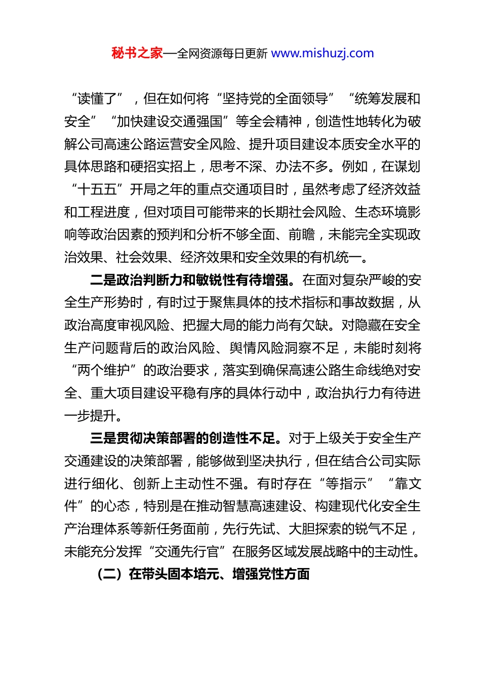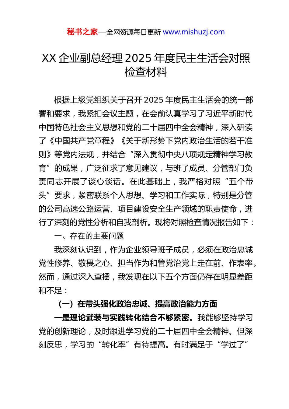 秘书之家—全网资源每日更新 www.mishuzj.comXX 企业副总经理 2025 年度民主生活会对照检查材料根据上级党组织关于召开 2025 年度民主生活会的统一部署和要求,我紧扣会议主题,在会前认真学习了习近平新时代中国特色社会主义思想和党的二十届四中全会精神,深入研读了《中国共产党章程》《关于新形势下党内政治生活的若干准则》等党内法规,并结合“深入贯彻中央八项规定精神学习教育”的成果,广泛征求了意见建议,与班子成员、分管部门负责同志开展了谈心谈话。在此基础上,我严格对照“五个带头”要求,紧密联系个人思想、学习和工作实际,特别是分管的公司高速公路运营、项目建设安全生产领域的职责使命,进行了深刻的党性分析和自我剖析。现将对照检查情况报告如下:一、存在的主要问题我深刻认识到,作为企业领导班子成员,必须在政治忠诚党性修养、敬畏之心、担当作为和管党治党上走在前、作表率。然而,通过深入查摆,我发现在以下五个方面仍存在明显差距和不足:(一)在带头强化政治忠诚、提高政治能力方面一是理论武装与实践转化结合不够紧密。我能够坚持学习党的创新理论,及时跟进学习党的二十届四中全会精神。但深刻反思,学习的“转化率”有待提高。有时满足于“学过了”秘书之家—全网资源每日更新 www.mishuzj.com“读懂了”,但在如何将“坚持党的全面领导”“统筹发展和安全”“加快建设交通强国”等全会精神,创造性地转化为破解公司高速公路运营安全风险、提升项目建设本质安全水平的具体思路和硬招实招上,思考不深、办法不多。例如,在谋划“十五五”开局之年的重点交通项目时,虽然考虑了经济效益和工程进度,但对项目可能带来的长期社会风险、生态环境影响等政治因素的预判和分析不够全面、前瞻,未能完全实现政治效果、社会效果、经济效果和安全效果的有机统一。二是政治判断力和敏锐性有待增强。在面对复杂严峻的安全生产形势时,有时过于聚焦具体的技术指标和事故数据,从政治高度审视风险、把握大局的能力尚有欠缺。对隐藏在安全生产问题背后的政治风险、舆情风险洞察不足,未能时刻将“两个维护”的政治要求,落实到确保高速公路生命线绝对安全、重大项目建设平稳有序的具体行动中,政治执行力有待进一步提升。三是贯彻决策部署的创造性不足。对于上级关于安全生产交通建设的决策部署,能够做到坚决执行,但在结合公司实际进行细化、创新上主动性不强。有时存在“等指示”“靠文件”的心态,特别是在推动智慧高速建设、构建现代化安全生产治理体系等新任务面前,先行先试、大胆探索的锐气不足,未能充分发挥“交通先行官”在服务区域发展战略中的主动性。(二)在带头固本培元、增强党性方面秘书之家—全网资源每日更新 www.mishuzj.com一是党性锤炼的日常自觉性有松懈。能够参加集体学习和组织生活,但在“八小时之外”的自我革命、自我净化上有所放松。面对社会上的一些错误思潮和不良风气,有时缺乏旗帜鲜明进行斗争的勇气。对党章党规党纪的学习,有时停留在通读层面,未能真正做到逐条逐句深学细悟、内化于心,用党性原则约束言行、抵御风险的“防火墙”筑得还不够牢固。二是党建工作与业务工作融合不够深入。虽然强调“党建+安全”,但在实际工作中,“两张皮”现象依然存在。例如,在组建项目党员突击队攻坚安全难题时,有时更注重形式上的成立,对于如何系统性地发挥党支部战斗堡垒作用,长效化解跨区域协调、复杂技术攻关等“硬骨头”问题,机制不够健全,党建引领安全生产的成效未能最大化显现。三是批评与自我批评武器运用不够有力。在民主生活会或组织生活会上,进行自我批评时,有时对客观困难分析多,对自身在安全决策、管理监督等方面的主观责任深挖不够;开展相互批评时,存在“和风细雨”、提工作建议多,“红脸出汗”、触及灵魂少的现象,斗争的锋芒有所钝化。(三)在带头敬畏人民、敬畏组织、敬畏法纪方面一是践行群众路线不够扎实。下基层调研有时“走马观花”多,“解剖麻雀”少。虽然也去项目工地、收费站、服务区,但真正“沉下去”与一线员工、司乘人员面对面交流,倾听他们关于安全隐患、管理漏洞的真实心声,并...