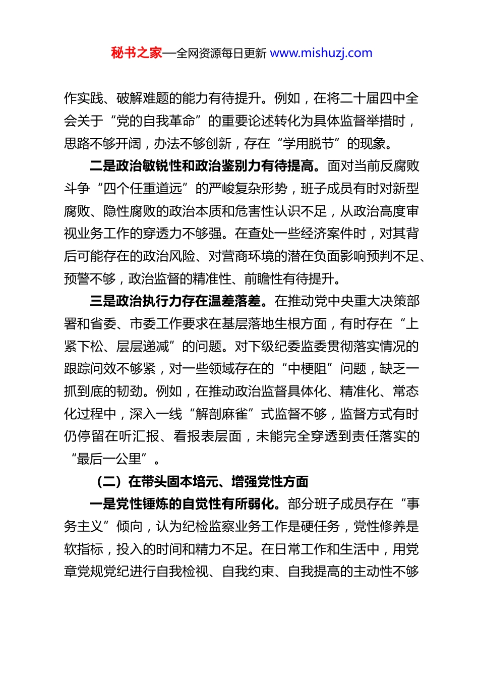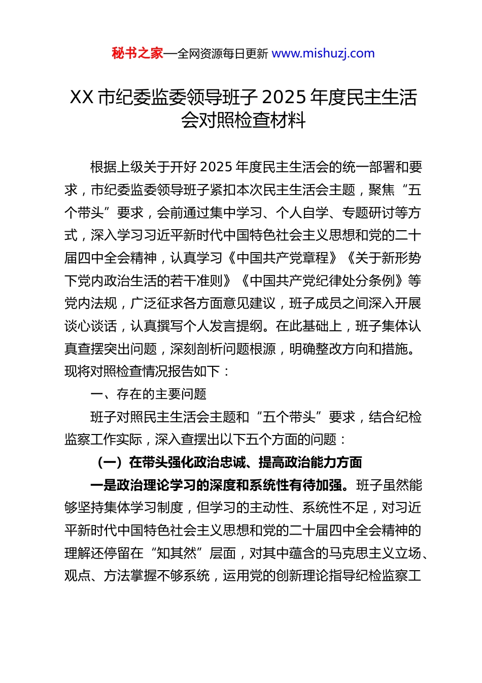秘书之家—全网资源每日更新 www.mishuzj.comXX 市纪委监委领导班子 2025 年度民主生活会对照检查材料根据上级关于开好 2025 年度民主生活会的统一部署和要求,市纪委监委领导班子紧扣本次民主生活会主题,聚焦“五个带头”要求,会前通过集中学习、个人自学、专题研讨等方式,深入学习习近平新时代中国特色社会主义思想和党的二十届四中全会精神,认真学习《中国共产党章程》《关于新形势下党内政治生活的若干准则》《中国共产党纪律处分条例》等党内法规,广泛征求各方面意见建议,班子成员之间深入开展谈心谈话,认真撰写个人发言提纲。在此基础上,班子集体认真查摆突出问题,深刻剖析问题根源,明确整改方向和措施。现将对照检查情况报告如下:一、存在的主要问题班子对照民主生活会主题和“五个带头”要求,结合纪检监察工作实际,深入查摆出以下五个方面的问题:(一)在带头强化政治忠诚、提高政治能力方面一是政治理论学习的深度和系统性有待加强。班子虽然能够坚持集体学习制度,但学习的主动性、系统性不足,对习近平新时代中国特色社会主义思想和党的二十届四中全会精神的理解还停留在“知其然”层面,对其中蕴含的马克思主义立场、观点、方法掌握不够系统,运用党的创新理论指导纪检监察工秘书之家—全网资源每日更新 www.mishuzj.com作实践、破解难题的能力有待提升。例如,在将二十届四中全会关于“党的自我革命”的重要论述转化为具体监督举措时,思路不够开阔,办法不够创新,存在“学用脱节”的现象。二是政治敏锐性和政治鉴别力有待提高。面对当前反腐败斗争“四个任重道远”的严峻复杂形势,班子成员有时对新型腐败、隐性腐败的政治本质和危害性认识不足,从政治高度审视业务工作的穿透力不够强。在查处一些经济案件时,对其背后可能存在的政治风险、对营商环境的潜在负面影响预判不足、预警不够,政治监督的精准性、前瞻性有待提升。三是政治执行力存在温差落差。在推动党中央重大决策部署和省委、市委工作要求在基层落地生根方面,有时存在“上紧下松、层层递减”的问题。对下级纪委监委贯彻落实情况的跟踪问效不够紧,对一些领域存在的“中梗阻”问题,缺乏一抓到底的韧劲。例如,在推动政治监督具体化、精准化、常态化过程中,深入一线“解剖麻雀”式监督不够,监督方式有时仍停留在听汇报、看报表层面,未能完全穿透到责任落实的“最后一公里”。(二)在带头固本培元、增强党性方面一是党性锤炼的自觉性有所弱化。部分班子成员存在“事务主义”倾向,认为纪检监察业务工作是硬任务,党性修养是软指标,投入的时间和精力不足。在日常工作和生活中,用党章党规党纪进行自我检视、自我约束、自我提高的主动性不够秘书之家—全网资源每日更新 www.mishuzj.com强,有时存在“自我感觉良好”的心态,缺乏刀刃向内的勇气和持续“吾日三省吾身”的自觉。二是党内政治生活的政治性、时代性、原则性、战斗性体现不够充分。班子虽然能按期召开民主生活会,但在开展批评和自我批评时,有时存在“好人主义”思想。自我批评“遮遮掩掩”,怕“揭短亮丑”;相互批评“隔靴搔痒”,多用“希望”“建议”代替批评,“辣味”不足,未能真正达到“红脸出汗、排毒治病”的效果,影响了党内政治生活的质量和严肃性。三是理想信念的内化转化不够到位。班子成员对共产主义远大理想和中国特色社会主义共同信念是坚定的,但在面对繁重的工作任务和尖锐复杂的矛盾时,有时会产生畏难情绪和疲惫心态,将崇高理想信念转化为攻坚克难的强大精神动力方面存在差距。在推进一些历史遗留问题线索核查或处理一些棘手信访件时,缺乏“钉钉子”精神和“不破楼兰终不还”的决心,斗争意志有待进一步磨砺。(三)在带头敬畏人民、敬畏组织、敬畏法纪方面一是“敬畏人民”的宗旨意识树得不够牢固。虽然强调“四下基层”,但有时“身入”有余、“心至”不足。下基层调研存在“走马观花”现象,与群众坐在一条板凳上拉家常、听真话的时间少。对群众通过信访渠道反映的问题,有时批转办理多,亲自跟踪督办、一抓到底少,未能完全做到“民有所秘书之家—全网资源每日更新 www.mishuzj.com呼...