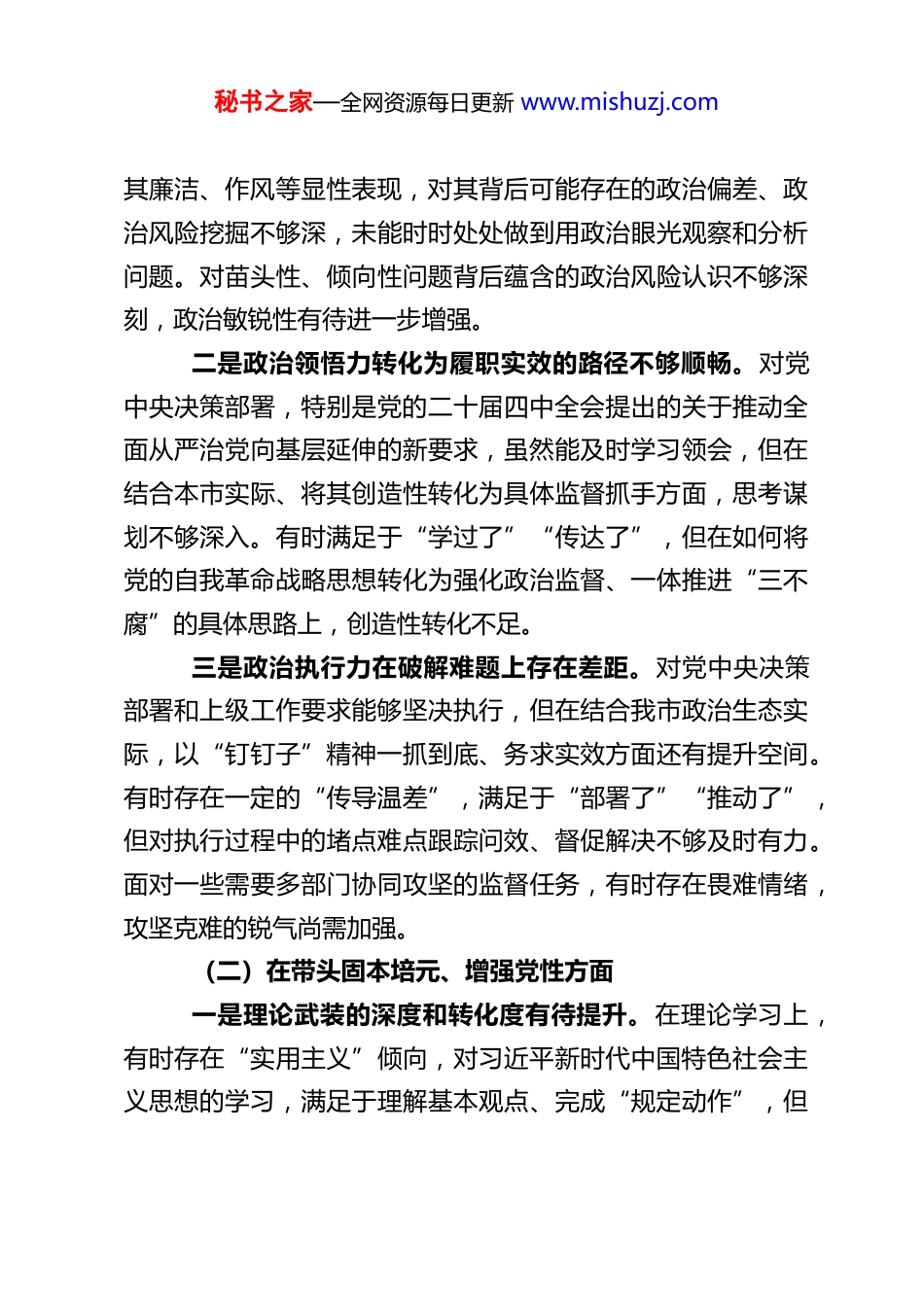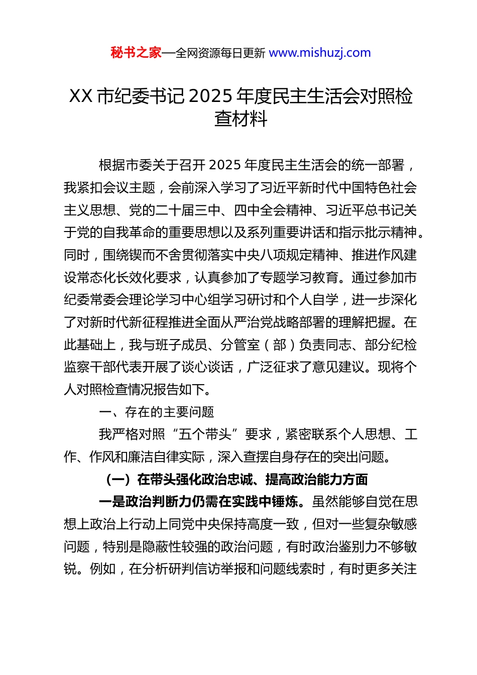 秘书之家—全网资源每日更新 www.mishuzj.comXX 市纪委书记 2025 年度民主生活会对照检查材料根据市委关于召开 2025 年度民主生活会的统一部署,我紧扣会议主题,会前深入学习了习近平新时代中国特色社会主义思想、党的二十届三中、四中全会精神、习近平总书记关于党的自我革命的重要思想以及系列重要讲话和指示批示精神。同时,围绕锲而不舍贯彻落实中央八项规定精神、推进作风建设常态化长效化要求,认真参加了专题学习教育。通过参加市纪委常委会理论学习中心组学习研讨和个人自学,进一步深化了对新时代新征程推进全面从严治党战略部署的理解把握。在此基础上,我与班子成员、分管室(部)负责同志、部分纪检监察干部代表开展了谈心谈话,广泛征求了意见建议。现将个人对照检查情况报告如下。一、存在的主要问题我严格对照“五个带头”要求,紧密联系个人思想、工作、作风和廉洁自律实际,深入查摆自身存在的突出问题。(一)在带头强化政治忠诚、提高政治能力方面一是政治判断力仍需在实践中锤炼。虽然能够自觉在思想上政治上行动上同党中央保持高度一致,但对一些复杂敏感问题,特别是隐蔽性较强的政治问题,有时政治鉴别力不够敏锐。例如,在分析研判信访举报和问题线索时,有时更多关注秘书之家—全网资源每日更新 www.mishuzj.com其廉洁、作风等显性表现,对其背后可能存在的政治偏差、政治风险挖掘不够深,未能时时处处做到用政治眼光观察和分析问题。对苗头性、倾向性问题背后蕴含的政治风险认识不够深刻,政治敏锐性有待进一步增强。二是政治领悟力转化为履职实效的路径不够顺畅。对党中央决策部署,特别是党的二十届四中全会提出的关于推动全面从严治党向基层延伸的新要求,虽然能及时学习领会,但在结合本市实际、将其创造性转化为具体监督抓手方面,思考谋划不够深入。有时满足于“学过了”“传达了”,但在如何将党的自我革命战略思想转化为强化政治监督、一体推进“三不腐”的具体思路上,创造性转化不足。三是政治执行力在破解难题上存在差距。对党中央决策部署和上级工作要求能够坚决执行,但在结合我市政治生态实际,以“钉钉子”精神一抓到底、务求实效方面还有提升空间。有时存在一定的“传导温差”,满足于“部署了”“推动了”,但对执行过程中的堵点难点跟踪问效、督促解决不够及时有力。面对一些需要多部门协同攻坚的监督任务,有时存在畏难情绪,攻坚克难的锐气尚需加强。(二)在带头固本培元、增强党性方面一是理论武装的深度和转化度有待提升。在理论学习上,有时存在“实用主义”倾向,对习近平新时代中国特色社会主义思想的学习,满足于理解基本观点、完成“规定动作”,但秘书之家—全网资源每日更新 www.mishuzj.com对其蕴含的马克思主义立场、观点、方法,特别是贯穿其中的自我革命精神,钻研得不够透彻。在深入贯彻中央八项规定精神学习教育中,虽然带头参加研讨,但将学习成果与自身思想实际、分管工作紧密结合进行深层次自我剖析不够,导致理论学习与党性锤炼、指导实践结合不够紧密。二是党性锻炼的自觉性、主动性有所减弱。随着年龄和任职时间增长,有时不自觉地放松了持续性的党性淬炼,认为自己受党教育多年,政治上坚定,在严格的党内政治生活锤炼上有所松懈。在参加党支部组织生活时,有时以“领导”身份指导工作多,以普通党员身份开展批评与自我批评不够充分、不够“辣”,主动向组织汇报思想动态的频率和深度不如从前。三是理想信念的“压舱石”作用有待进一步夯实。对反腐败斗争“四个任重道远”的严峻性复杂性认识有时不够深刻,面对依然艰巨繁重的正风肃纪反腐任务,有时会产生松劲歇脚、疲劳厌战的情绪,缺乏“得罪千百人、不负十四亿”的坚定决心。世界观、人生观、价值观这个“总开关”还需要时常拧紧。(三)在带头敬畏人民、敬畏组织、敬畏法纪方面一是“敬畏人民”的情怀和行动结合不够紧。虽然深刻认识到“纪委是人民的纪委”,但在具体工作中,如何更好畅通群众监督渠道、便捷群众反映问题、有效维护群众切身利益,思路和办法还不够多。深入基层一线,主动到矛盾集中、问题突出的地方听取群众意见做得还不够。...