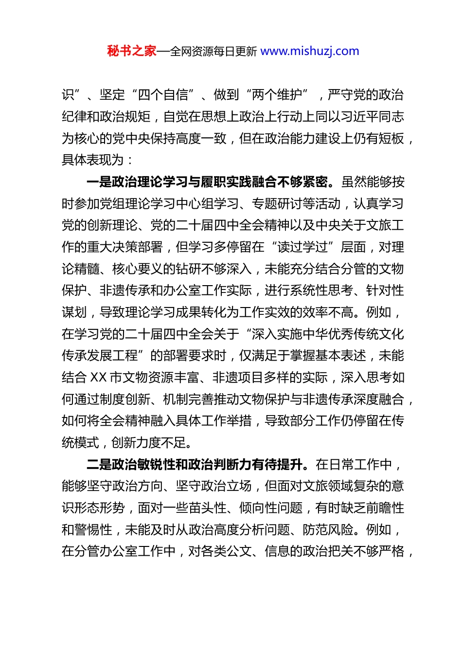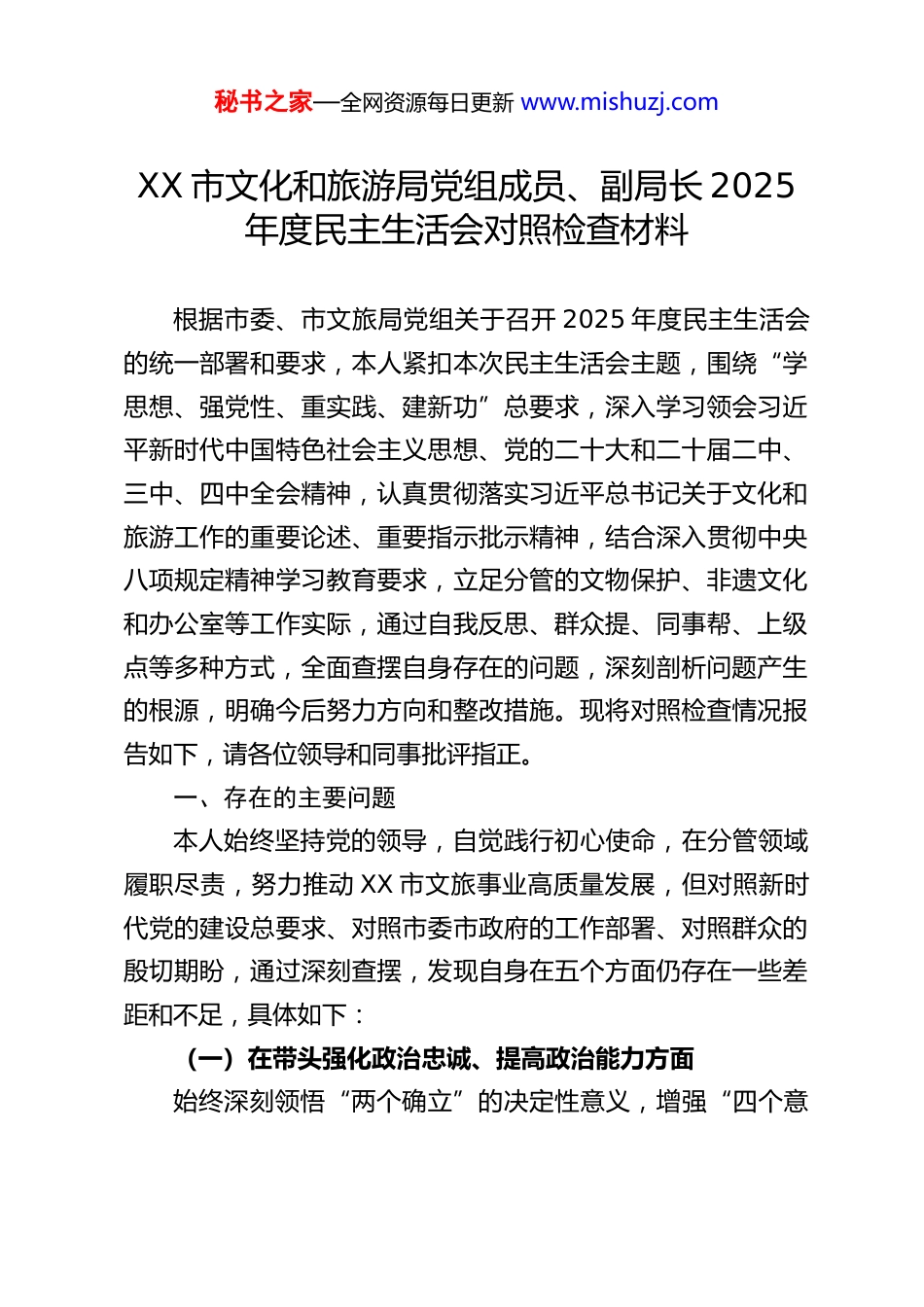 秘书之家—全网资源每日更新 www.mishuzj.comXX 市文化和旅游局党组成员、副局长 2025年度民主生活会对照检查材料根据市委、市文旅局党组关于召开 2025 年度民主生活会的统一部署和要求,本人紧扣本次民主生活会主题,围绕“学思想、强党性、重实践、建新功”总要求,深入学习领会习近平新时代中国特色社会主义思想、党的二十大和二十届二中、三中、四中全会精神,认真贯彻落实习近平总书记关于文化和旅游工作的重要论述、重要指示批示精神,结合深入贯彻中央八项规定精神学习教育要求,立足分管的文物保护、非遗文化和办公室等工作实际,通过自我反思、群众提、同事帮、上级点等多种方式,全面查摆自身存在的问题,深刻剖析问题产生的根源,明确今后努力方向和整改措施。现将对照检查情况报告如下,请各位领导和同事批评指正。一、存在的主要问题本人始终坚持党的领导,自觉践行初心使命,在分管领域履职尽责,努力推动 XX 市文旅事业高质量发展,但对照新时代党的建设总要求、对照市委市政府的工作部署、对照群众的殷切期盼,通过深刻查摆,发现自身在五个方面仍存在一些差距和不足,具体如下:(一)在带头强化政治忠诚、提高政治能力方面始终深刻领悟“两个确立”的决定性意义,增强“四个意秘书之家—全网资源每日更新 www.mishuzj.com识”、坚定“四个自信”、做到“两个维护”,严守党的政治纪律和政治规矩,自觉在思想上政治上行动上同以习近平同志为核心的党中央保持高度一致,但在政治能力建设上仍有短板,具体表现为:一是政治理论学习与履职实践融合不够紧密。虽然能够按时参加党组理论学习中心组学习、专题研讨等活动,认真学习党的创新理论、党的二十届四中全会精神以及中央关于文旅工作的重大决策部署,但学习多停留在“读过学过”层面,对理论精髓、核心要义的钻研不够深入,未能充分结合分管的文物保护、非遗传承和办公室工作实际,进行系统性思考、针对性谋划,导致理论学习成果转化为工作实效的效率不高。例如,在学习党的二十届四中全会关于“深入实施中华优秀传统文化传承发展工程”的部署要求时,仅满足于掌握基本表述,未能结合 XX 市文物资源丰富、非遗项目多样的实际,深入思考如何通过制度创新、机制完善推动文物保护与非遗传承深度融合,如何将全会精神融入具体工作举措,导致部分工作仍停留在传统模式,创新力度不足。二是政治敏锐性和政治判断力有待提升。在日常工作中,能够坚守政治方向、坚守政治立场,但面对文旅领域复杂的意识形态形势,面对一些苗头性、倾向性问题,有时缺乏前瞻性和警惕性,未能及时从政治高度分析问题、防范风险。例如,在分管办公室工作中,对各类公文、信息的政治把关不够严格,秘书之家—全网资源每日更新 www.mishuzj.com有时过于注重格式规范、文字通顺,对内容背后的政治导向、政治影响考量不够细致;在文物保护工作中,对一些涉及文物安全、文化传承的舆情信息,敏感度不足,未能及时主动研判、妥善处置,存在一定的政治风险隐患。三是贯彻落实党中央大政方针和决策部署的执行力不够强劲。能够坚决贯彻落实党中央关于文旅工作的决策部署和省委、市委工作要求,但在具体落实过程中,有时存在“上热中温下冷”的现象,对分管科室、下属单位的督促指导不够严格,对工作推进中的难点堵点问题破解不够有力,导致部分工作推进缓慢、成效不及预期。例如,在落实党中央关于“加强文物保护利用和文化遗产保护传承”的部署要求时,虽然制定了 XX市文物保护工作实施方案,但在推进过程中,对部分乡镇(街道)文物保护工作的督促检查不够经常,对文物修缮资金使用、保护措施落实等情况的监管不够到位,导致部分古民居、古遗址保护力度不足,未能完全实现党中央提出的“保护第一、加强管理、挖掘价值、有效利用、让文物活起来”的工作目标;在落实深入贯彻中央八项规定精神学习教育要求时,虽然组织分管科室开展了学习,但对学习成效的检验不够严格,部分干部职工存在学习走过场、思想认识不到位的问题,未能将八项规定精神真正内化于心、外化于行。(二)在带头固本培元、增强党性方面坚持把政治修养摆在党性修养的首...