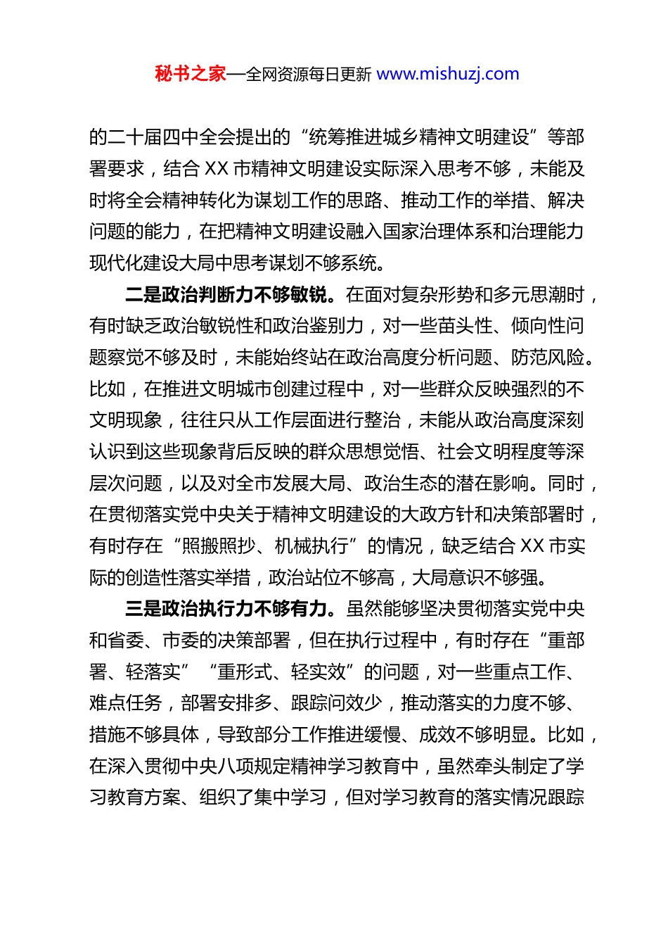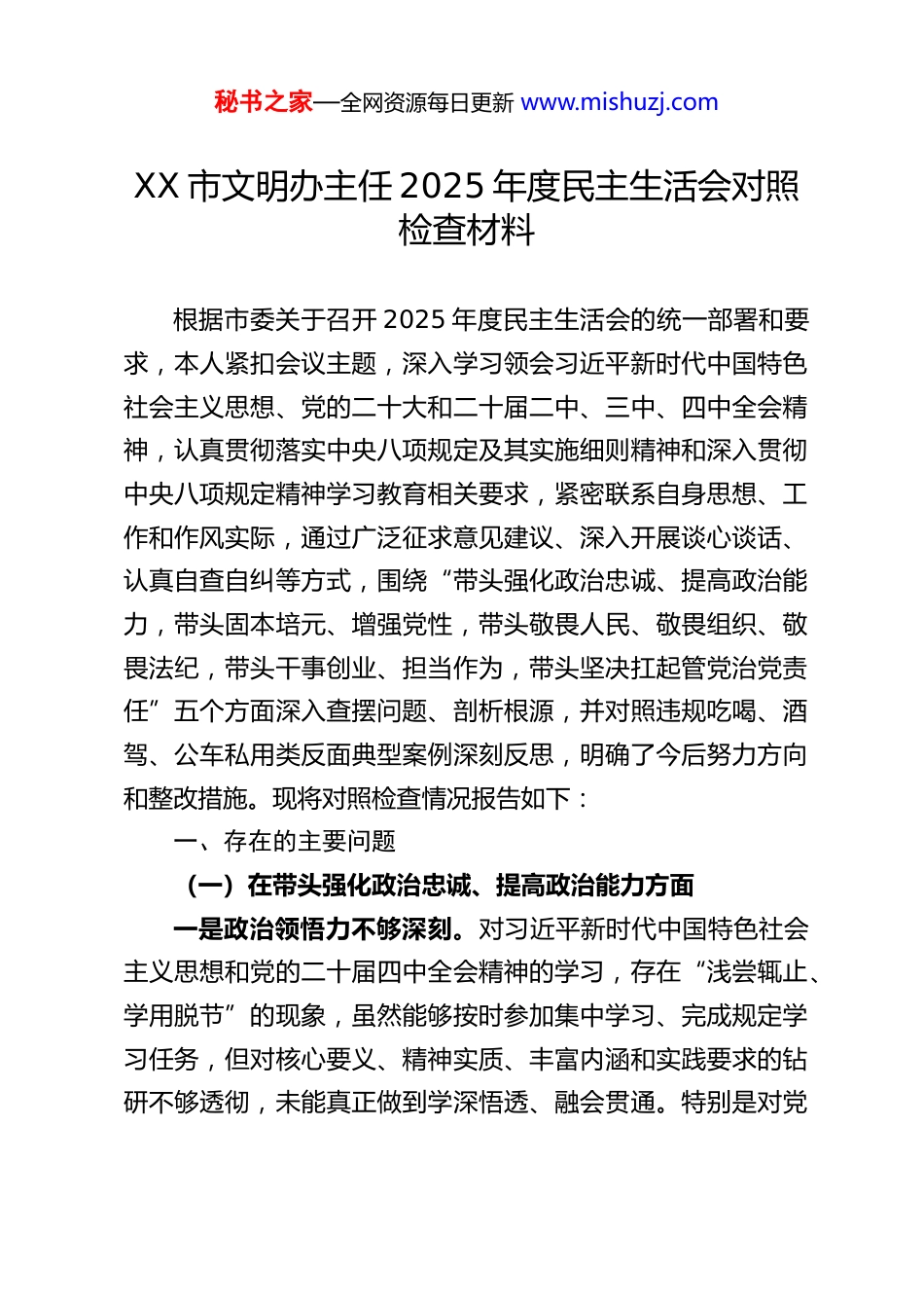 秘书之家—全网资源每日更新 www.mishuzj.comXX 市文明办主任 2025 年度民主生活会对照检查材料根据市委关于召开 2025 年度民主生活会的统一部署和要求,本人紧扣会议主题,深入学习领会习近平新时代中国特色社会主义思想、党的二十大和二十届二中、三中、四中全会精神,认真贯彻落实中央八项规定及其实施细则精神和深入贯彻中央八项规定精神学习教育相关要求,紧密联系自身思想、工作和作风实际,通过广泛征求意见建议、深入开展谈心谈话、认真自查自纠等方式,围绕“带头强化政治忠诚、提高政治能力,带头固本培元、增强党性,带头敬畏人民、敬畏组织、敬畏法纪,带头干事创业、担当作为,带头坚决扛起管党治党责任”五个方面深入查摆问题、剖析根源,并对照违规吃喝、酒驾、公车私用类反面典型案例深刻反思,明确了今后努力方向和整改措施。现将对照检查情况报告如下:一、存在的主要问题(一)在带头强化政治忠诚、提高政治能力方面一是政治领悟力不够深刻。对习近平新时代中国特色社会主义思想和党的二十届四中全会精神的学习,存在“浅尝辄止、学用脱节”的现象,虽然能够按时参加集中学习、完成规定学习任务,但对核心要义、精神实质、丰富内涵和实践要求的钻研不够透彻,未能真正做到学深悟透、融会贯通。特别是对党秘书之家—全网资源每日更新 www.mishuzj.com的二十届四中全会提出的“统筹推进城乡精神文明建设”等部署要求,结合 XX 市精神文明建设实际深入思考不够,未能及时将全会精神转化为谋划工作的思路、推动工作的举措、解决问题的能力,在把精神文明建设融入国家治理体系和治理能力现代化建设大局中思考谋划不够系统。二是政治判断力不够敏锐。在面对复杂形势和多元思潮时,有时缺乏政治敏锐性和政治鉴别力,对一些苗头性、倾向性问题察觉不够及时,未能始终站在政治高度分析问题、防范风险。比如,在推进文明城市创建过程中,对一些群众反映强烈的不文明现象,往往只从工作层面进行整治,未能从政治高度深刻认识到这些现象背后反映的群众思想觉悟、社会文明程度等深层次问题,以及对全市发展大局、政治生态的潜在影响。同时,在贯彻落实党中央关于精神文明建设的大政方针和决策部署时,有时存在“照搬照抄、机械执行”的情况,缺乏结合 XX 市实际的创造性落实举措,政治站位不够高,大局意识不够强。三是政治执行力不够有力。虽然能够坚决贯彻落实党中央和省委、市委的决策部署,但在执行过程中,有时存在“重部署、轻落实”“重形式、轻实效”的问题,对一些重点工作、难点任务,部署安排多、跟踪问效少,推动落实的力度不够、措施不够具体,导致部分工作推进缓慢、成效不够明显。比如,在深入贯彻中央八项规定精神学习教育中,虽然牵头制定了学习教育方案、组织了集中学习,但对学习教育的落实情况跟踪秘书之家—全网资源每日更新 www.mishuzj.com督导不够严格,对部分干部学习不深入、领会不透彻、践行不到位的问题,未能及时采取有效措施督促整改,导致学习教育成效不够显著。同时,在推动精神文明建设各项工作落地见效时,有时存在“虎头蛇尾”的情况,缺乏一抓到底、务求实效的韧劲和决心。(二)在带头固本培元、增强党性方面本人始终坚持把政治修养摆在党性修养的首位,自觉以习近平新时代中国特色社会主义思想凝心铸魂,认真学习党章党规党纪,努力坚守共产党人精神追求,解决好世界观、人生观、价值观这个总开关问题。但对照坚持把政治修养摆在党性修养的首位、坚守共产党人精神追求、筑牢对党忠诚、厚植为民情怀、保持清正廉洁的更高要求,仍存在一些差距和不足。一是理论学习不够扎实。对习近平新时代中国特色社会主义思想的学习,存在“被动学习、应付学习”的现象,缺乏主动学习、深入钻研的自觉性和主动性。平时忙于日常事务性工作,静下心来系统学习的时间较少,学习多以通读原文、摘抄笔记为主,缺乏对理论知识的深入思考和实践运用,未能真正做到学思用贯通、知信行统一。特别是对党章党规党纪的学习,不够系统全面,对一些新修订的党章党规党纪,学习不够及时、领会不够深刻,未能始终用党章党规党纪规范自己的言行举止,在党...
