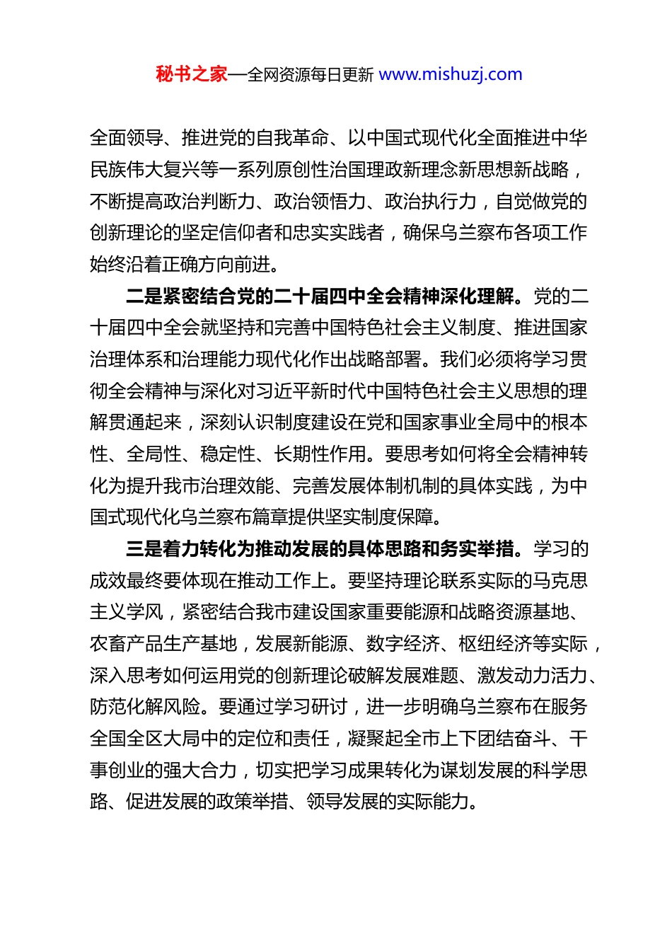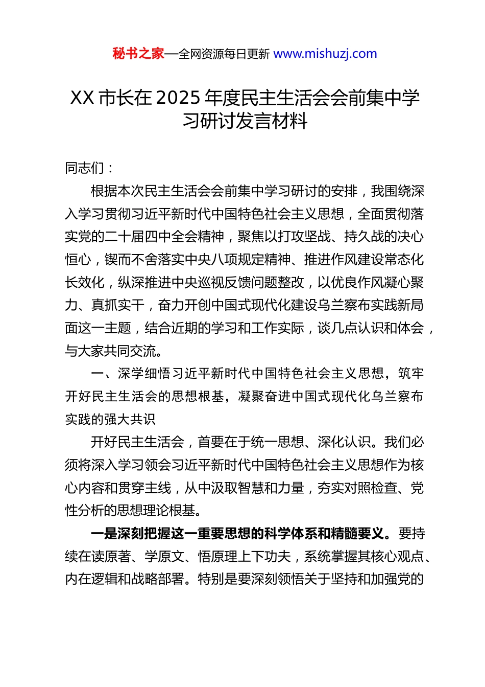 秘书之家—全网资源每日更新 www.mishuzj.comXX 市长在 2025 年度民主生活会会前集中学习研讨发言材料同志们:根据本次民主生活会会前集中学习研讨的安排,我围绕深入学习贯彻习近平新时代中国特色社会主义思想,全面贯彻落实党的二十届四中全会精神,聚焦以打攻坚战、持久战的决心恒心,锲而不舍落实中央八项规定精神、推进作风建设常态化长效化,纵深推进中央巡视反馈问题整改,以优良作风凝心聚力、真抓实干,奋力开创中国式现代化建设乌兰察布实践新局面这一主题,结合近期的学习和工作实际,谈几点认识和体会,与大家共同交流。一、深学细悟习近平新时代中国特色社会主义思想,筑牢开好民主生活会的思想根基,凝聚奋进中国式现代化乌兰察布实践的强大共识开好民主生活会,首要在于统一思想、深化认识。我们必须将深入学习领会习近平新时代中国特色社会主义思想作为核心内容和贯穿主线,从中汲取智慧和力量,夯实对照检查、党性分析的思想理论根基。一是深刻把握这一重要思想的科学体系和精髓要义。要持续在读原著、学原文、悟原理上下功夫,系统掌握其核心观点、内在逻辑和战略部署。特别是要深刻领悟关于坚持和加强党的秘书之家—全网资源每日更新 www.mishuzj.com全面领导、推进党的自我革命、以中国式现代化全面推进中华民族伟大复兴等一系列原创性治国理政新理念新思想新战略,不断提高政治判断力、政治领悟力、政治执行力,自觉做党的创新理论的坚定信仰者和忠实实践者,确保乌兰察布各项工作始终沿着正确方向前进。二是紧密结合党的二十届四中全会精神深化理解。党的二十届四中全会就坚持和完善中国特色社会主义制度、推进国家治理体系和治理能力现代化作出战略部署。我们必须将学习贯彻全会精神与深化对习近平新时代中国特色社会主义思想的理解贯通起来,深刻认识制度建设在党和国家事业全局中的根本性、全局性、稳定性、长期性作用。要思考如何将全会精神转化为提升我市治理效能、完善发展体制机制的具体实践,为中国式现代化乌兰察布篇章提供坚实制度保障。三是着力转化为推动发展的具体思路和务实举措。学习的成效最终要体现在推动工作上。要坚持理论联系实际的马克思主义学风,紧密结合我市建设国家重要能源和战略资源基地、农畜产品生产基地,发展新能源、数字经济、枢纽经济等实际,深入思考如何运用党的创新理论破解发展难题、激发动力活力、防范化解风险。要通过学习研讨,进一步明确乌兰察布在服务全国全区大局中的定位和责任,凝聚起全市上下团结奋斗、干事创业的强大合力,切实把学习成果转化为谋划发展的科学思路、促进发展的政策举措、领导发展的实际能力。秘书之家—全网资源每日更新 www.mishuzj.com二、以打攻坚战、持久战的决心恒心,锲而不舍落实中央八项规定精神,推进作风建设常态化长效化作风建设关系人心向背,关系党的执政基础。中央八项规定是长期有效的铁规矩、硬杠杠。我们必须清醒认识到,作风问题具有顽固性、反复性,纠治“四风”不能止步,必须常抓不懈、久久为功,以“永远在路上”的清醒和坚定,将好作风弘扬在新时代。一是坚持严字当头,保持高压态势。要深刻认识“四风”问题的政治本质和政治危害,坚决克服“疲劳厌战”情绪和“歇脚松劲”想法。对享乐主义、奢靡之风等歪风陋习要露头就打、反复敲打,特别是要紧盯隐形变异新动向,深挖细查,防止反弹回潮。要聚焦形式主义、官僚主义这一党和人民事业的大敌,着力纠治影响党中央决策部署和自治区党委、市委工作要求贯彻落实、加重基层负担、权力观扭曲政绩观错位等问题,引导党员干部把心思用在干事业上,把功夫下到察实情、出实招、办实事、求实效上。二是健全长效机制,深化标本兼治。推进作风建设常态化长效化,关键在制度。要坚持纠“四风”与树新风并举,在严厉惩治不正之风的同时,大力弘扬党的光荣传统和优良作风,倡导清正廉洁、担当作为的时代新风。要不断完善落实中央八项规定精神的具体措施,细化和规范相关制度规定,增强制度的针对性、可操作性和约束力。要强化制度执行,加强对制度秘书之家—全网资源每日更新 www.mishuzj.com落实情况的监督检查,对顶风违纪...