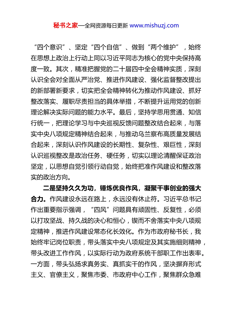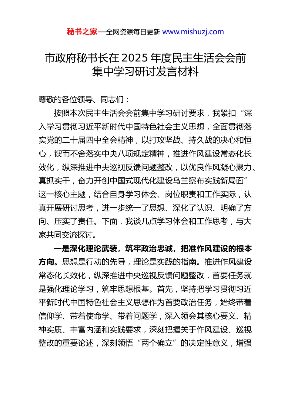 秘书之家—全网资源每日更新 www.mishuzj.com市政府秘书长在 2025 年度民主生活会会前集中学习研讨发言材料尊敬的各位领导、同志们:按照本次民主生活会会前集中学习研讨要求,我紧扣“深入学习贯彻习近平新时代中国特色社会主义思想,全面贯彻落实党的二十届四中全会精神,以打攻坚战、持久战的决心和恒心,锲而不舍落实中央八项规定精神,推进作风建设常态化长效化,纵深推进中央巡视反馈问题整改,以优良作风凝心聚力、真抓实干,奋力开创中国式现代化建设乌兰察布实践新局面”这一核心主题,结合自身学习体会、岗位职责和工作实际,认真开展研讨思考,进一步统一了思想、深化了认识、明确了方向、压实了责任。下面,我谈几点学习体会和工作思考,与大家共同交流探讨。一是深化理论武装,筑牢政治忠诚,把准作风建设的根本方向。思想是行动的先导,理论是实践的指南。推进作风建设常态化长效化,纵深推进中央巡视反馈问题整改,首要任务就是强化理论学习,筑牢思想根基。首先,坚持把学习贯彻习近平新时代中国特色社会主义思想作为首要政治任务,始终带着信仰学、带着使命学、带着问题学,深入领会其核心要义、精神实质、丰富内涵和实践要求,深刻把握关于作风建设、巡视整改的重要论述,深刻领悟“两个确立”的决定性意义,增强秘书之家—全网资源每日更新 www.mishuzj.com“四个意识”、坚定“四个自信”、做到“两个维护”,始终在思想上政治上行动上同以习近平同志为核心的党中央保持高度一致。其次,精准把握党的二十届四中全会精神实质,深刻认识全会对全面从严治党、推进作风建设、强化监督整改提出的新部署新要求,切实把全会精神转化为推动作风建设、抓好整改落实、履职尽责担当的具体举措,不断提升运用党的创新理论解决实际问题的能力水平。最后,坚持学思用贯通、知信行统一,把理论学习与中央巡视反馈问题整改结合起来,与落实中央八项规定精神结合起来,与推动乌兰察布高质量发展结合起来,深刻认识作风建设的长期性、复杂性、艰巨性,深刻认识巡视整改是政治任务、硬任务,切实以理论清醒保证政治坚定,以思想自觉引领行动自觉,始终把准作风建设和整改落实的政治方向。二是坚持久久为功,锤炼优良作风,凝聚干事创业的强大合力。作风建设永远在路上,永远没有休止符。习近平总书记作出重要指示强调,“四风”问题具有顽固性、反复性,必须以打攻坚战、持久战的决心和恒心,锲而不舍落实中央八项规定精神,推进作风建设常态化长效化。作为市政府秘书长,我始终牢记岗位职责,带头落实中央八项规定及其实施细则精神,带头改进工作作风,以实际行动为政府系统干部职工作出表率。一方面,带头弘扬求真务实、真抓实干的作风,坚决摒弃形式主义、官僚主义,聚焦市委、市政府中心工作,聚焦群众急难秘书之家—全网资源每日更新 www.mishuzj.com愁盼问题,聚焦中央巡视反馈突出问题,察实情、出实招、求实效,不搞花架子、不做表面文章,把更多时间和精力投入到抓落实、解难题、促发展上,切实做到事事有回应、件件有落实。另一方面,带头严守纪律规矩,时刻绷紧廉洁自律这根弦,严格遵守党的政治纪律、组织纪律、廉洁纪律、群众纪律、工作纪律、生活纪律,自觉净化社交圈、生活圈、朋友圈,坚决抵制享乐主义、奢靡之风,坚决防止“四风”问题反弹回潮。同时,主动扛起作风建设牵头抓总责任,协助市政府主要领导抓好政府系统作风建设,健全完善常态化监督机制,强化日常监督管理,对苗头性、倾向性问题早发现、早提醒、早纠正,引导政府系统干部职工锤炼过硬作风,凝聚起“心往一处想、劲往一处使”的强大合力,以优良作风护航乌兰察布高质量发展。三是强化政治担当,狠抓整改落实,筑牢高质量发展的坚实屏障。中央巡视反馈问题,既是对我们工作的精准“把脉问诊”,也是对我们作风建设的全面“体检检视”,抓好巡视反馈问题整改,是践行“两个维护”的具体体现,是改进工作作风、提升治理能力的重要契机。作为市政府秘书长,我始终坚持问题导向、目标导向、结果导向相统一,以高度的政治责任感和使命感,牵头抓好政府系统中央巡视反馈问题整改落实工作。首先,提...