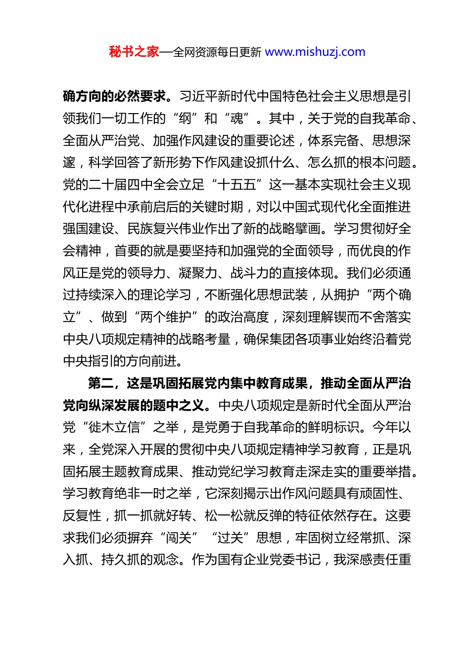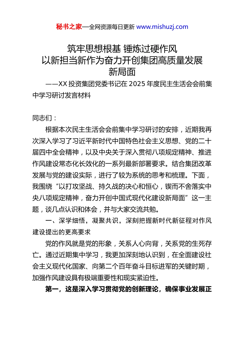 秘书之家—全网资源每日更新 www.mishuzj.com筑牢思想根基 锤炼过硬作风以新担当新作为奋力开创集团高质量发展新局面——XX 投资集团党委书记在 2025 年度民主生活会会前集中学习研讨发言材料同志们:根据本次民主生活会会前集中学习研讨的安排,近期我再次深入学习了习近平新时代中国特色社会主义思想、党的二十届四中全会精神,以及中央关于深入贯彻八项规定精神、推进作风建设常态化长效化的一系列最新部署要求。结合集团改革发展与党的建设实际,进行了较为系统的思考和梳理。下面,我围绕“以打攻坚战、持久战的决心和恒心,锲而不舍落实中央八项规定精神,奋力开创中国式现代化建设新局面”这一主题,谈几点认识和体会,并与大家交流共勉。一、深学细悟,凝聚共识,深刻把握新时代新征程对作风建设提出的更高要求党的作风就是党的形象,关系人心向背,关系党的生死存亡。通过近期集中学习,我更加深刻地认识到,在全面建设社会主义现代化国家、向第二个百年奋斗目标进军的关键时期,加强作风建设具有极端重要性和现实紧迫性。第一,这是深入学习贯彻党的创新理论,确保事业发展正秘书之家—全网资源每日更新 www.mishuzj.com确方向的必然要求。习近平新时代中国特色社会主义思想是引领我们一切工作的“纲”和“魂”。其中,关于党的自我革命、全面从严治党、加强作风建设的重要论述,体系完备、思想深邃,科学回答了新形势下作风建设抓什么、怎么抓的根本问题。党的二十届四中全会立足“十五五”这一基本实现社会主义现代化进程中承前启后的关键时期,对以中国式现代化全面推进强国建设、民族复兴伟业作出了新的战略擘画。学习贯彻好全会精神,首要的就是要坚持和加强党的全面领导,而优良的作风正是党的领导力、凝聚力、战斗力的直接体现。我们必须通过持续深入的理论学习,不断强化思想武装,从拥护“两个确立”、做到“两个维护”的政治高度,深刻理解锲而不舍落实中央八项规定精神的战略考量,确保集团各项事业始终沿着党中央指引的方向前进。第二,这是巩固拓展党内集中教育成果,推动全面从严治党向纵深发展的题中之义。中央八项规定是新时代全面从严治党“徙木立信”之举,是党勇于自我革命的鲜明标识。今年以来,全党深入开展的贯彻中央八项规定精神学习教育,正是巩固拓展主题教育成果、推动党纪学习教育走深走实的重要举措。学习教育绝非一时之举,它深刻揭示出作风问题具有顽固性、反复性,抓一抓就好转、松一松就反弹的特征依然存在。这要求我们必须摒弃“闯关”“过关”思想,牢固树立经常抓、深入抓、持久抓的观念。作为国有企业党委书记,我深感责任重秘书之家—全网资源每日更新 www.mishuzj.com大,必须带头将学习教育的成果转化为常态长效的机制,将“严”的主基调长期坚持下去,不断涵养集团风清气正的政治生态。第三,这是激发干事创业内生动力,奋力开创集团服务中国式现代化新局面的坚强保障。党的二十届四中全会明确了“十五五”时期经济社会发展的主要目标和战略任务,对建设现代化产业体系、发展新质生产力、深化国企改革等作出了具体部署。宏伟蓝图变为美好现实,关键在党,关键在人,关键在作风。好的作风出凝聚力、出战斗力、出生产力。当前,集团正处在转型升级、攻坚克难的关键阶段,面临的市场竞争愈发激烈,承担的国家战略任务愈发艰巨。如果没有求真务实、担当作为的硬作风,就难以应对风险挑战,难以抓住发展机遇。我们必须清醒认识到,作风建设的好坏,直接关系到集团能否在服务国家“十五五”发展大局中找准定位、展现作为,直接关系到我们能否凝聚起全体干部职工的智慧和力量,将规划蓝图转化为“施工图”“实景画”。二、对标对表,反躬自省,清醒认识当前作风建设中存在的突出问题和风险隐患坚持问题导向,是党内教育取得实效的关键。对照习近平总书记关于作风建设的重要指示,对照中央八项规定及其实施细则精神,对照党的二十届四中全会提出的高质量发展要求,结合学习教育中查摆问题的普遍性方法,我深感集团党委班子秘书之家—全网资源每日更新 www.mishuzj.com及我个人在作风建设上,距离党中央的严格要求、距离干部职工...