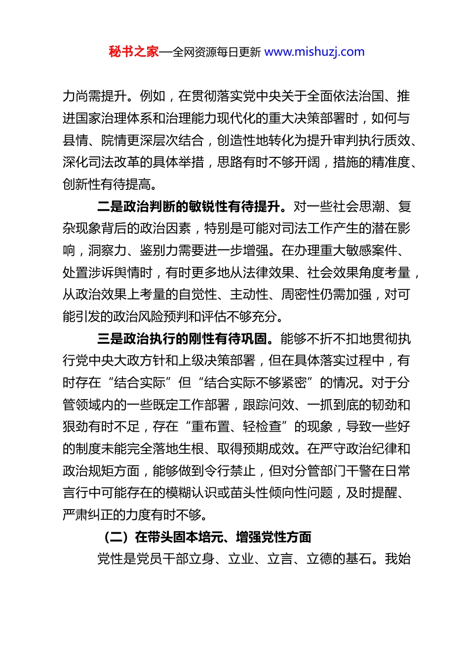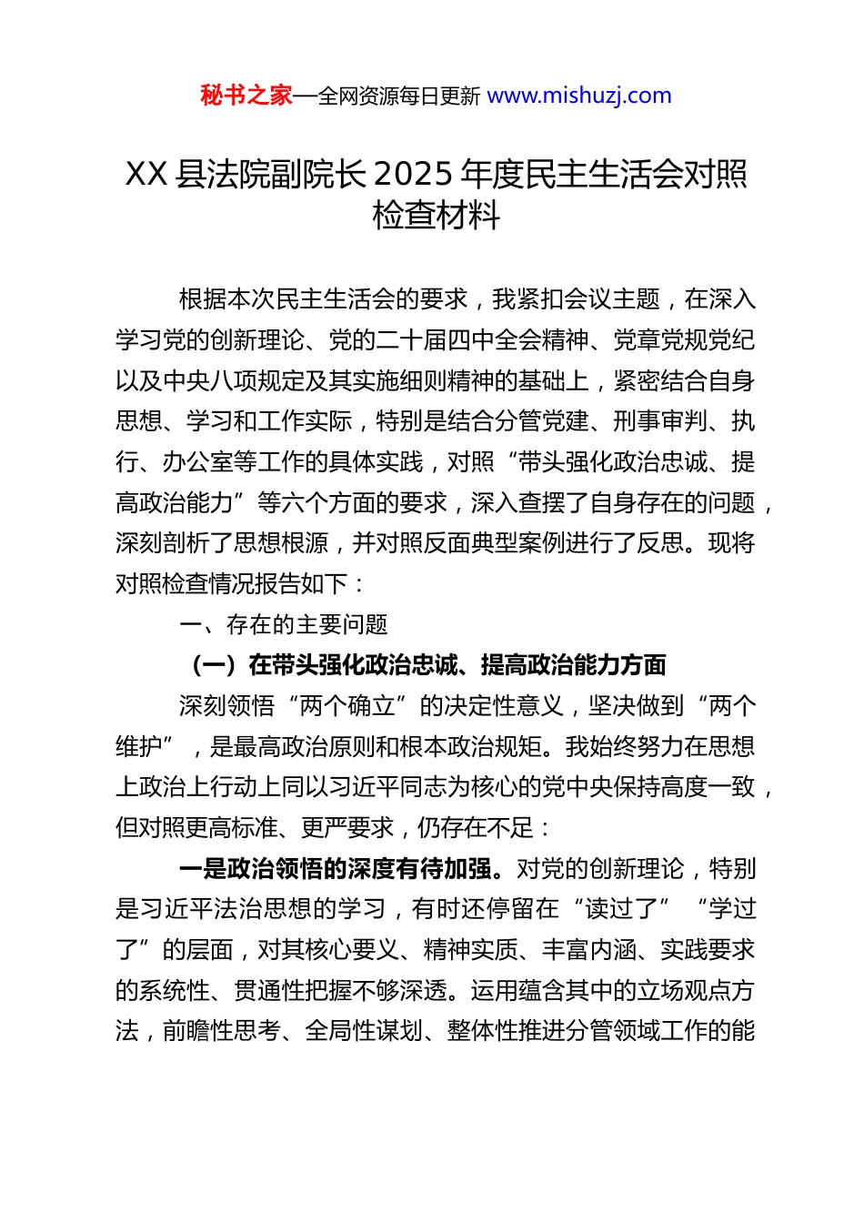秘书之家—全网资源每日更新 www.mishuzj.comXX 县法院副院长 2025 年度民主生活会对照检查材料根据本次民主生活会的要求,我紧扣会议主题,在深入学习党的创新理论、党的二十届四中全会精神、党章党规党纪以及中央八项规定及其实施细则精神的基础上,紧密结合自身思想、学习和工作实际,特别是结合分管党建、刑事审判、执行、办公室等工作的具体实践,对照“带头强化政治忠诚、提高政治能力”等六个方面的要求,深入查摆了自身存在的问题,深刻剖析了思想根源,并对照反面典型案例进行了反思。现将对照检查情况报告如下:一、存在的主要问题(一)在带头强化政治忠诚、提高政治能力方面深刻领悟“两个确立”的决定性意义,坚决做到“两个维护”,是最高政治原则和根本政治规矩。我始终努力在思想上政治上行动上同以习近平同志为核心的党中央保持高度一致,但对照更高标准、更严要求,仍存在不足:一是政治领悟的深度有待加强。对党的创新理论,特别是习近平法治思想的学习,有时还停留在“读过了”“学过了”的层面,对其核心要义、精神实质、丰富内涵、实践要求的系统性、贯通性把握不够深透。运用蕴含其中的立场观点方法,前瞻性思考、全局性谋划、整体性推进分管领域工作的能秘书之家—全网资源每日更新 www.mishuzj.com力尚需提升。例如,在贯彻落实党中央关于全面依法治国、推进国家治理体系和治理能力现代化的重大决策部署时,如何与县情、院情更深层次结合,创造性地转化为提升审判执行质效、深化司法改革的具体举措,思路有时不够开阔,措施的精准度、创新性有待提高。二是政治判断的敏锐性有待提升。对一些社会思潮、复杂现象背后的政治因素,特别是可能对司法工作产生的潜在影响,洞察力、鉴别力需要进一步增强。在办理重大敏感案件、处置涉诉舆情时,有时更多地从法律效果、社会效果角度考量,从政治效果上考量的自觉性、主动性、周密性仍需加强,对可能引发的政治风险预判和评估不够充分。三是政治执行的刚性有待巩固。能够不折不扣地贯彻执行党中央大政方针和上级决策部署,但在具体落实过程中,有时存在“结合实际”但“结合实际不够紧密”的情况。对于分管领域内的一些既定工作部署,跟踪问效、一抓到底的韧劲和狠劲有时不足,存在“重布置、轻检查”的现象,导致一些好的制度未能完全落地生根、取得预期成效。在严守政治纪律和政治规矩方面,能够做到令行禁止,但对分管部门干警在日常言行中可能存在的模糊认识或苗头性倾向性问题,及时提醒、严肃纠正的力度有时不够。(二)在带头固本培元、增强党性方面党性是党员干部立身、立业、立言、立德的基石。我始秘书之家—全网资源每日更新 www.mishuzj.com终注重加强党性锻炼,但对照党员标准和党性原则,仍有差距:一是理论武装的自觉性系统性不足。虽然坚持参加集体学习,但个人自学的主动性、系统性不够强,存在“要我学”多于“我要学”的情况。对习近平新时代中国特色社会主义思想的学习,有时碎片化,缺乏“挤”和“钻”的精神,对其世界观和方法论的理解运用不够纯熟。用党的创新理论改造主观世界、解决“总开关”问题的深度不够,理想信念的基础有待进一步夯实,在面对繁重任务和复杂矛盾时,艰苦奋斗、攻坚克难的精神状态偶有起伏。二是党性修养的锤炼标准不够高。对照党章党规党纪这面镜子,时常进行自我检视,但有时“照”得不够勤、不够深、不够全。以党性原则“正心明道、修身律己”的主动性、彻底性有待加强。在传承党的优良传统和作风方面,言传身教做得还不够到位,对分管部门干警的党性教育、宗旨教育抓得不够紧实。自我革命精神有所弱化,对一些非原则性的小问题、小毛病,有时“睁一只眼闭一只眼”,批评与自我批评的武器运用得不够经常、不够有力,辣味不足。三是宗旨意识践行有待深化。虽然内心始终装着群众,但在“厚植为民情怀”上,深入基层一线、深入群众中间了解真实司法需求、倾听群众心声的次数和深度还不够。有时习惯于坐在办公室听汇报、看材料,对人民群众在司法过程中的“急难愁盼”问题,特别是涉及刑事被害人权益保障、执行难秘书之家—全网资源每日更新 www.mishuzj.com背...