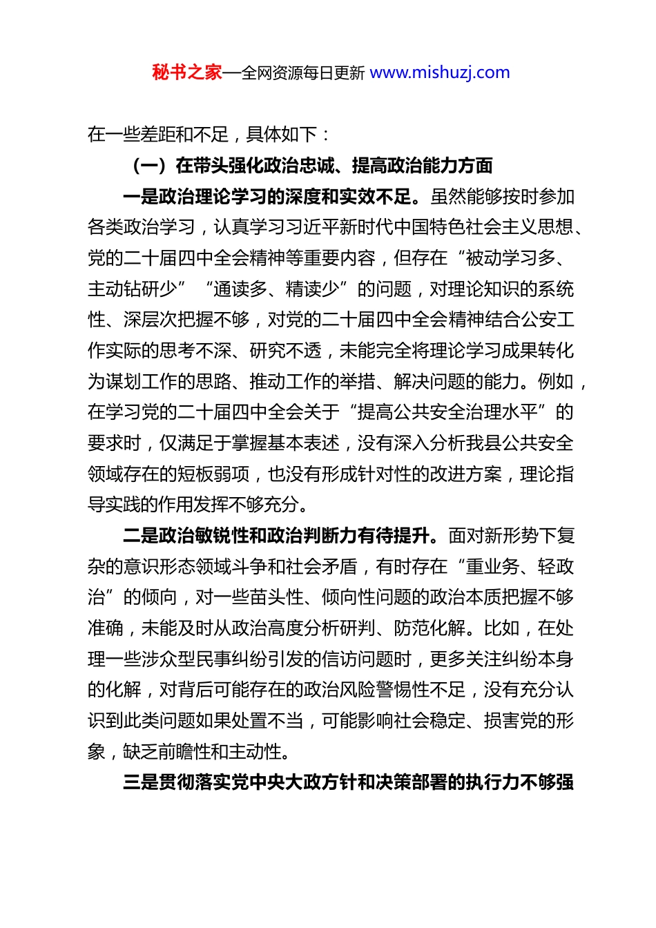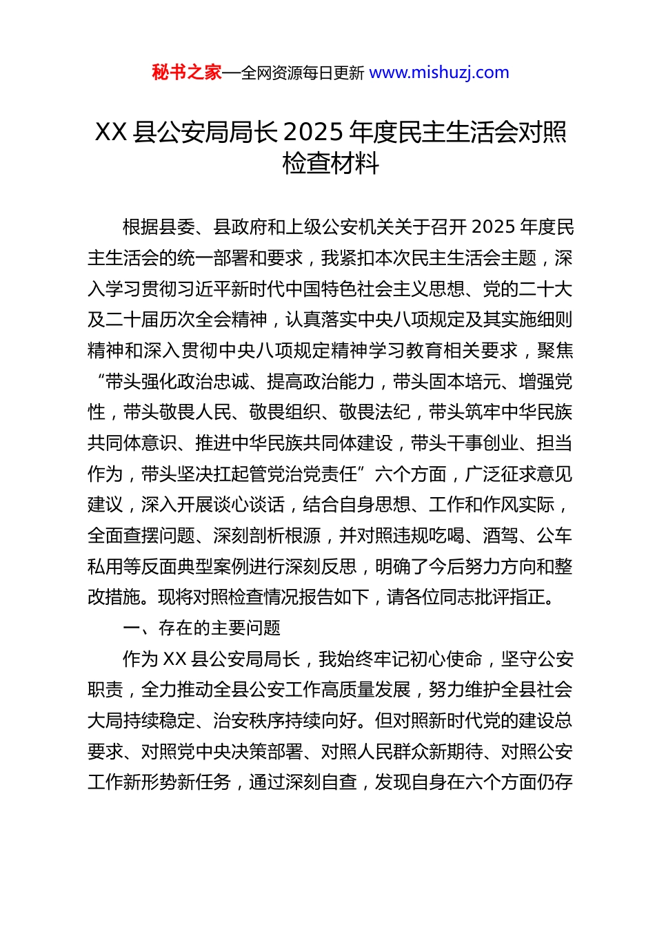 秘书之家—全网资源每日更新 www.mishuzj.comXX 县公安局局长 2025 年度民主生活会对照检查材料根据县委、县政府和上级公安机关关于召开 2025 年度民主生活会的统一部署和要求,我紧扣本次民主生活会主题,深入学习贯彻习近平新时代中国特色社会主义思想、党的二十大及二十届历次全会精神,认真落实中央八项规定及其实施细则精神和深入贯彻中央八项规定精神学习教育相关要求,聚焦“带头强化政治忠诚、提高政治能力,带头固本培元、增强党性,带头敬畏人民、敬畏组织、敬畏法纪,带头筑牢中华民族共同体意识、推进中华民族共同体建设,带头干事创业、担当作为,带头坚决扛起管党治党责任”六个方面,广泛征求意见建议,深入开展谈心谈话,结合自身思想、工作和作风实际,全面查摆问题、深刻剖析根源,并对照违规吃喝、酒驾、公车私用等反面典型案例进行深刻反思,明确了今后努力方向和整改措施。现将对照检查情况报告如下,请各位同志批评指正。一、存在的主要问题作为 XX 县公安局局长,我始终牢记初心使命,坚守公安职责,全力推动全县公安工作高质量发展,努力维护全县社会大局持续稳定、治安秩序持续向好。但对照新时代党的建设总要求、对照党中央决策部署、对照人民群众新期待、对照公安工作新形势新任务,通过深刻自查,发现自身在六个方面仍存秘书之家—全网资源每日更新 www.mishuzj.com在一些差距和不足,具体如下:(一)在带头强化政治忠诚、提高政治能力方面一是政治理论学习的深度和实效不足。虽然能够按时参加各类政治学习,认真学习习近平新时代中国特色社会主义思想、党的二十届四中全会精神等重要内容,但存在“被动学习多、主动钻研少”“通读多、精读少”的问题,对理论知识的系统性、深层次把握不够,对党的二十届四中全会精神结合公安工作实际的思考不深、研究不透,未能完全将理论学习成果转化为谋划工作的思路、推动工作的举措、解决问题的能力。例如,在学习党的二十届四中全会关于“提高公共安全治理水平”的要求时,仅满足于掌握基本表述,没有深入分析我县公共安全领域存在的短板弱项,也没有形成针对性的改进方案,理论指导实践的作用发挥不够充分。二是政治敏锐性和政治判断力有待提升。面对新形势下复杂的意识形态领域斗争和社会矛盾,有时存在“重业务、轻政治”的倾向,对一些苗头性、倾向性问题的政治本质把握不够准确,未能及时从政治高度分析研判、防范化解。比如,在处理一些涉众型民事纠纷引发的信访问题时,更多关注纠纷本身的化解,对背后可能存在的政治风险警惕性不足,没有充分认识到此类问题如果处置不当,可能影响社会稳定、损害党的形象,缺乏前瞻性和主动性。三是贯彻落实党中央大政方针和决策部署的执行力不够强秘书之家—全网资源每日更新 www.mishuzj.com在推动上级决策部署落地见效过程中,有时存在“照搬照抄、机械执行”的情况,结合我县公安工作实际创造性开展工作不够,存在“上热中温下冷”的现象。例如,在落实上级关于常态化开展扫黑除恶斗争的部署要求时,虽然制定了工作方案、召开了动员会议,但在具体推进过程中,对一些重点领域、重点行业的排查整治不够深入,对黑恶势力“保护伞”的线索摸排不够细致,导致部分工作成效未达预期,未能完全将党中央的决策部署转化为维护全县社会治安稳定的实际成效。同时,在保持战略定力、增强必胜信心方面,面对公安工作中的难点堵点问题,有时会出现畏难情绪,缺乏“逢山开路、遇水架桥”的闯劲和韧劲。(二)在带头固本培元、增强党性方面一是理想信念的坚定性有待进一步强化。虽然能够始终坚守共产党人的理想信念,但在面对各种诱惑和考验时,有时会出现思想松懈的情况,对理想信念的内涵理解不够深刻,缺乏持之以恒的锤炼。例如,在日常工作中,有时会注重业务指标的完成,忽视了理想信念的持续提升,没有经常对照党章党规党纪检视自身的思想和行为,对“为中国人民谋幸福、为中华民族谋复兴”的初心使命感悟不够深刻,党性修养的自觉性不够强。二是党章党规党纪学习不够深入扎实。在学习党章党规党纪过程中,存在“浅尝辄止、学用脱节”的问题,对党章的核秘书之家...