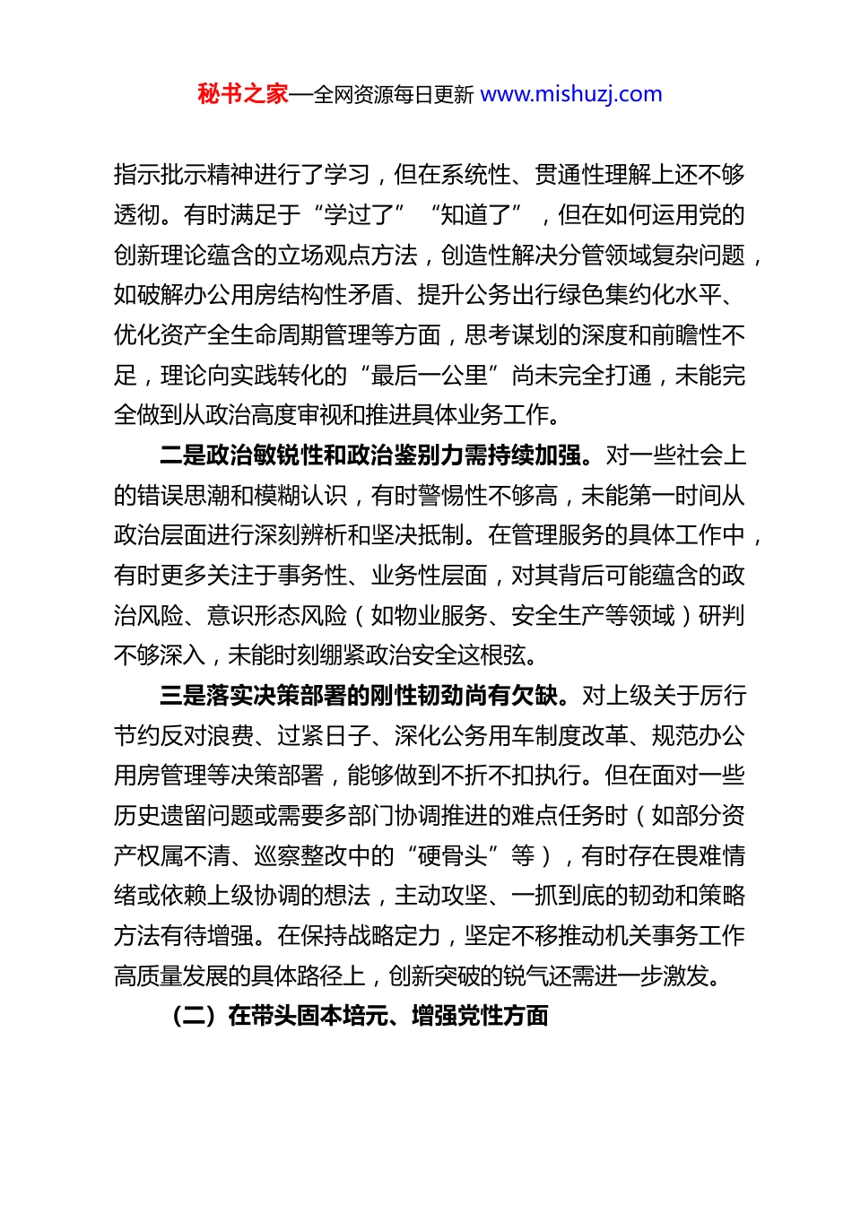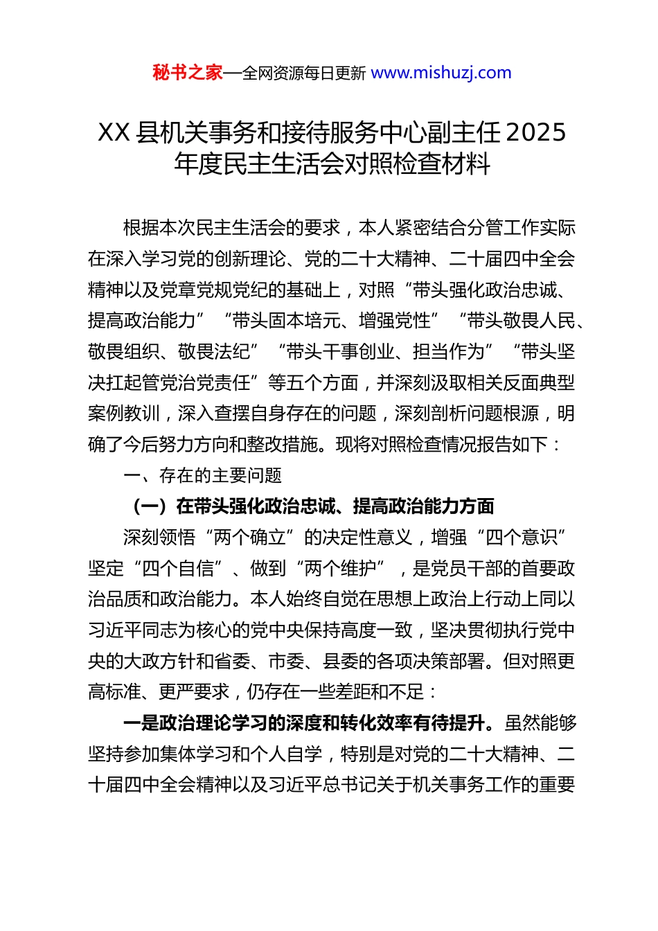 秘书之家—全网资源每日更新 www.mishuzj.comXX 县机关事务和接待服务中心副主任 2025年度民主生活会对照检查材料根据本次民主生活会的要求,本人紧密结合分管工作实际在深入学习党的创新理论、党的二十大精神、二十届四中全会精神以及党章党规党纪的基础上,对照“带头强化政治忠诚、提高政治能力”“带头固本培元、增强党性”“带头敬畏人民、敬畏组织、敬畏法纪”“带头干事创业、担当作为”“带头坚决扛起管党治党责任”等五个方面,并深刻汲取相关反面典型案例教训,深入查摆自身存在的问题,深刻剖析问题根源,明确了今后努力方向和整改措施。现将对照检查情况报告如下:一、存在的主要问题(一)在带头强化政治忠诚、提高政治能力方面深刻领悟“两个确立”的决定性意义,增强“四个意识”坚定“四个自信”、做到“两个维护”,是党员干部的首要政治品质和政治能力。本人始终自觉在思想上政治上行动上同以习近平同志为核心的党中央保持高度一致,坚决贯彻执行党中央的大政方针和省委、市委、县委的各项决策部署。但对照更高标准、更严要求,仍存在一些差距和不足:一是政治理论学习的深度和转化效率有待提升。虽然能够坚持参加集体学习和个人自学,特别是对党的二十大精神、二十届四中全会精神以及习近平总书记关于机关事务工作的重要秘书之家—全网资源每日更新 www.mishuzj.com指示批示精神进行了学习,但在系统性、贯通性理解上还不够透彻。有时满足于“学过了”“知道了”,但在如何运用党的创新理论蕴含的立场观点方法,创造性解决分管领域复杂问题,如破解办公用房结构性矛盾、提升公务出行绿色集约化水平、优化资产全生命周期管理等方面,思考谋划的深度和前瞻性不足,理论向实践转化的“最后一公里”尚未完全打通,未能完全做到从政治高度审视和推进具体业务工作。二是政治敏锐性和政治鉴别力需持续加强。对一些社会上的错误思潮和模糊认识,有时警惕性不够高,未能第一时间从政治层面进行深刻辨析和坚决抵制。在管理服务的具体工作中,有时更多关注于事务性、业务性层面,对其背后可能蕴含的政治风险、意识形态风险(如物业服务、安全生产等领域)研判不够深入,未能时刻绷紧政治安全这根弦。三是落实决策部署的刚性韧劲尚有欠缺。对上级关于厉行节约反对浪费、过紧日子、深化公务用车制度改革、规范办公用房管理等决策部署,能够做到不折不扣执行。但在面对一些历史遗留问题或需要多部门协调推进的难点任务时(如部分资产权属不清、巡察整改中的“硬骨头”等),有时存在畏难情绪或依赖上级协调的想法,主动攻坚、一抓到底的韧劲和策略方法有待增强。在保持战略定力,坚定不移推动机关事务工作高质量发展的具体路径上,创新突破的锐气还需进一步激发。(二)在带头固本培元、增强党性方面秘书之家—全网资源每日更新 www.mishuzj.com坚持把政治修养摆在首位,持续以习近平新时代中国特色社会主义思想凝心铸魂,是党员干部的终身课题。本人注重党性锻炼,努力坚守共产党人精神追求,但对照党章党规党纪和先进典型,仍感存在不足:一是理想信念内化于心、外化于行的标准不够高。对马克思主义基本原理、党的创新理论的核心要义,有时停留在概念层面理解,将其内化为坚不可摧的信仰信念,并完全融入世界观、人生观、价值观改造的自觉性、彻底性有待提高。在面对繁重琐碎的机关事务工作时,偶尔会产生“事务主义”倾向,从理想信念高度审视日常工作、激发内在动力的意识不够强。二是党性修养锤炼的主动性和常态化不足。能够参加组织生活,遵守党的各项纪律,但有时将党性锻炼等同于完成“规定动作”,主动用党性原则“正心明道、修身律己”的意识不够强烈。在自我革命精神上有所弱化,批评与自我批评的武器运用得不够经常、不够有力,尤其在民主生活会之外,主动向同事、下属征求意见,深刻剖析自身思想根源的勇气和频率有待提升。对标先进典型,查找自身在宗旨意识、奋斗精神、道德情操方面的差距不够深入。三是宗旨意识践行在细微处有差距。虽然分管工作多为保障服务性质,直接联系群众的机会相对较少,但“间接”服务干部职工、保障机关高效运转就是践行宗旨的...