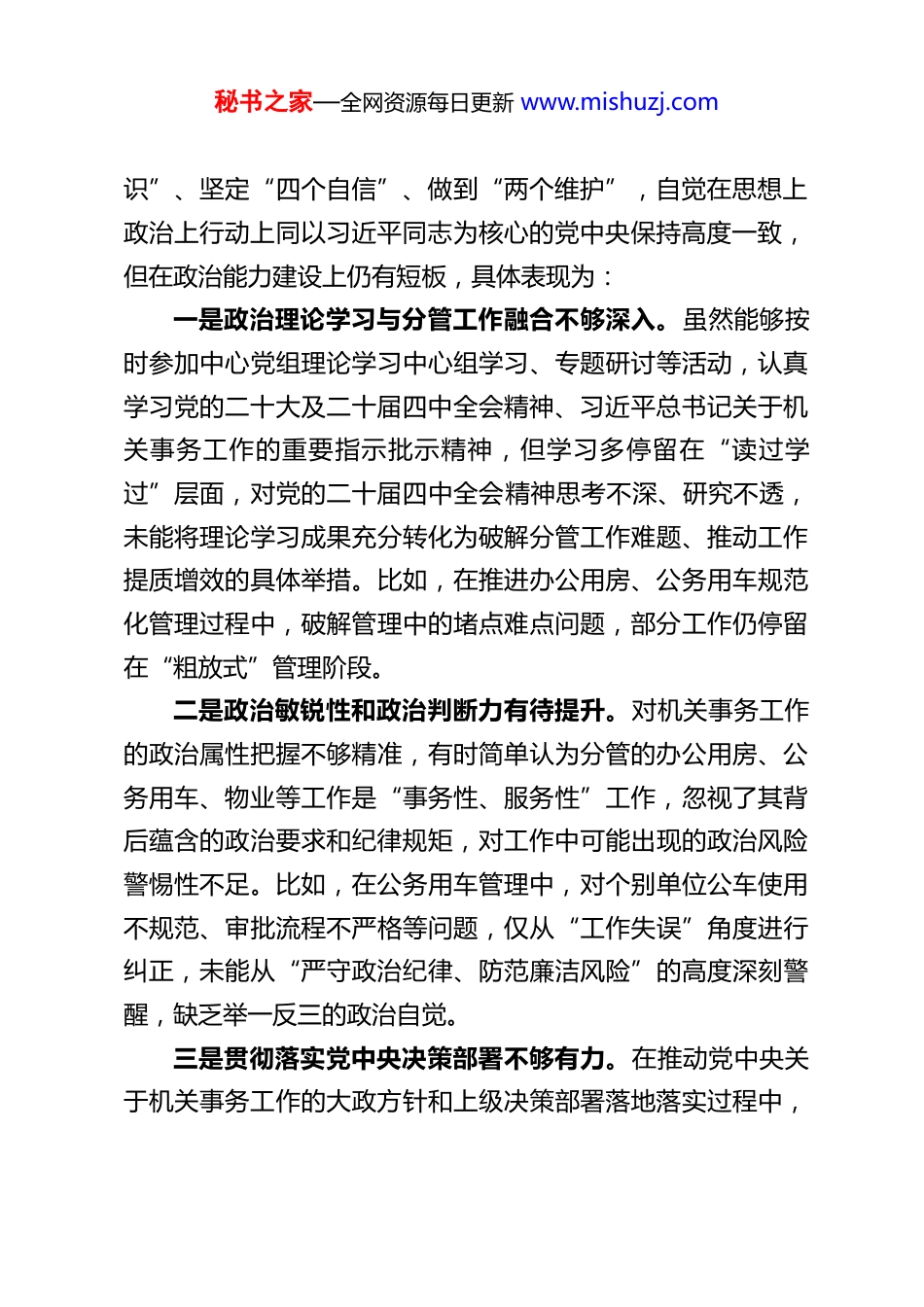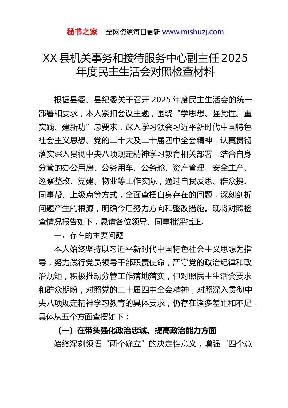 秘书之家—全网资源每日更新 www.mishuzj.comXX 县机关事务和接待服务中心副主任 2025年度民主生活会对照检查材料根据县委、县纪委关于召开 2025 年度民主生活会的统一部署和要求,本人紧扣会议主题,围绕“学思想、强党性、重实践、建新功”总要求,深入学习领会习近平新时代中国特色社会主义思想、党的二十大及二十届四中全会精神,认真贯彻落实深入贯彻中央八项规定精神学习教育相关部署,结合自身分管的办公用房、公务用车、公务舱、资产管理、安全生产、巡察整改、党建、物业等工作实际,通过自我反思、群众提、同事帮、上级点等方式,全面查摆自身存在的问题,深刻剖析问题产生的根源,明确今后努力方向和整改措施。现将对照检查情况报告如下,恳请各位领导、同事批评指正。一、存在的主要问题本人始终坚持以习近平新时代中国特色社会主义思想为指导,努力践行党员领导干部职责使命,严守党的政治纪律和政治规矩,积极推动分管工作落地落实,但对照民主生活会要求和群众期盼,对照党的二十届四中全会精神,对照深入贯彻中央八项规定精神学习教育的具体要求,仍存在诸多差距和不足,具体从五个方面查摆如下:(一)在带头强化政治忠诚、提高政治能力方面始终深刻领悟“两个确立”的决定性意义,增强“四个意秘书之家—全网资源每日更新 www.mishuzj.com识”、坚定“四个自信”、做到“两个维护”,自觉在思想上政治上行动上同以习近平同志为核心的党中央保持高度一致,但在政治能力建设上仍有短板,具体表现为:一是政治理论学习与分管工作融合不够深入。虽然能够按时参加中心党组理论学习中心组学习、专题研讨等活动,认真学习党的二十大及二十届四中全会精神、习近平总书记关于机关事务工作的重要指示批示精神,但学习多停留在“读过学过”层面,对党的二十届四中全会精神思考不深、研究不透,未能将理论学习成果充分转化为破解分管工作难题、推动工作提质增效的具体举措。比如,在推进办公用房、公务用车规范化管理过程中,破解管理中的堵点难点问题,部分工作仍停留在“粗放式”管理阶段。二是政治敏锐性和政治判断力有待提升。对机关事务工作的政治属性把握不够精准,有时简单认为分管的办公用房、公务用车、物业等工作是“事务性、服务性”工作,忽视了其背后蕴含的政治要求和纪律规矩,对工作中可能出现的政治风险警惕性不足。比如,在公务用车管理中,对个别单位公车使用不规范、审批流程不严格等问题,仅从“工作失误”角度进行纠正,未能从“严守政治纪律、防范廉洁风险”的高度深刻警醒,缺乏举一反三的政治自觉。三是贯彻落实党中央决策部署不够有力。在推动党中央关于机关事务工作的大政方针和上级决策部署落地落实过程中,秘书之家—全网资源每日更新 www.mishuzj.com有时存在“等靠要”思想,主动担当、积极作为不够,对一些难度较大、涉及多部门协调的工作,缺乏“钉钉子”精神,推进力度不够、成效不够明显。比如,在推进公务用车节能降耗、办公用房资源集约利用等工作中,虽然制定了相关措施,但督促检查不够严格,部分措施未能真正落地见效,资源利用效率仍有提升空间。同时,在深入贯彻中央八项规定精神学习教育中,对相关部署要求的落实不够细致,存在重形式、轻实效的倾向。(二)在带头固本培元、增强党性方面坚持把政治修养摆在党性修养的首位,自觉以习近平新时代中国特色社会主义思想凝心铸魂,坚守共产党人精神追求,但在党性修养锤炼上仍需加强,具体表现为:一是理想信念根基不够牢固。虽然能够坚定理想信念,自觉践行共产党人的初心使命,但在面对繁杂的日常事务和各种困难挑战时,有时会出现思想松懈、精神懈怠的情况,对理想信念的坚守不够坚定,未能始终以饱满的热情和昂扬的斗志投入到工作中。比如,在推进巡察整改、安全生产等难度较大的工作中,当遇到阻力和困难时,有时会产生“畏难情绪”,缺乏攻坚克难的勇气和决心,反映出理想信念根基仍需进一步夯实。二是党性锻炼不够经常。对党性修养的重要性认识不够深刻,未能将党性锻炼融入日常工作和生活的方方面面,参加组秘书之家—全网资源每日更新 www.mishuzj.com织生活时,有时...