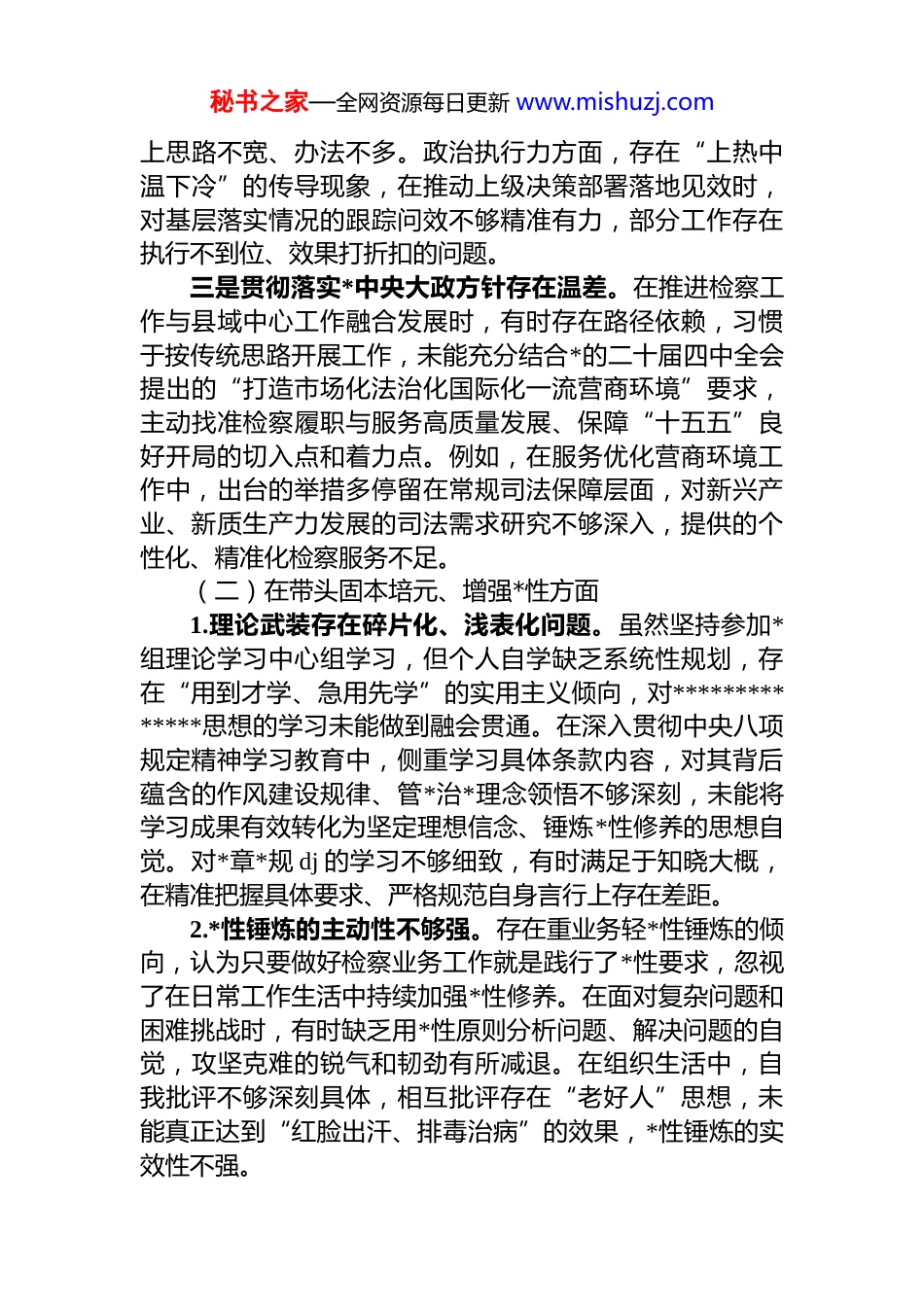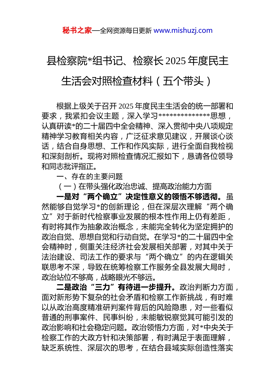 秘书之家—全网资源每日更新 www.mishuzj.com县检察院*组书记、检察长 2025 年度民主生活会对照检查材料(五个带头)根据上级关于召开 2025 年度民主生活会的统一部署和要求,我紧扣会议主题,深入学习**************思想,认真研读*的二十届四中全会精神、深入贯彻中央八项规定精神学习教育相关内容,广泛征求意见建议,开展谈心谈话,结合自身思想、工作和作风实际,进行全面自我检视和深刻剖析。现将对照检查情况汇报如下,恳请各位领导和同志批评指正。一、存在的主要问题(一)在带头强化政治忠诚、提高政治能力方面一是对“两个确立”决定性意义的领悟不够透彻。虽然能够自觉学习*的创新理论,但在深层次理解“两个确立”对于新时代检察事业发展的根本性作用上仍有差距,有时将其作为抽象政治概念,未能完全转化为坚定拥护的政治自觉、思想自觉和行动自觉。在学习*的二十届四中全会精神时,侧重关注经济社会发展相关部署,对其中关于法治建设、司法工作的要求与“两个确立”的内在逻辑关联思考不深,导致在统筹检察工作服务全县发展大局时,政治站位不够高,战略眼光不够远。二是政治“三力”有待进一步提升。政治判断力方面,面对新形势下复杂的社会矛盾和检察工作新挑战,有时难以从政治高度精准研判案件背后的风险隐患,对一些看似普通的刑事案件、民事纠纷,未能敏锐察觉其可能引发的政治影响和社会稳定问题。政治领悟力方面,对*中央关于检察工作的大政方针和决策部署,有时满足于表面理解,缺乏系统性、深层次的思考,在结合县域实际创造性落实秘书之家—全网资源每日更新 www.mishuzj.com上思路不宽、办法不多。政治执行力方面,存在“上热中温下冷”的传导现象,在推动上级决策部署落地见效时,对基层落实情况的跟踪问效不够精准有力,部分工作存在执行不到位、效果打折扣的问题。三是贯彻落实*中央大政方针存在温差。在推进检察工作与县域中心工作融合发展时,有时存在路径依赖,习惯于按传统思路开展工作,未能充分结合*的二十届四中全会提出的“打造市场化法治化国际化一流营商环境”要求,主动找准检察履职与服务高质量发展、保障“十五五”良好开局的切入点和着力点。例如,在服务优化营商环境工作中,出台的举措多停留在常规司法保障层面,对新兴产业、新质生产力发展的司法需求研究不够深入,提供的个性化、精准化检察服务不足。(二)在带头固本培元、增强*性方面1.理论武装存在碎片化、浅表化问题。虽然坚持参加*组理论学习中心组学习,但个人自学缺乏系统性规划,存在“用到才学、急用先学”的实用主义倾向,对**************思想的学习未能做到融会贯通。在深入贯彻中央八项规定精神学习教育中,侧重学习具体条款内容,对其背后蕴含的作风建设规律、管*治*理念领悟不够深刻,未能将学习成果有效转化为坚定理想信念、锤炼*性修养的思想自觉。对*章*规 dj 的学习不够细致,有时满足于知晓大概,在精准把握具体要求、严格规范自身言行上存在差距。2.*性锤炼的主动性不够强。存在重业务轻*性锤炼的倾向,认为只要做好检察业务工作就是践行了*性要求,忽视了在日常工作生活中持续加强*性修养。在面对复杂问题和困难挑战时,有时缺乏用*性原则分析问题、解决问题的自觉,攻坚克难的锐气和韧劲有所减退。在组织生活中,自我批评不够深刻具体,相互批评存在“老好人”思想,未能真正达到“红脸出汗、排毒治病”的效果,*性锤炼的实效性不强。秘书之家—全网资源每日更新 www.mishuzj.com3.为民情怀的深度和温度不足。虽然始终强调以人民为中心的发展思想,但在具体工作中,对群众急难愁盼问题的感知不够敏锐,深入基层了解群众司法需求的主动性不够。例如,在推进检察公开听证、司法救助等工作时,更多关注程序规范,对群众的感受和体验考虑不够周全,部分工作流程不够便捷高效,未能完全实现“让数据多跑路群众少跑腿”的目标,厚植为民情怀的实际举措有待进一步细化。(三)在带头敬畏人民、敬畏组织、敬畏法纪方面1.践行新时代群众路线不够扎实。落实“四下基层”制度不够到位,存在“走马观花”式调研现象,深入乡镇、社区、企业开展沉浸式调研的次...