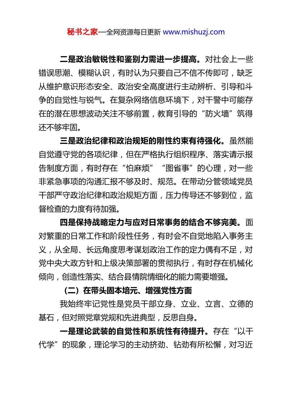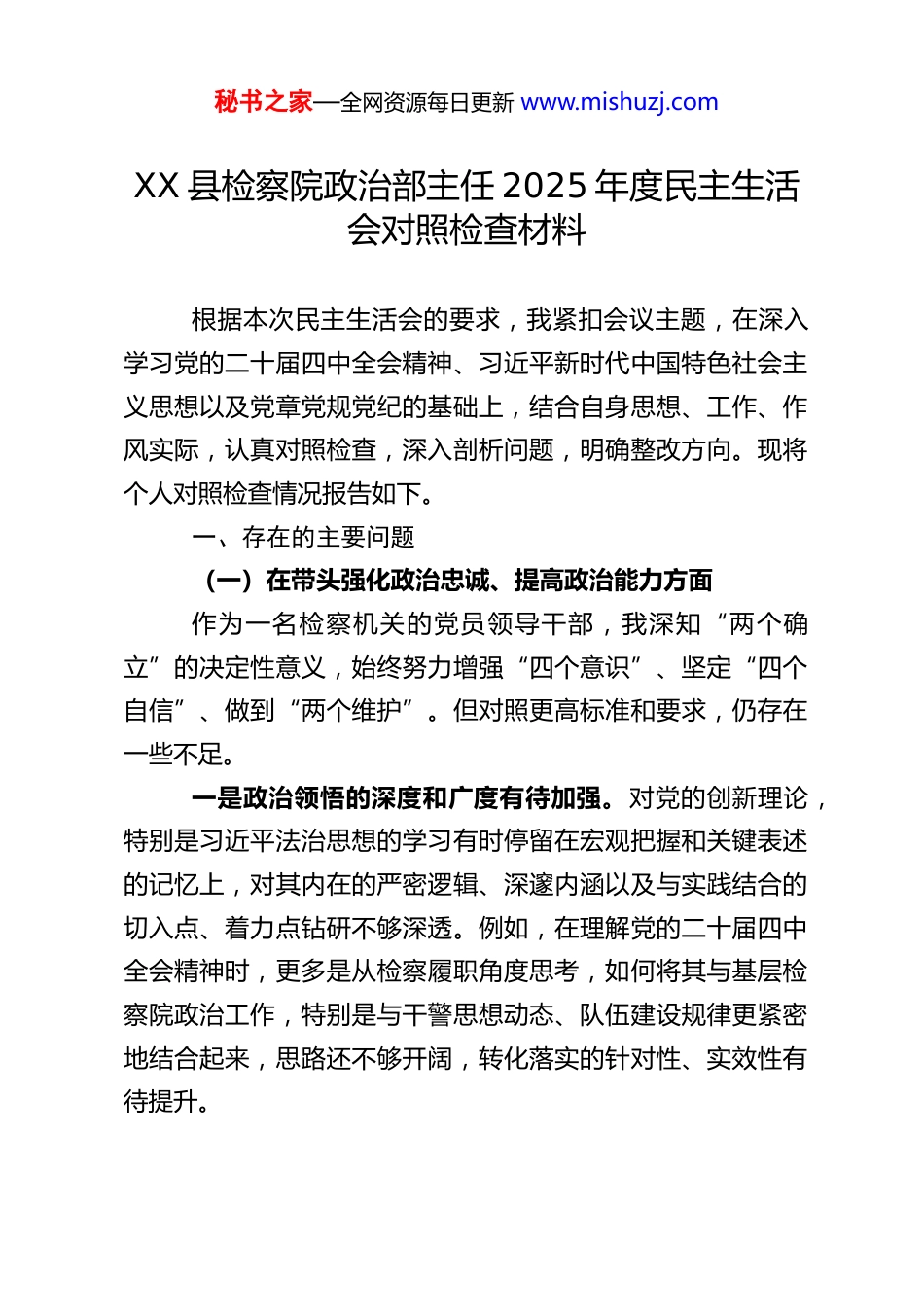 秘书之家—全网资源每日更新 www.mishuzj.comXX 县检察院政治部主任 2025 年度民主生活会对照检查材料根据本次民主生活会的要求,我紧扣会议主题,在深入学习党的二十届四中全会精神、习近平新时代中国特色社会主义思想以及党章党规党纪的基础上,结合自身思想、工作、作风实际,认真对照检查,深入剖析问题,明确整改方向。现将个人对照检查情况报告如下。一、存在的主要问题(一)在带头强化政治忠诚、提高政治能力方面作为一名检察机关的党员领导干部,我深知“两个确立”的决定性意义,始终努力增强“四个意识”、坚定“四个自信”、做到“两个维护”。但对照更高标准和要求,仍存在一些不足。一是政治领悟的深度和广度有待加强。对党的创新理论,特别是习近平法治思想的学习有时停留在宏观把握和关键表述的记忆上,对其内在的严密逻辑、深邃内涵以及与实践结合的切入点、着力点钻研不够深透。例如,在理解党的二十届四中全会精神时,更多是从检察履职角度思考,如何将其与基层检察院政治工作,特别是与干警思想动态、队伍建设规律更紧密地结合起来,思路还不够开阔,转化落实的针对性、实效性有待提升。秘书之家—全网资源每日更新 www.mishuzj.com二是政治敏锐性和鉴别力需进一步提高。对社会上一些错误思潮、模糊认识,有时认为只要自己不信不传即可,缺乏从维护意识形态安全、政治安全高度进行主动辨析、引导和斗争的自觉性与锐气。在复杂网络信息环境下,对干警中可能存在的潜在思想波动关注不够前置,教育引导的“防火墙”筑得还不够牢固。三是政治纪律和政治规矩的刚性约束有待强化。虽然能自觉遵守党的各项纪律,但在严格执行组织程序、落实请示报告制度方面,有时存在“怕麻烦”“图省事”的心理,对一些非紧急事项的沟通汇报不够及时、规范。在带动分管领域党员干部严守政治纪律和政治规矩方面,压力传导还不够到位,监督检查的力度有待加强。四是保持战略定力与应对日常事务的结合不够完美。面对繁重的日常工作和阶段性任务,有时会不自觉地陷入事务主义,从全局、长远角度思考谋划政治工作的定力偶有不足,对党中央大政方针和上级决策部署的贯彻执行,有时存在机械化倾向,创造性落实、结合县情院情细化的能力需要增强。(二)在带头固本培元、增强党性方面我始终牢记党性是党员干部立身、立业、立言、立德的基石,但对照党章党规和先进典型,反思自身。一是理论武装的自觉性和系统性有待提升。存在“以干代学”的现象,理论学习的主动挤劲、钻劲有所松懈,对习近秘书之家—全网资源每日更新 www.mishuzj.com平新时代中国特色社会主义思想的学习,有时满足于中心组安排和集体学习,个人静下心来研读原著、深入思考的时间相对不足,运用党的创新理论改造主观世界、解决党性修养方面深层次问题的效果不够显著。二是党性锤炼的主动性不够强。随着工作阅历增加,有时不自觉地放松了对党性修养的持续锤炼,艰苦奋斗、自我革命的精神有所弱化。运用批评与自我批评武器不够经常、不够有力,在组织生活会上,有时对自身问题深挖不够,对同志的批评也存在“蜻蜓点水”、顾及情面的情况,未能完全达到“红脸出汗、排毒治病”的效果。三是理想信念的根基需持续加固。能够坚定共产主义远大理想和中国特色社会主义共同理想,但在面对现实生活中的一些复杂情况和负面现象时,有时会产生困惑感,需要用更强大的理论武装和更坚定的信仰来驱散迷雾。在引导青年干警筑牢信仰之基方面,方式方法有时较为传统,吸引力和感染力有待增强。四是宗旨意识融入血脉、见诸行动有差距。虽然主观上坚持司法为民,但在具体工作中,深入基层一线、直面群众急难愁盼问题的频率和深度还不够。有时忙于机关事务,通过电话、报表了解情况多,真正“蹲下去”解剖麻雀、倾听群众原汁原味呼声的时候少,导致一些政治工作措施与群众的真实感受和期待存在偏差。秘书之家—全网资源每日更新 www.mishuzj.com(三)在带头敬畏人民、敬畏组织、敬畏法纪方面我深知“三个敬畏”是党员干部的基本政治品格,对照检查,主要存在。一是践行群众路线的深度有待拓展。虽然能够落实“四下基层”制度,但有时下基...