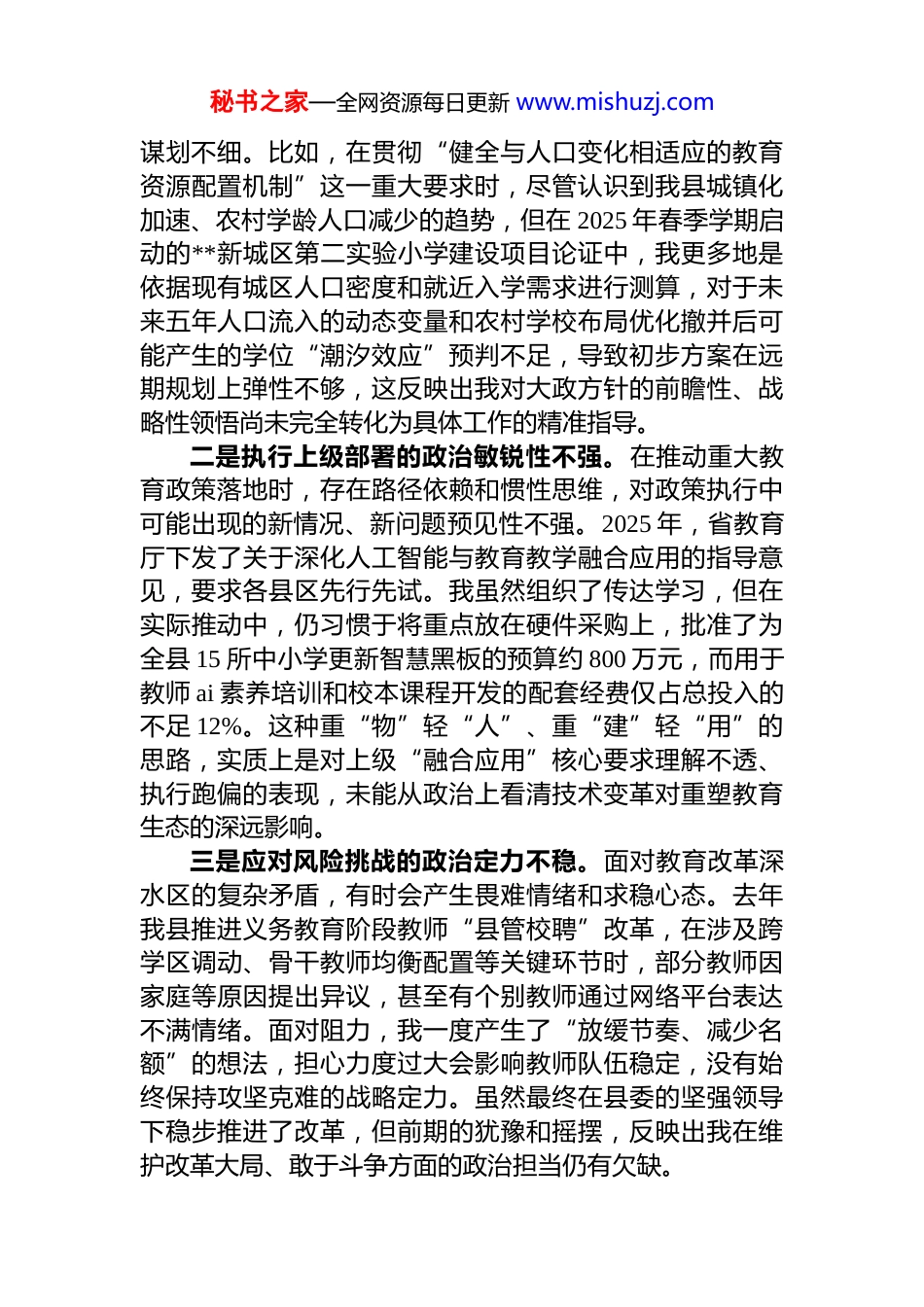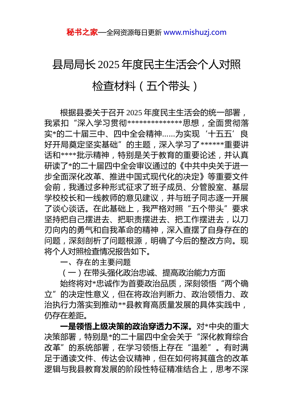 秘书之家—全网资源每日更新 www.mishuzj.com县局局长 2025 年度民主生活会个人对照检查材料(五个带头)根据县委关于召开 2025 年度民主生活会的统一部署,我紧扣“深入学习贯彻**************思想,全面贯彻落实*的二十届三中、四中全会精神……为实现‘十五五’良好开局奠定坚实基础”的主题,深入学习了******重要讲话和****批示精神,特别是关于教育的重要论述,并认真研读了*的二十届四中全会审议通过的《中共中央关于进一步全面深化改革、推进中国式现代化的决定》等重要文件会前,我通过多种形式征求了班子成员、分管股室、基层学校校长和一线教师的意见建议,并与班子同志逐一开展了谈心谈话。在此基础上,我严格对照“五个带头”要求坚持把自己摆进去、把职责摆进去、把工作摆进去,以刀刃向内的勇气和自我革命的精神,深入查摆了自身存在的问题,深刻剖析了问题根源,明确了今后的整改方向。现将个人对照检查情况报告如下。一、存在的主要问题(一)在带头强化政治忠诚、提高政治能力方面始终将对*忠诚作为首要政治品质,深刻领悟“两个确立”的决定性意义,但在将政治判断力、政治领悟力、政治执行力落实到推动**县教育高质量发展的具体实践中,仍存在差距。一是领悟上级决策的政治穿透力不深。对*中央的重大决策部署,特别是*的二十届四中全会关于“深化教育综合改革”的系统部署,在学习领悟上存在“温差”。有时满足于通读文件、传达会议精神,但在如何将其蕴含的改革逻辑与我县教育发展的阶段性特征精准结合上,思考不深秘书之家—全网资源每日更新 www.mishuzj.com谋划不细。比如,在贯彻“健全与人口变化相适应的教育资源配置机制”这一重大要求时,尽管认识到我县城镇化加速、农村学龄人口减少的趋势,但在 2025 年春季学期启动的**新城区第二实验小学建设项目论证中,我更多地是依据现有城区人口密度和就近入学需求进行测算,对于未来五年人口流入的动态变量和农村学校布局优化撤并后可能产生的学位“潮汐效应”预判不足,导致初步方案在远期规划上弹性不够,这反映出我对大政方针的前瞻性、战略性领悟尚未完全转化为具体工作的精准指导。二是执行上级部署的政治敏锐性不强。在推动重大教育政策落地时,存在路径依赖和惯性思维,对政策执行中可能出现的新情况、新问题预见性不强。2025 年,省教育厅下发了关于深化人工智能与教育教学融合应用的指导意见,要求各县区先行先试。我虽然组织了传达学习,但在实际推动中,仍习惯于将重点放在硬件采购上,批准了为全县 15 所中小学更新智慧黑板的预算约 800 万元,而用于教师 ai 素养培训和校本课程开发的配套经费仅占总投入的不足 12%。这种重“物”轻“人”、重“建”轻“用”的思路,实质上是对上级“融合应用”核心要求理解不透、执行跑偏的表现,未能从政治上看清技术变革对重塑教育生态的深远影响。三是应对风险挑战的政治定力不稳。面对教育改革深水区的复杂矛盾,有时会产生畏难情绪和求稳心态。去年我县推进义务教育阶段教师“县管校聘”改革,在涉及跨学区调动、骨干教师均衡配置等关键环节时,部分教师因家庭等原因提出异议,甚至有个别教师通过网络平台表达不满情绪。面对阻力,我一度产生了“放缓节奏、减少名额”的想法,担心力度过大会影响教师队伍稳定,没有始终保持攻坚克难的战略定力。虽然最终在县委的坚强领导下稳步推进了改革,但前期的犹豫和摇摆,反映出我在维护改革大局、敢于斗争方面的政治担当仍有欠缺。秘书之家—全网资源每日更新 www.mishuzj.com(二)在带头固本培元、增强*性方面坚持用**************思想凝心铸魂,注重加强*性锻炼,但在理论学习与思想改造的深度融合、知行合一上做得不彻底。一是理论学习的“内化”功夫不扎实。存在“学用脱节”现象,对*的创新理论学习有时停留在“读过了”“学过了”的层面,未能完全转化为改造主观世界和指导客观实践的强大思想武器。比如,在 2025 年第四季度的*组理论学习中心组学习中,我们专题学习了******关于作风建设和中央八项规定精神的重要论述。我在发言中谈了认识、讲了体会,但对照检查,我并未能将学习成果立...
